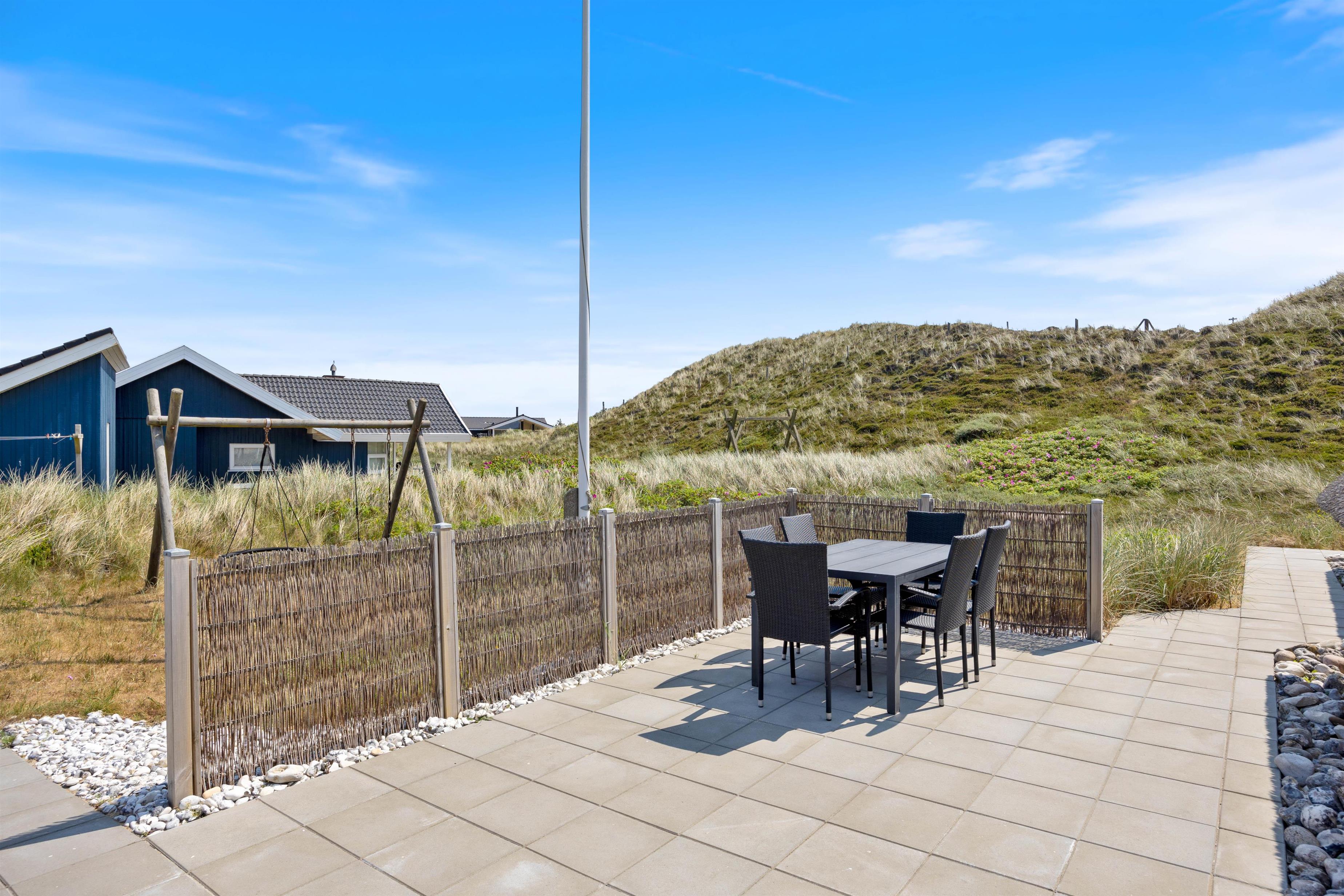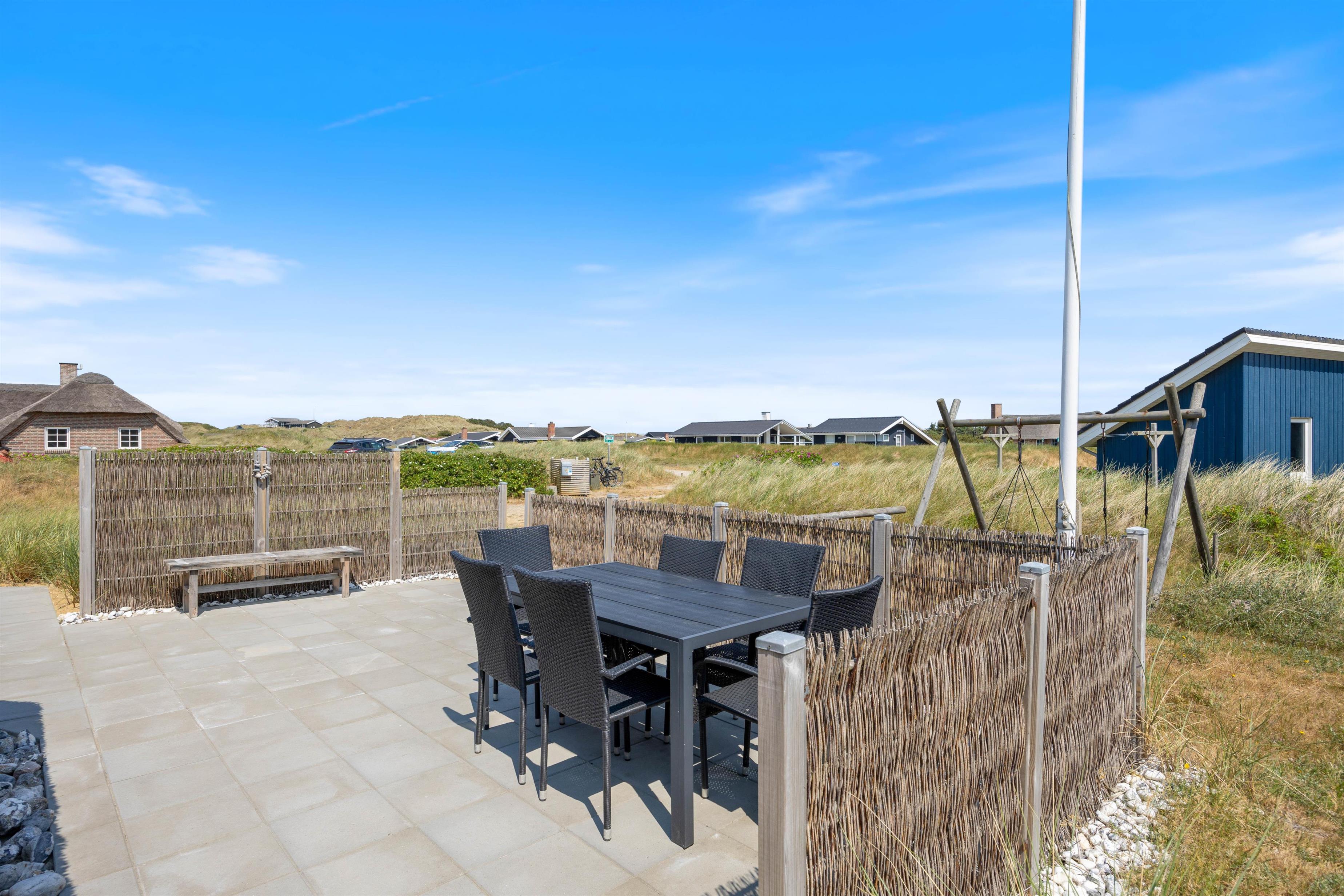 Vi kan ikke garantere, at vinden ikke lister rundt om et hushjørne og kilder med lidt strandsand, men til gengæld kan vi love, at I kan ligge på den skønne syd-vest-vendte terrasse og nyde duften af både hav og lyngbevoksningen samt lyden af bølgerne, der slår mod stranden. Og rigtig hyggelig feriestemning kommer op, når vejret spiller med og man allerede kan nyde morgenkaffen på terrassen – på den østvendte med morgensol naturligvis, imens børnene tager dagens første tur på husets gynger.