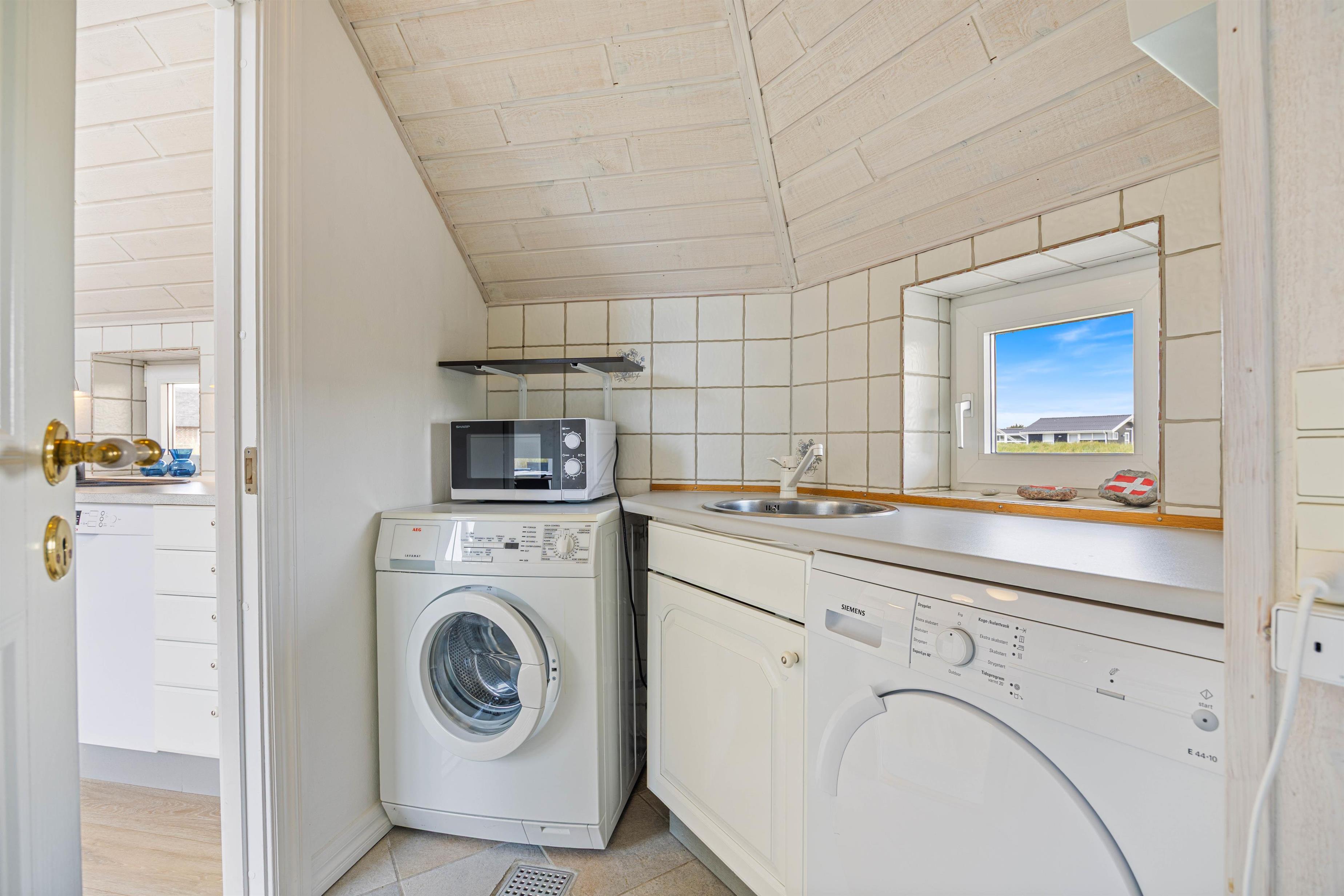 Nyd udsigten til de lyng- og marehalm beklædte klitter gennem to store flotte vinduespartier i henholdsvis den hyggelige stue og det fine køkken, hvor det flotte spisebord står på 1. parket - lige under glaspartiet. De to rum ligger i åben forlængelse af hinanden, og fra køkkenet er der dertil adgang til en praktisk baggang med både vaskemaskine og tørretumbler.