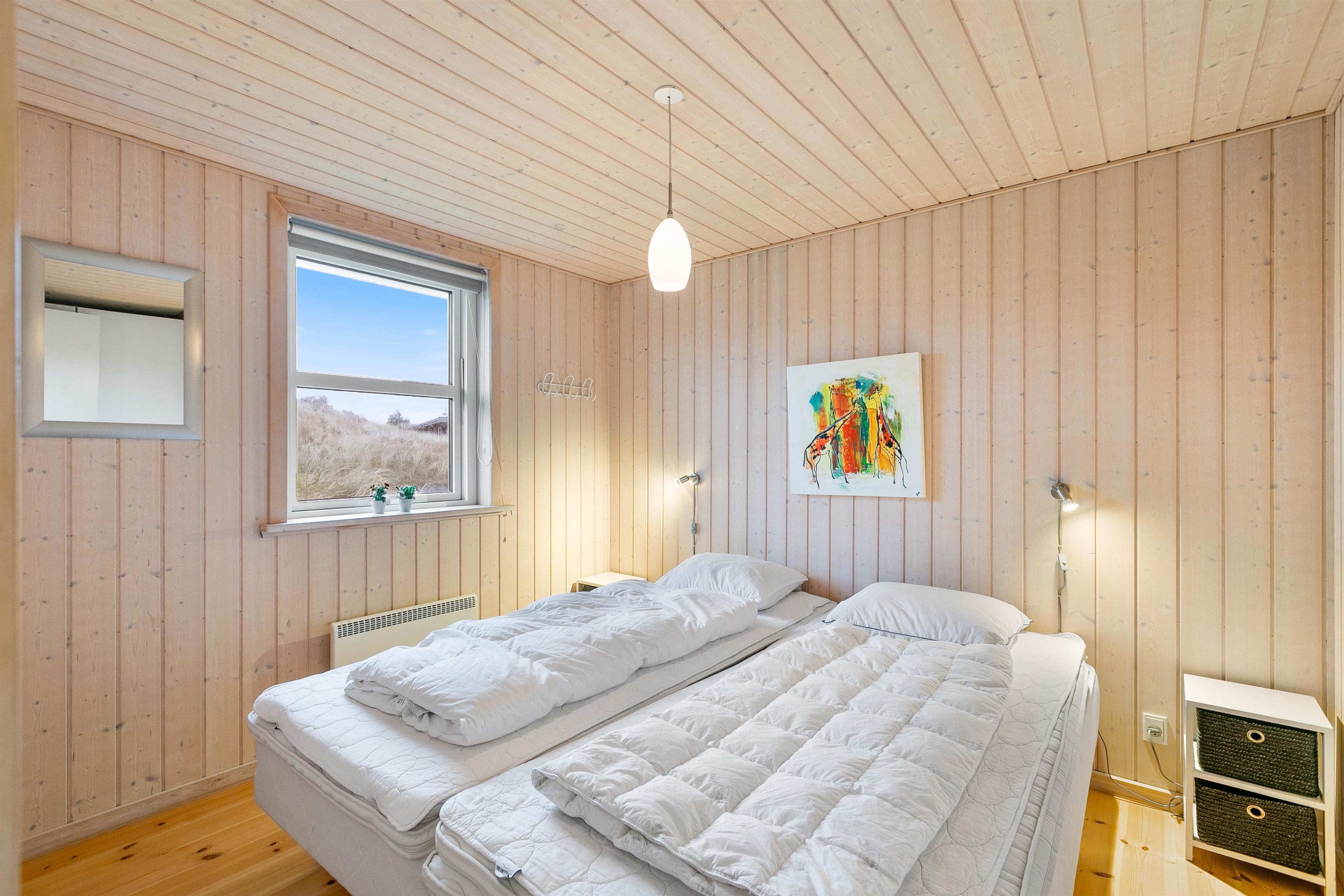 Et rigtigt godt og hyggeligt sommerhus på 74 m2, der er lyse trægulve i hele huset, undtaget er badeværelset, hvor der er fliser. Der er 2 soveværelser, begge med dobbelt senge. Derudover er der en sovesofa til 2 personer placeret i husets alkove, som ligger i det nordvestlige hjørne af stuen og huset. Badeværelset er lækkert, der er en god bruseniche og der er gulvvarme. Køkkenet og stuen er sammenhængende og er placeret i husets vestlige del, hvor der er flotte vinduespartier, der også er med til sørge for et dejligt lysindfald. Stuen er smagfuldt indrettet, den hyggelige brændeovn både varmer og skaber hygge, der er et fladskærms-TV og en DVD. Den energibesparende varmepumpe kan desuden bruges som Aircondition på varme dage.