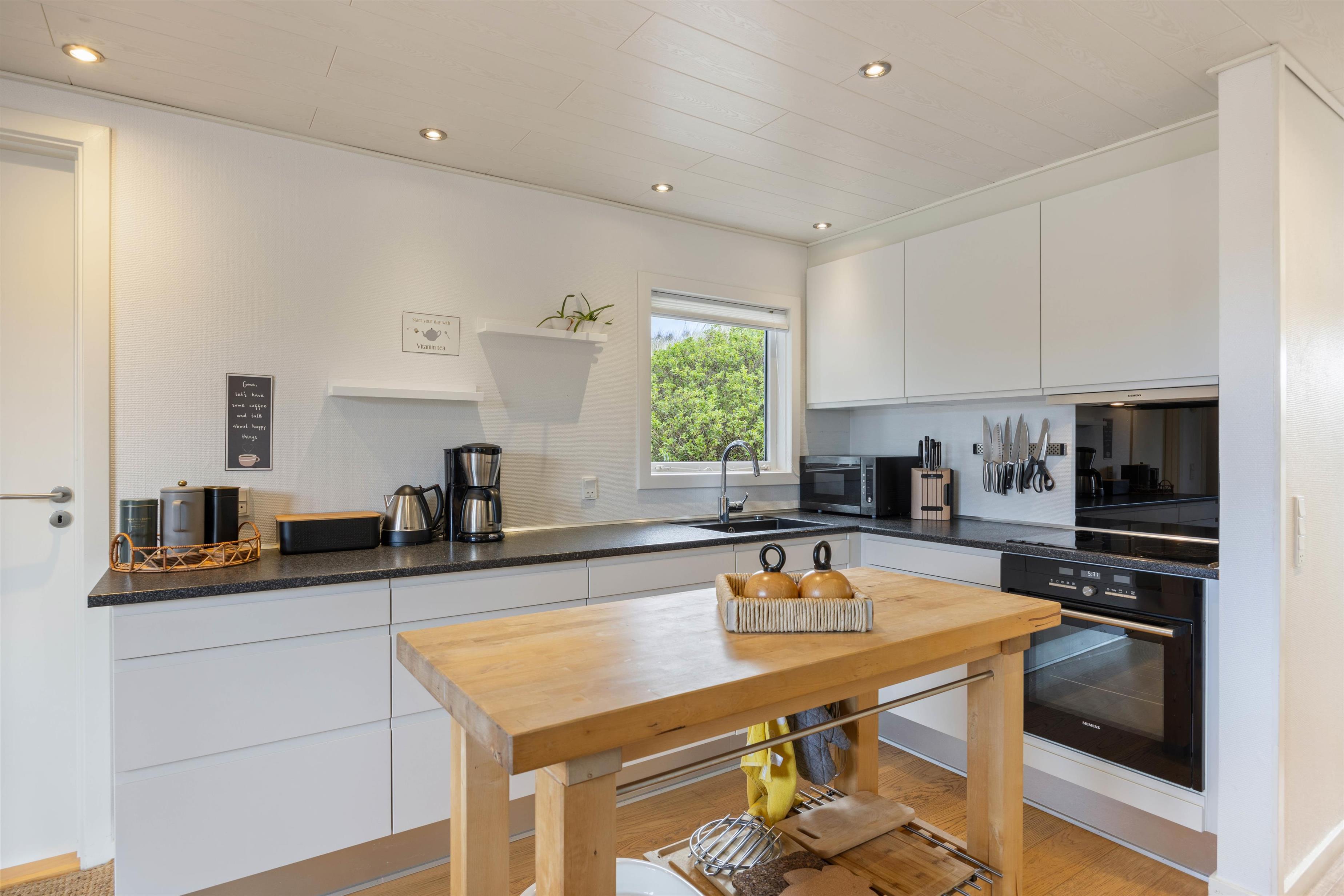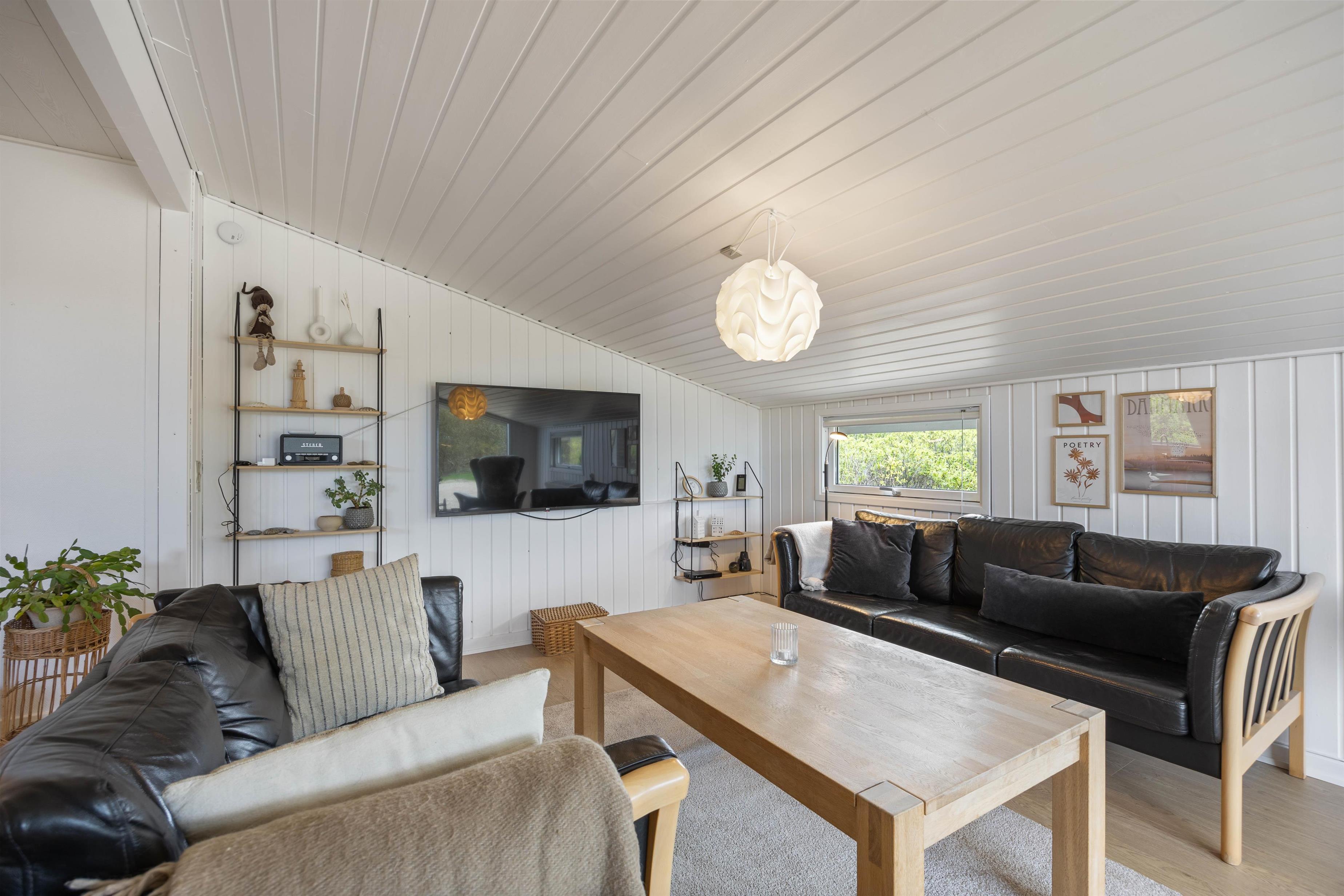 Det moderne køkken er udstyret med opvaskemaskine, så oprydningen efter madlavningen hurtigt er overstået, og stuen er indrettet med komfortable sofaer og lænestole, så I kan sætte jer godt til rette foran tv’et til en hyggelig filmaften med popcorn og snolder.
