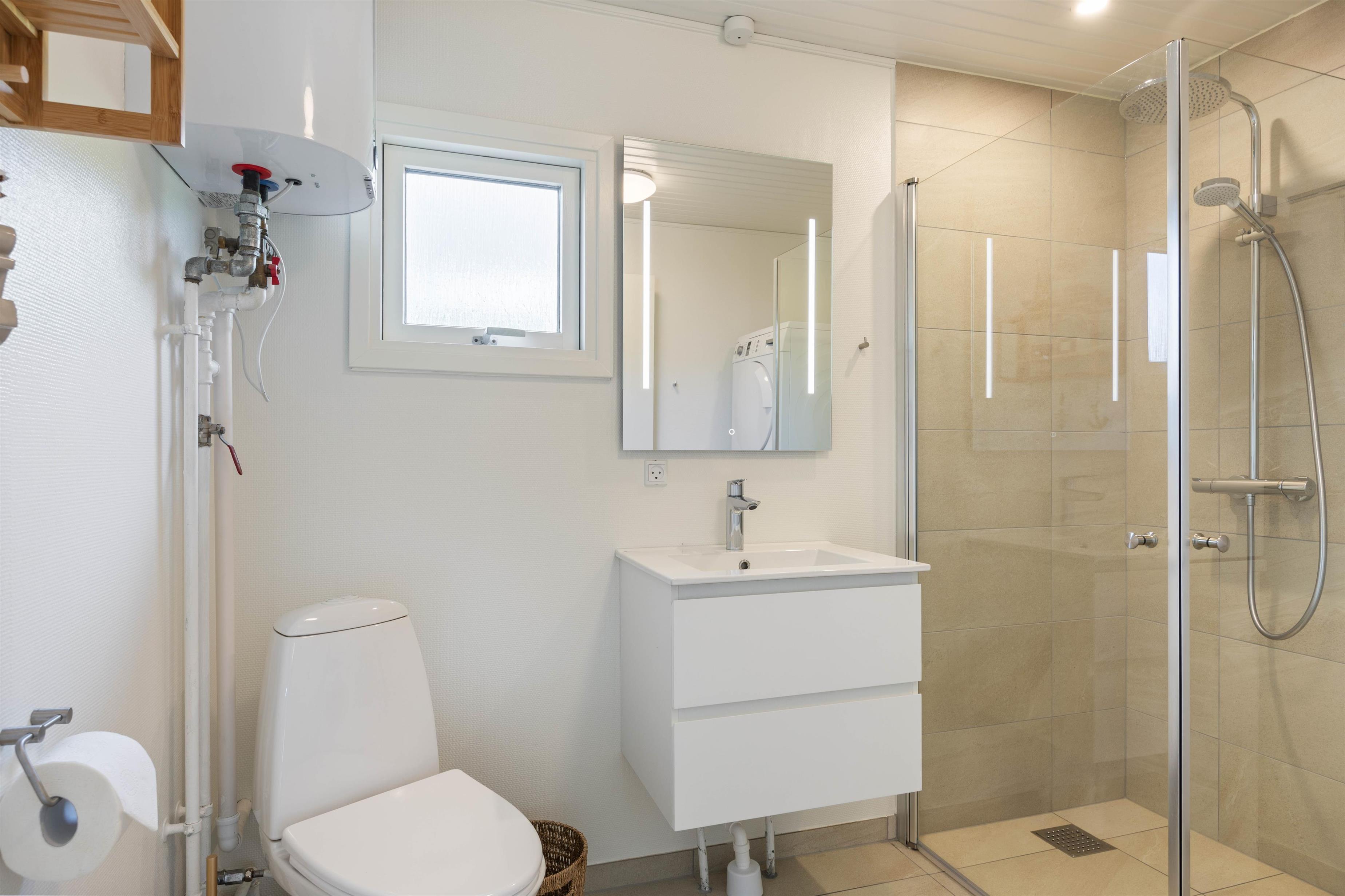 Feriehusets badeværelse er nyt fra 2024 og har en brusekabine, gulvvarme samt en praktisk vaskesøjle. Blandt sommerhusets faciliteter er også en energibesparende varmepumpe, så I til enhver tid er sikret et behageligt rumklima. De små niveauforskelle fra køkkenet og ned til stuen og hen til soveværelset, skaber noget dybde og giver karakter til hyggelige hus.