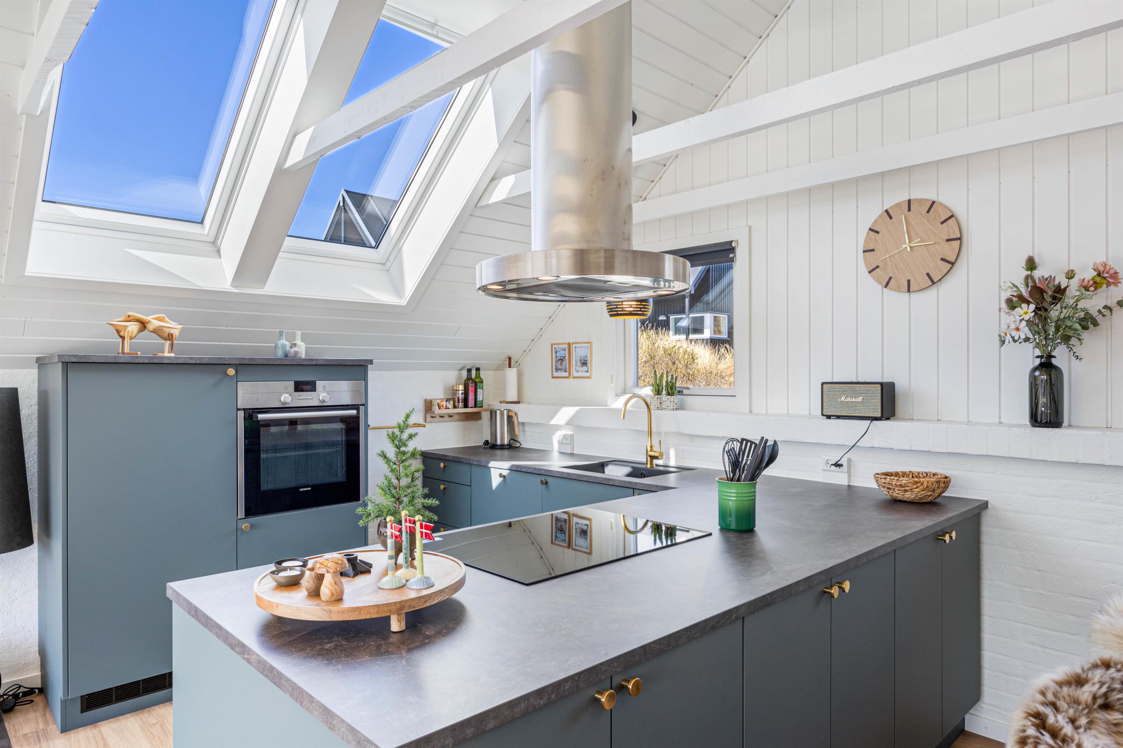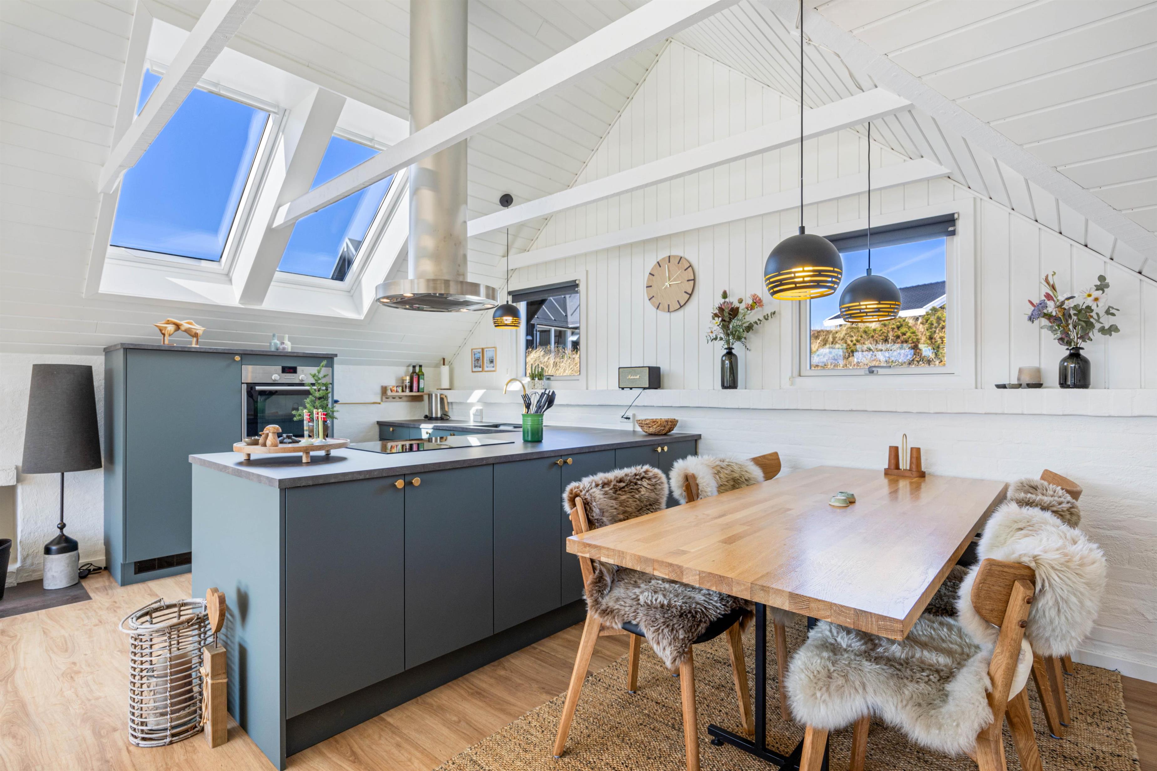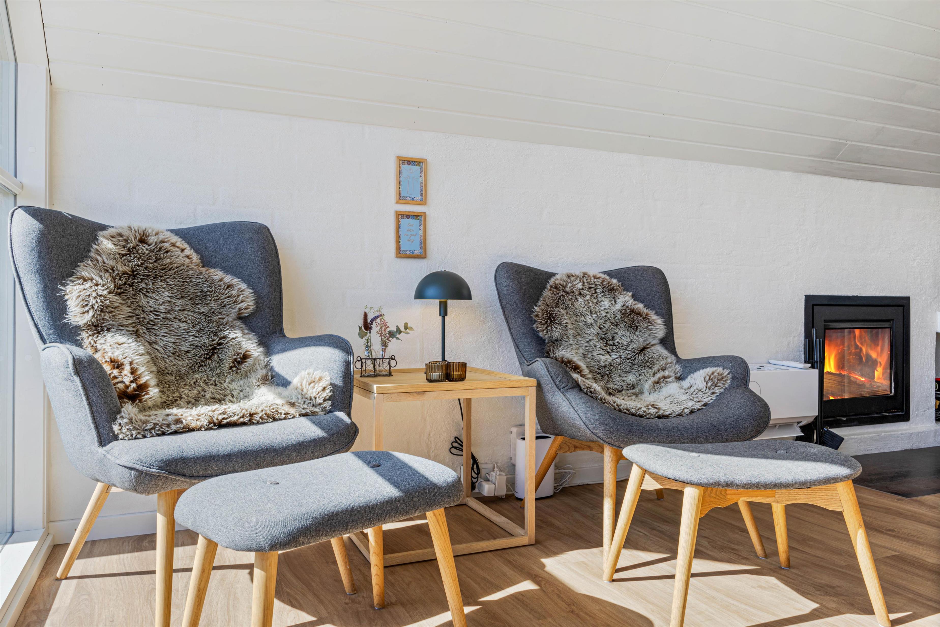 I stuen, som ved renoveringen i 2020 er blevet udvidet, er der trægulv og loft til kip med synlige bjælker, en flot indbygget brændeovn og TV. Der er desuden gratis trådløst internet, som er både hurtigt og stabilt, så alle har mulighed for at være online.