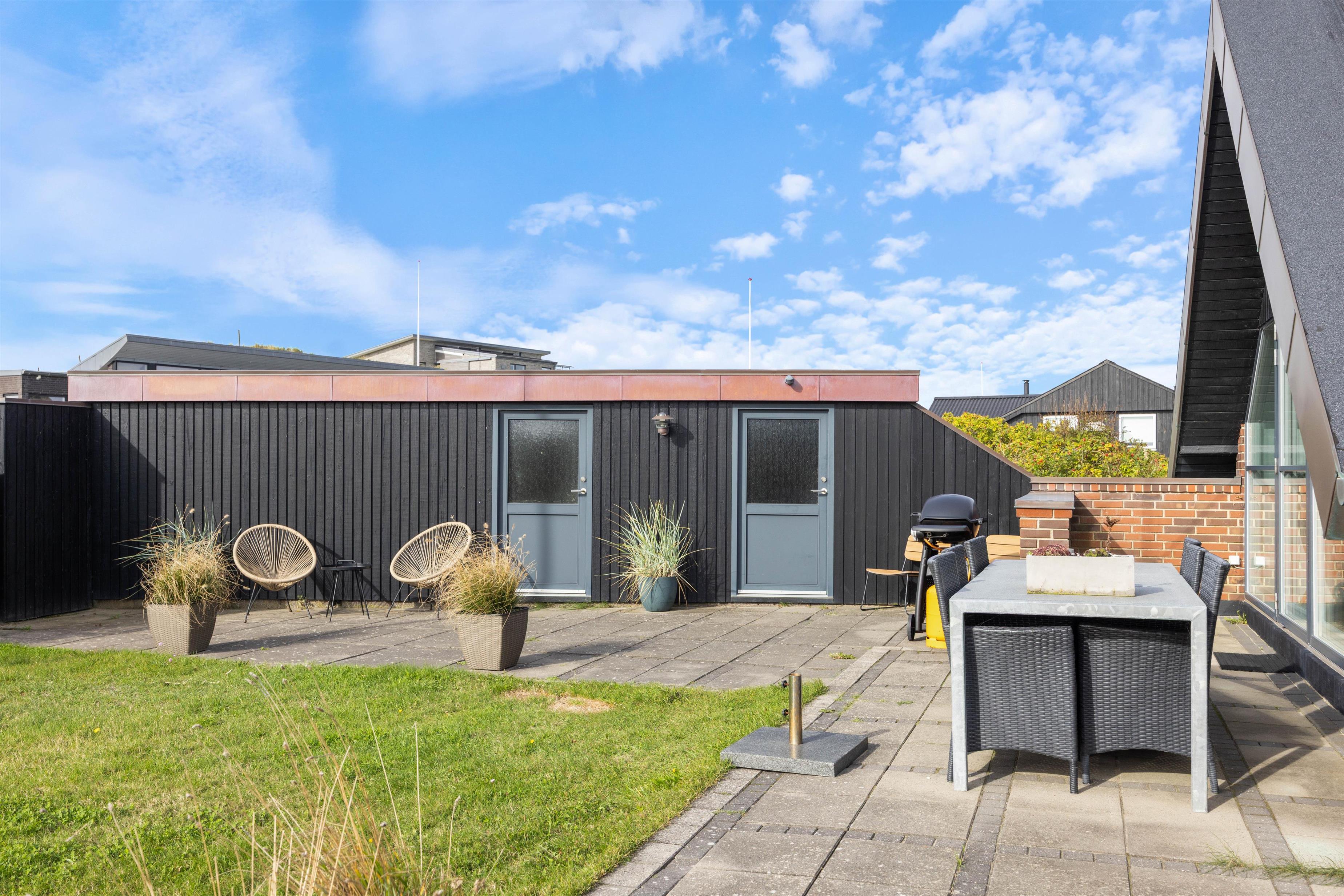 Der er en skøn sydvendt terrasse, som er delvist afskærmet. Her kan I ganske ugeneret nyde den friske luft, og på de solrige dage er liggestole-spottet på græsplænen det perfekte sted at opholde sig! Grunden er desuden ideel, hvis I har børn med - her kan de lege og spille bold dagen lang, mens I ser til fra terrassen.