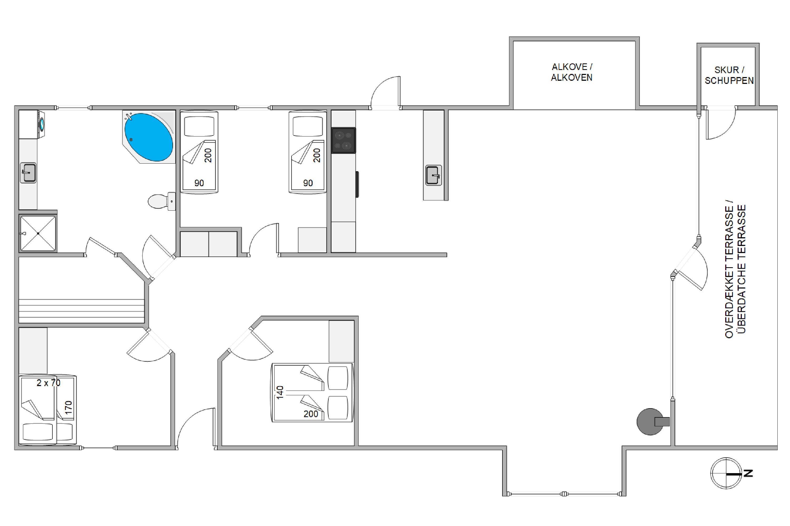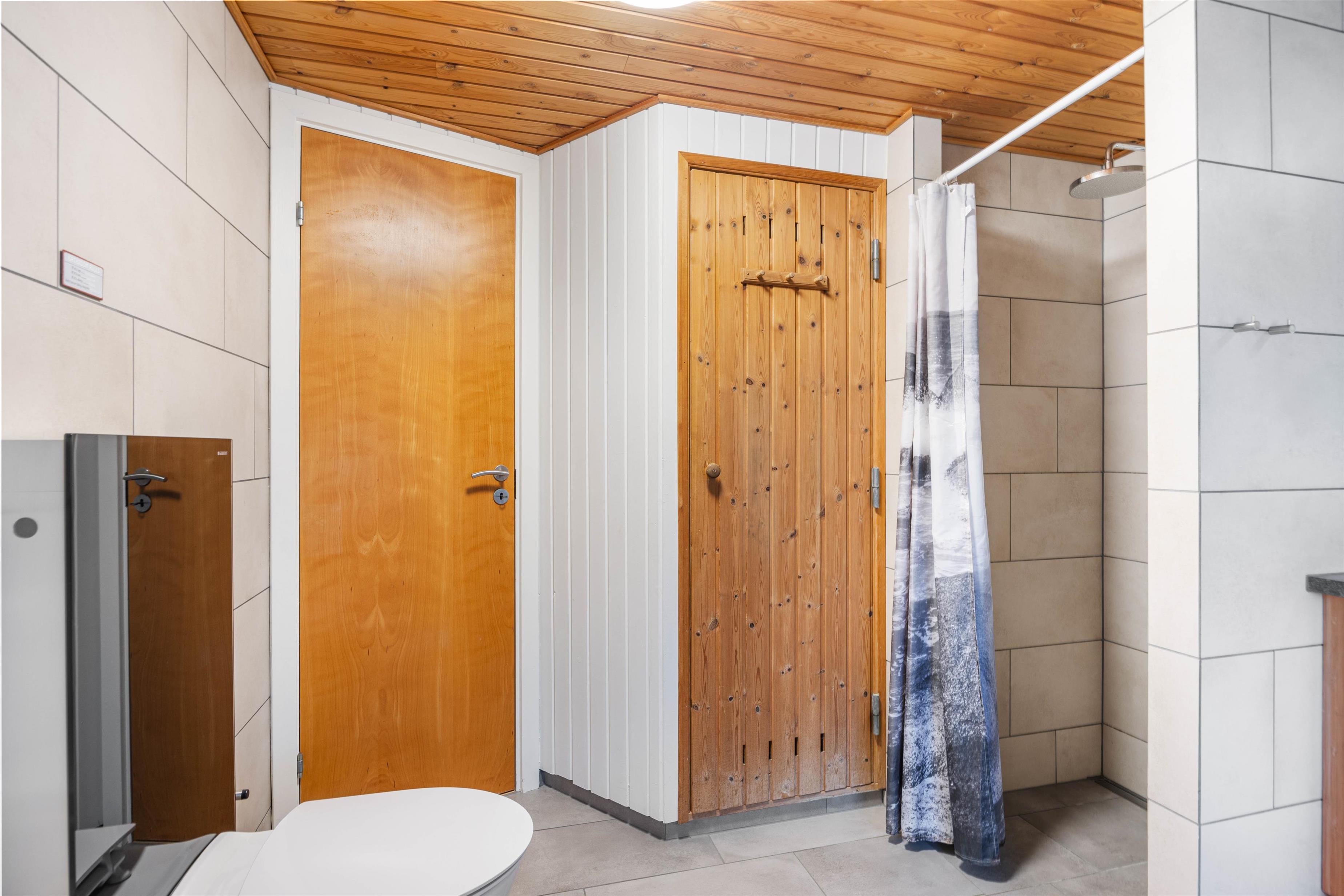 For yderligere afslapning, finder I på badeværelset sauna og spabad, hvor I kan slappe helt af efter en begivenhedsrig feriedag i den Vestjyske natur. Badeværelset er ydermere udstyret med gulvvarme, som sikrer at I ikke skal bekymre jer om kolde fødder her.
