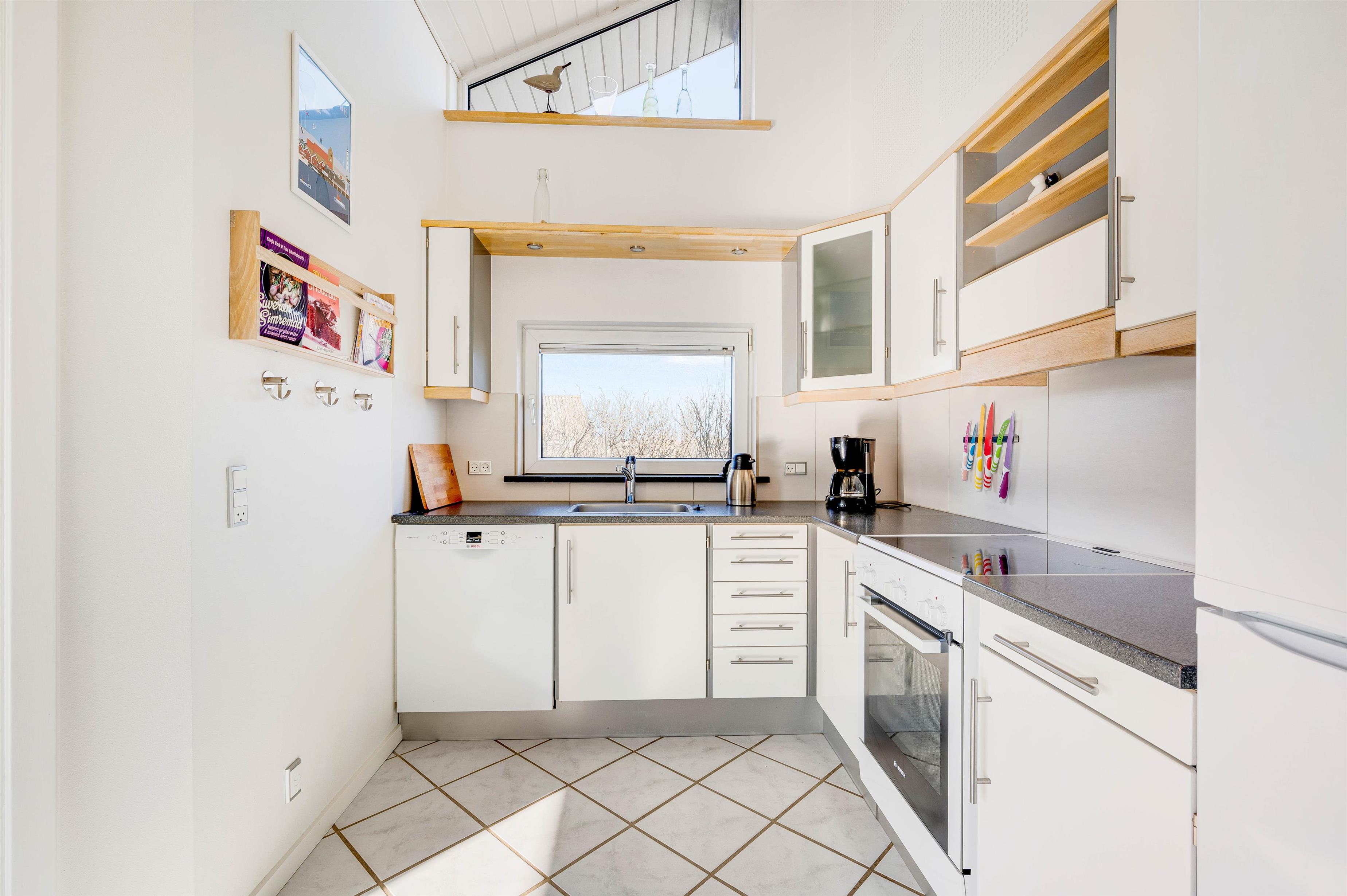 Spisekrog ligger i åben forbindelse med det pæne og praktiske køkken, der godt udstyret med blandt andet køleskab med fryser på 40 liter, opvaskemaskine og mikroovn. Opholdstuen ligger sænket i forhold til køkkenafdelingen og fremstår hyggelig og indbydende. Stuen er indrettet med flotte møbler, brændeovn, TV, DVD, radio og CD.