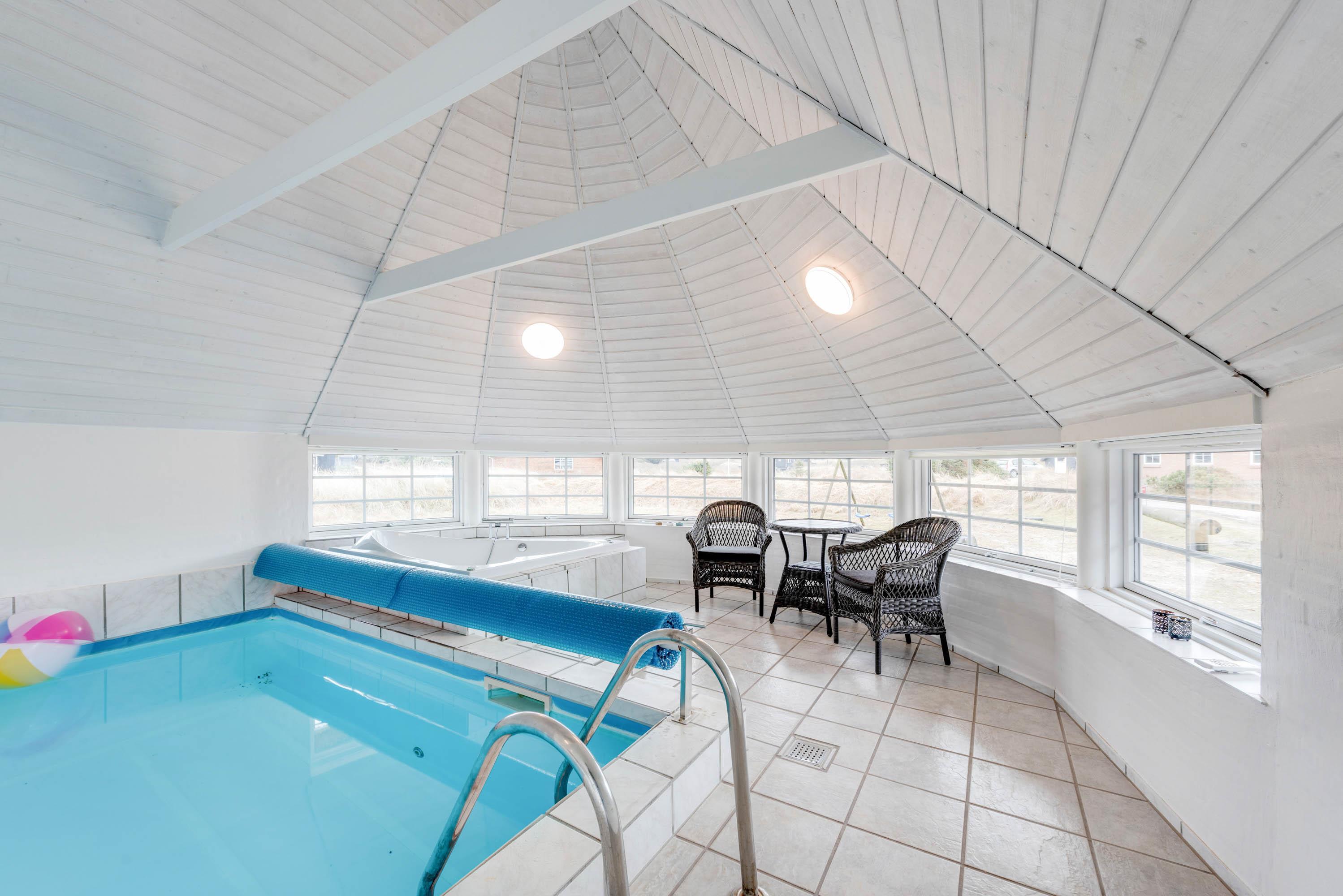 Det store 10-personers sommerhus har en 16m2 stor pool, der sikrer timevis af underholdning. Her er I aldrig afhængige af vejret. Poolen er altid åben og klar til at hoppe i. Der er også plads til, at man kan svømme nogle baner frem og tilbage, inden børnene kaster sig over vandet. Der er samtidig et spabad, hvis I ønsker mere afslapning. Har I brug for at få varmen, så kan I benytte jer af saunaen.