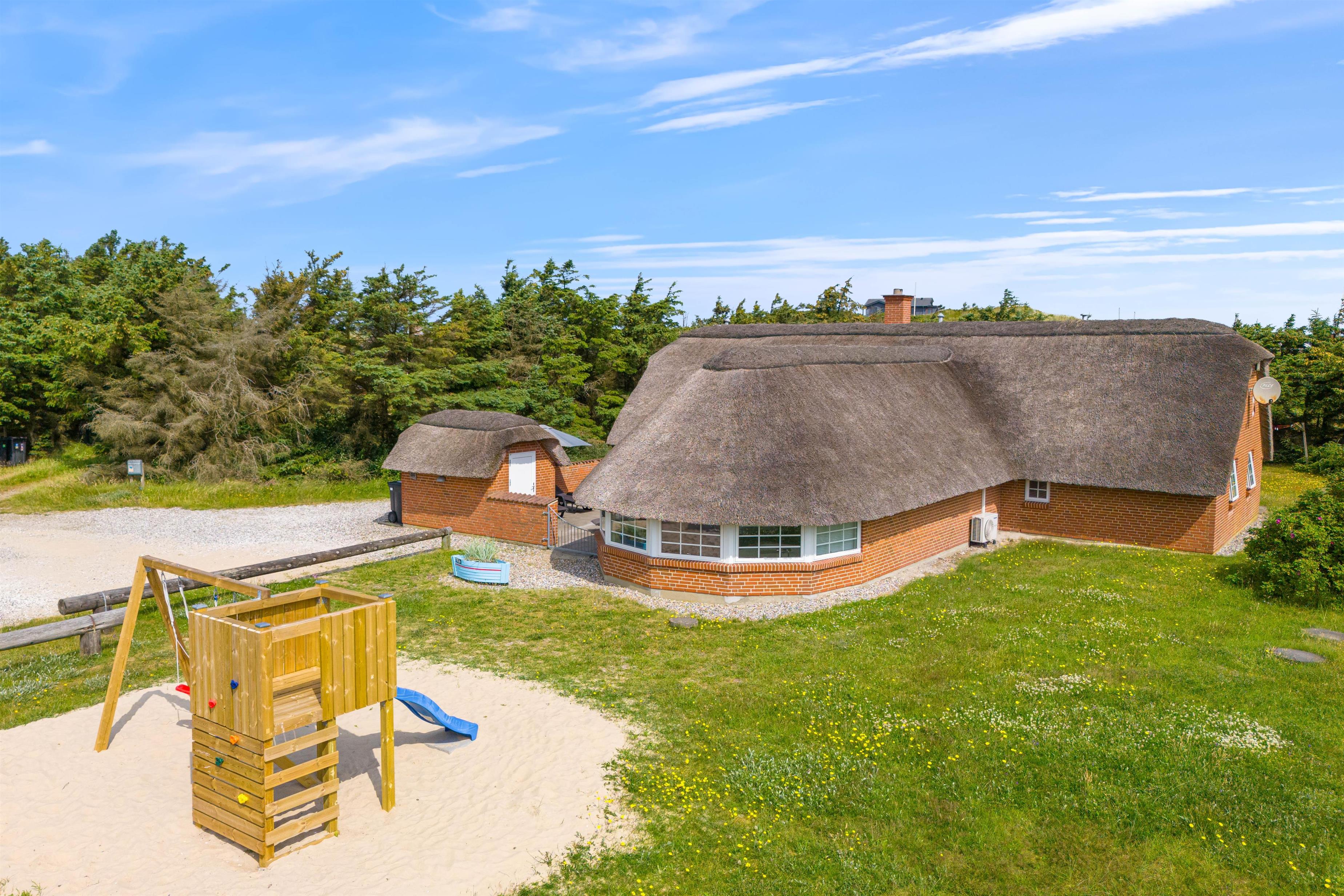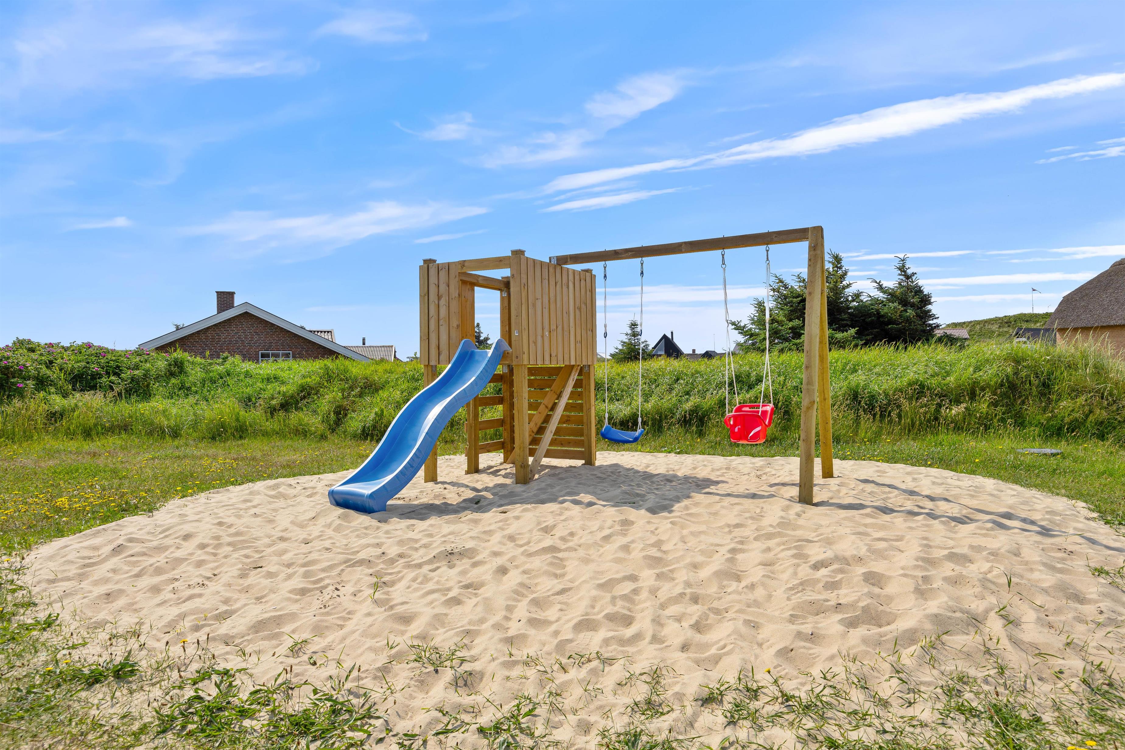 Feriehuset ligger på en dejlig naturgrund, derved har børnene rig mulighed for at lege udenfor på græsplænen, i sandkassen eller ved gyngestativet. I har mulighed for at samles på den lukkede terrasse, hvor der både er havemøbler og solvogne. Bagefter kan I med fordel tænde op i grillen og nyde et godt måltid sammen.