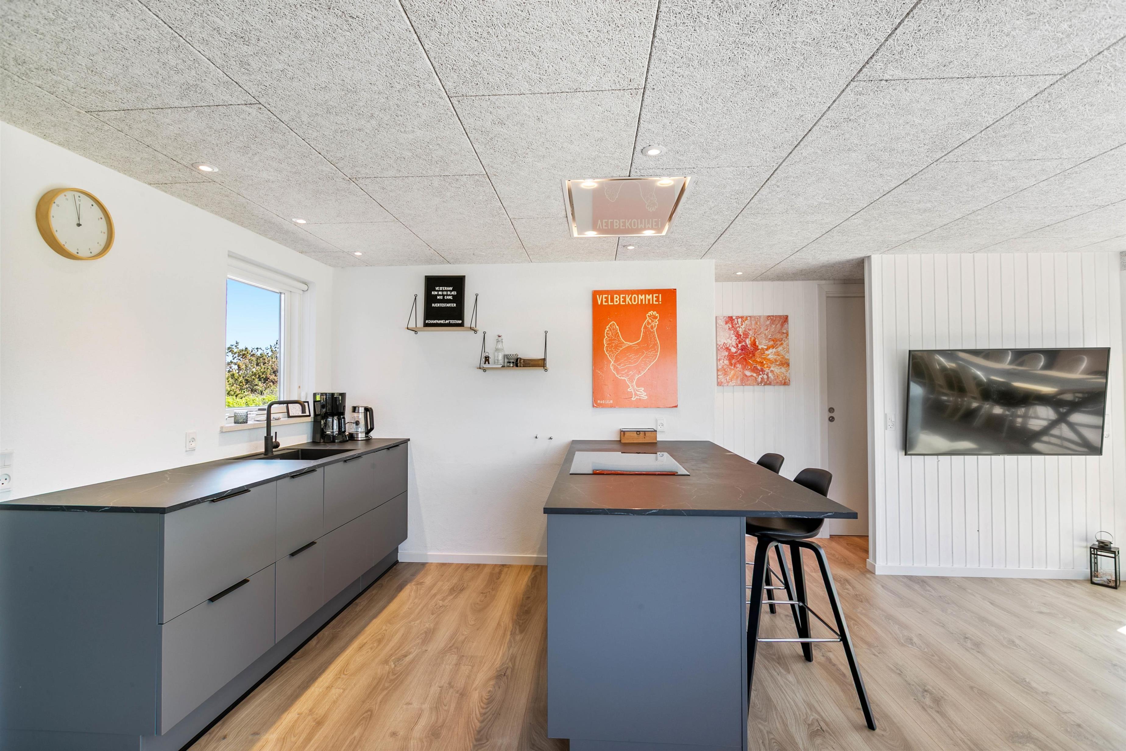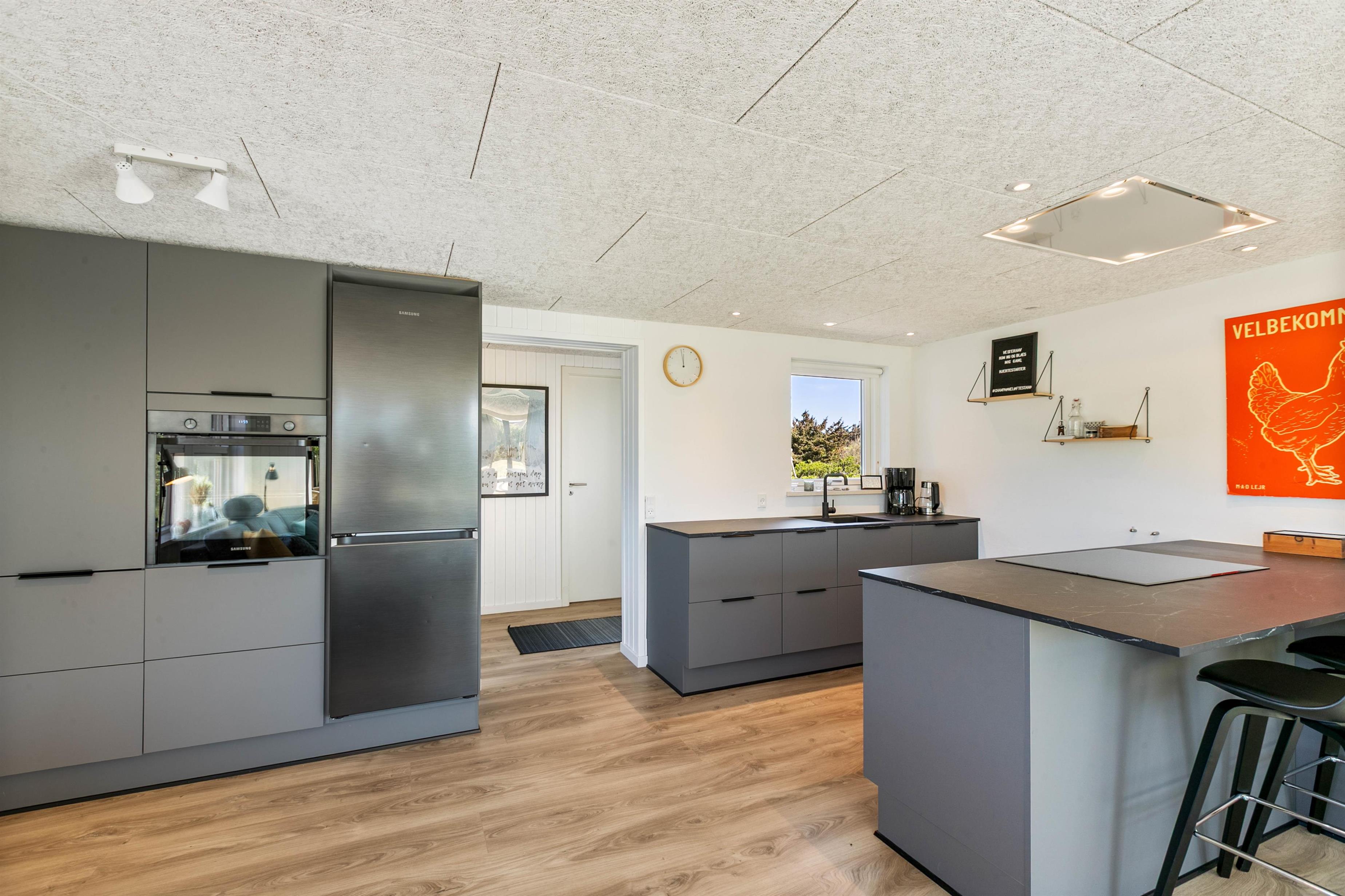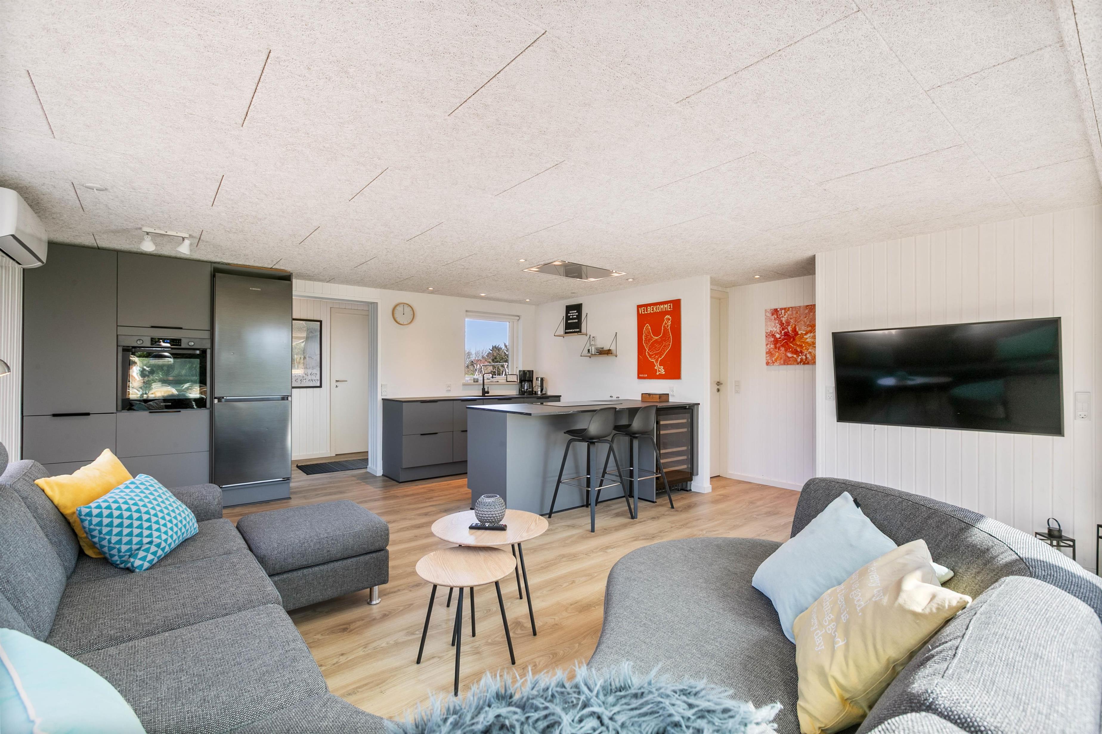 Feriehuset byder på 125 kvadratmeter plads til at udfolde sig på. Med plads op til 8 personer, kan I samles hele familien her på Mågedalen 15. Det moderne, stilfulde og veludstyrede køkken har alle de faciliteter, der gør amatørkokken glad. Opvaskemaskinen sparer værdifuld ferietid, så I kan samles om det lyse spisebord og lægge planer for de næste par dage. Den energibesparende luft-til-luft-varmepumpe sørger for et behageligt indeklima.