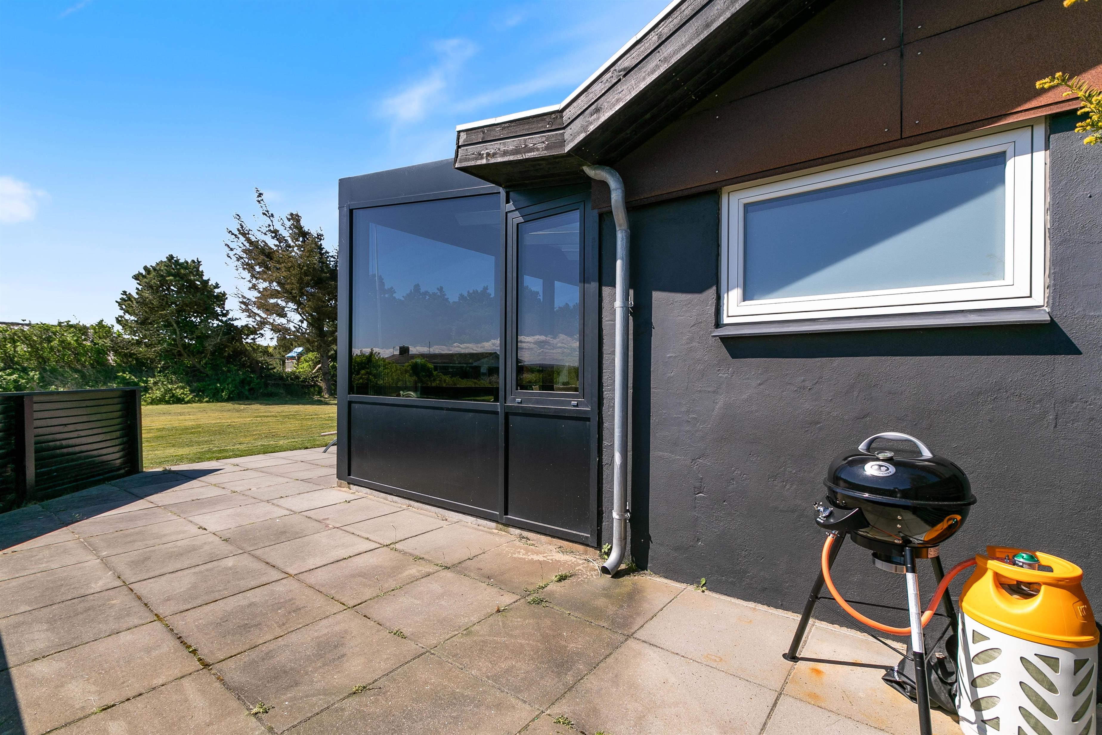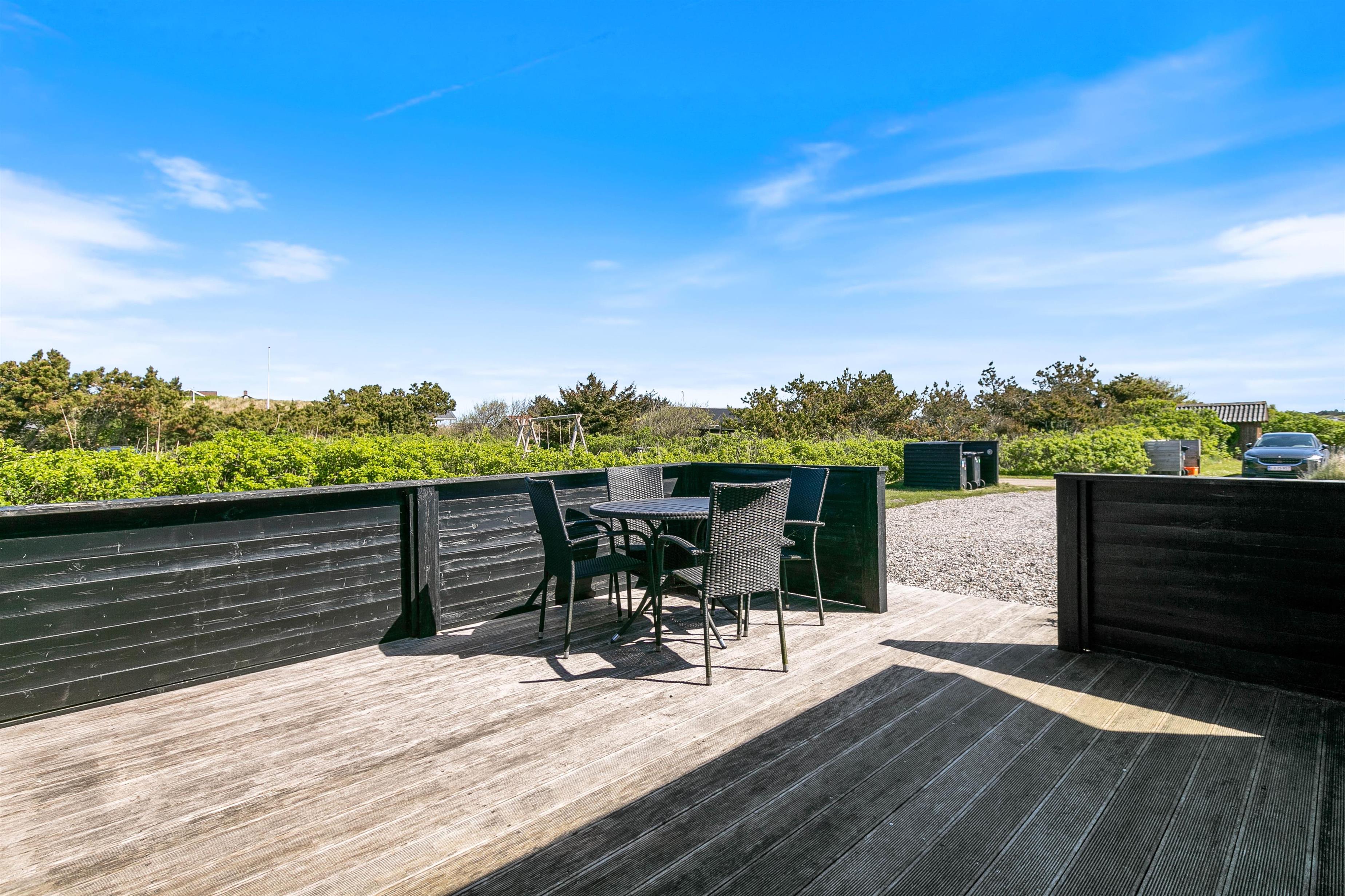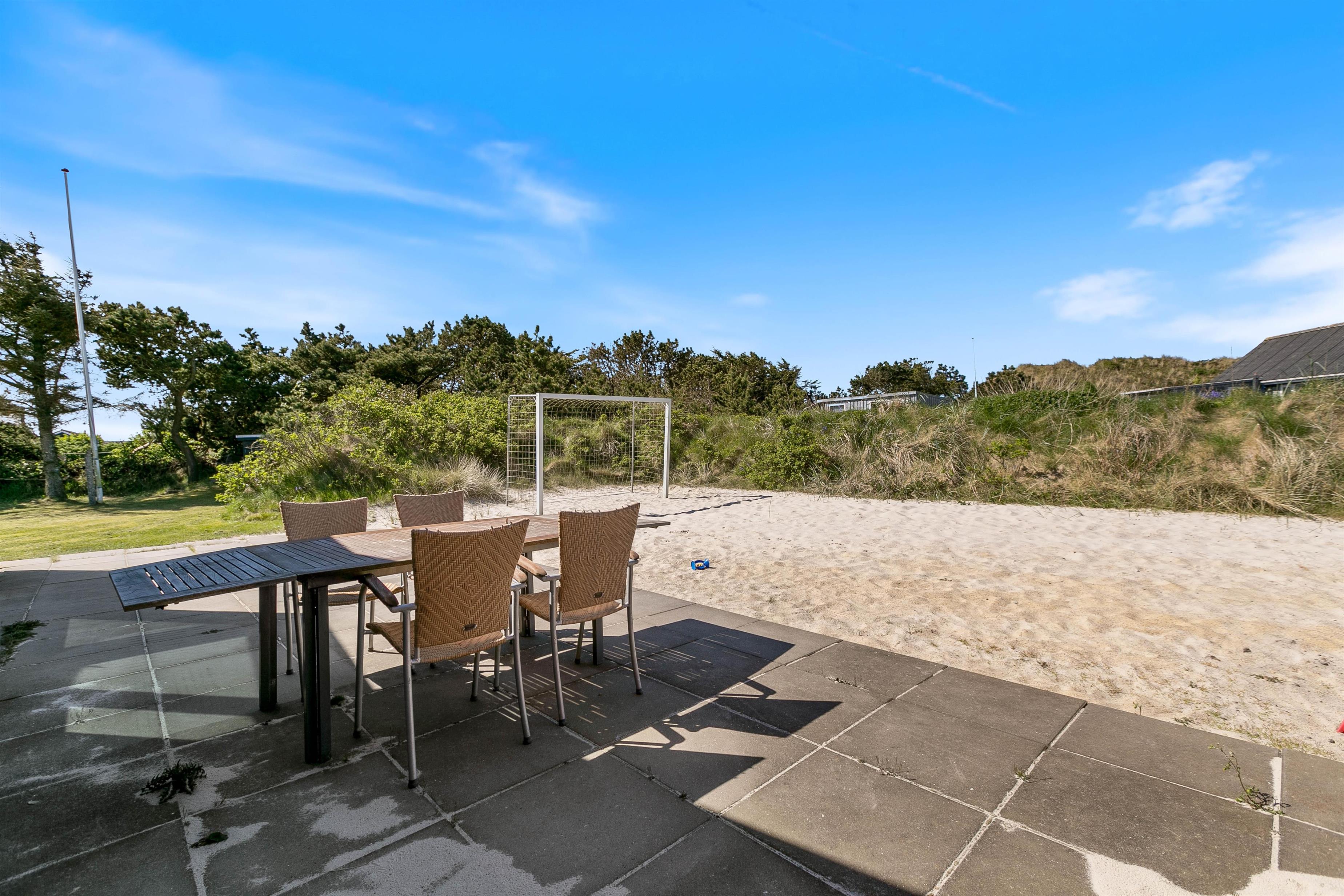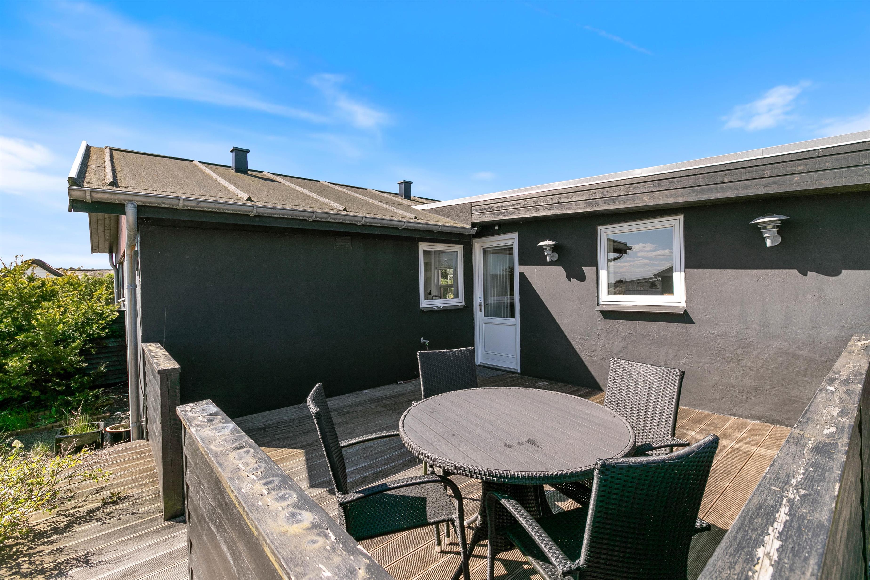 Omgivet af en skøn naturgrund finder i et ideelt miljø til afslapning. Sandet på sommerhusets grund giver de små gæster mulighed for at slå sig løs med at bygge et sandslot, mens I voksne kan slappe af i de behagelige havemøbler. Terrassen indbyder til dejlige sommeraftener hvor I kan tilberede lækre måltider på grillen og bare nyde den friske luft. Med en afskærmet del af terrassen har I også mulighed for at nyde den friske luft og slappe af i private omgivelser.