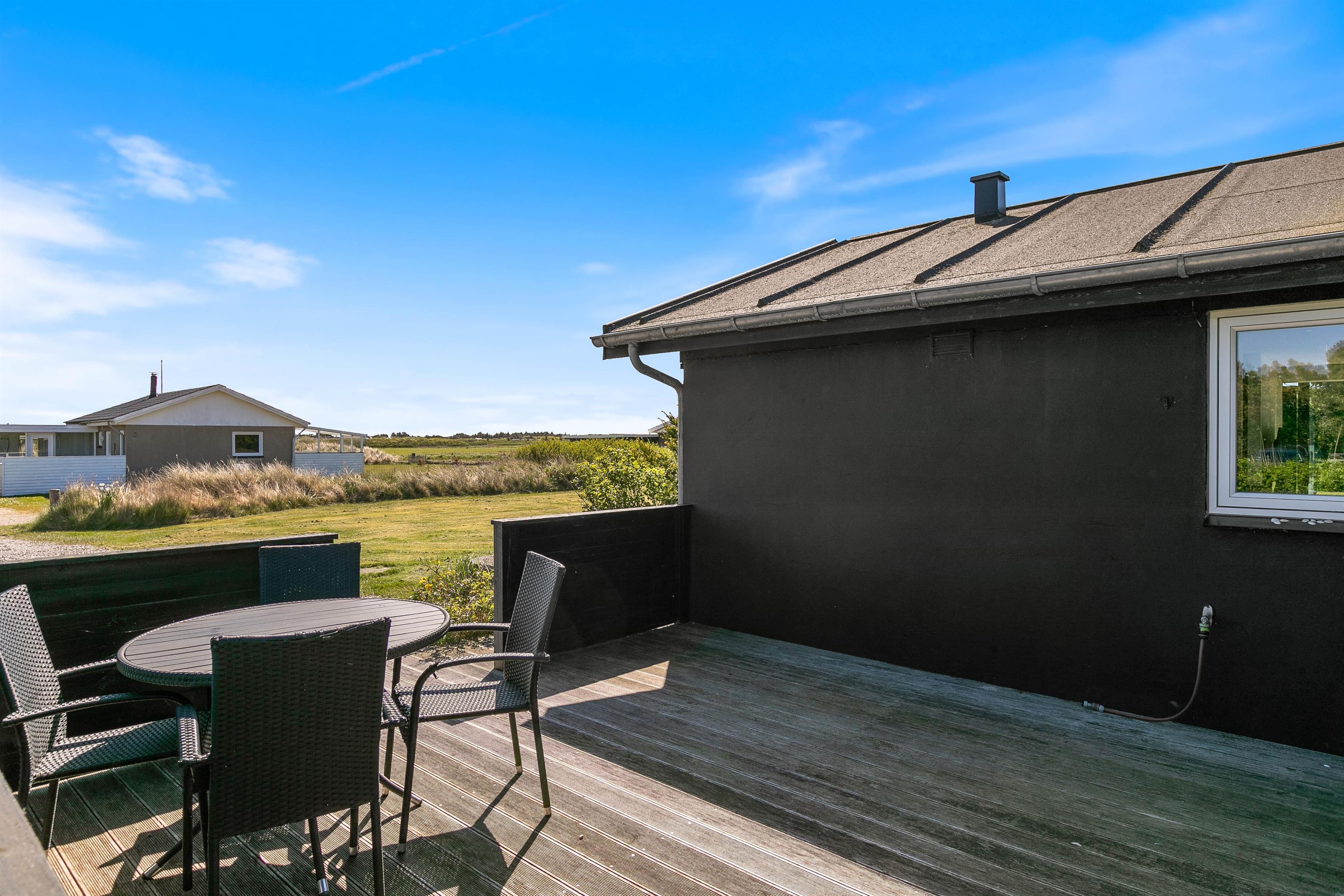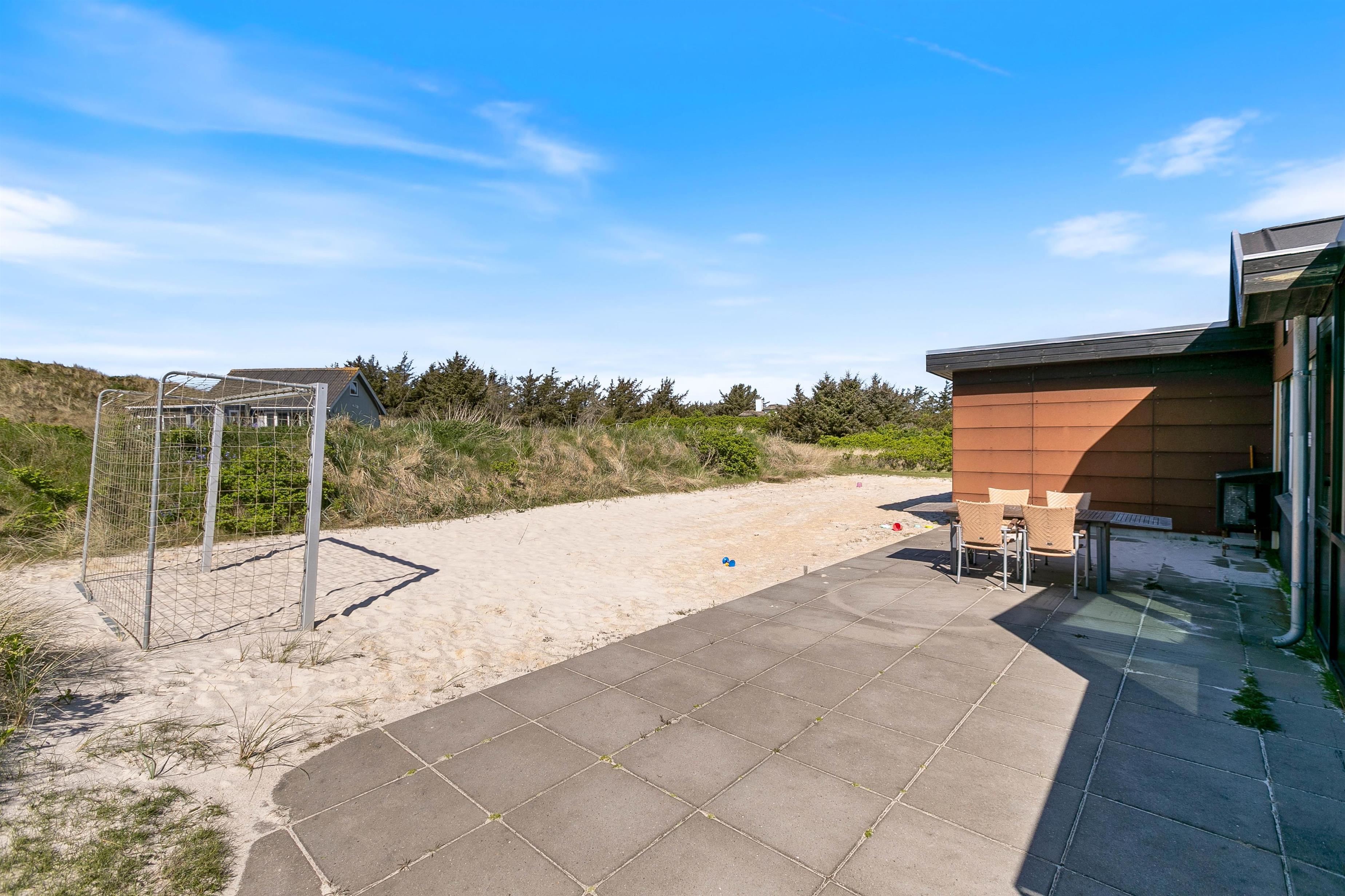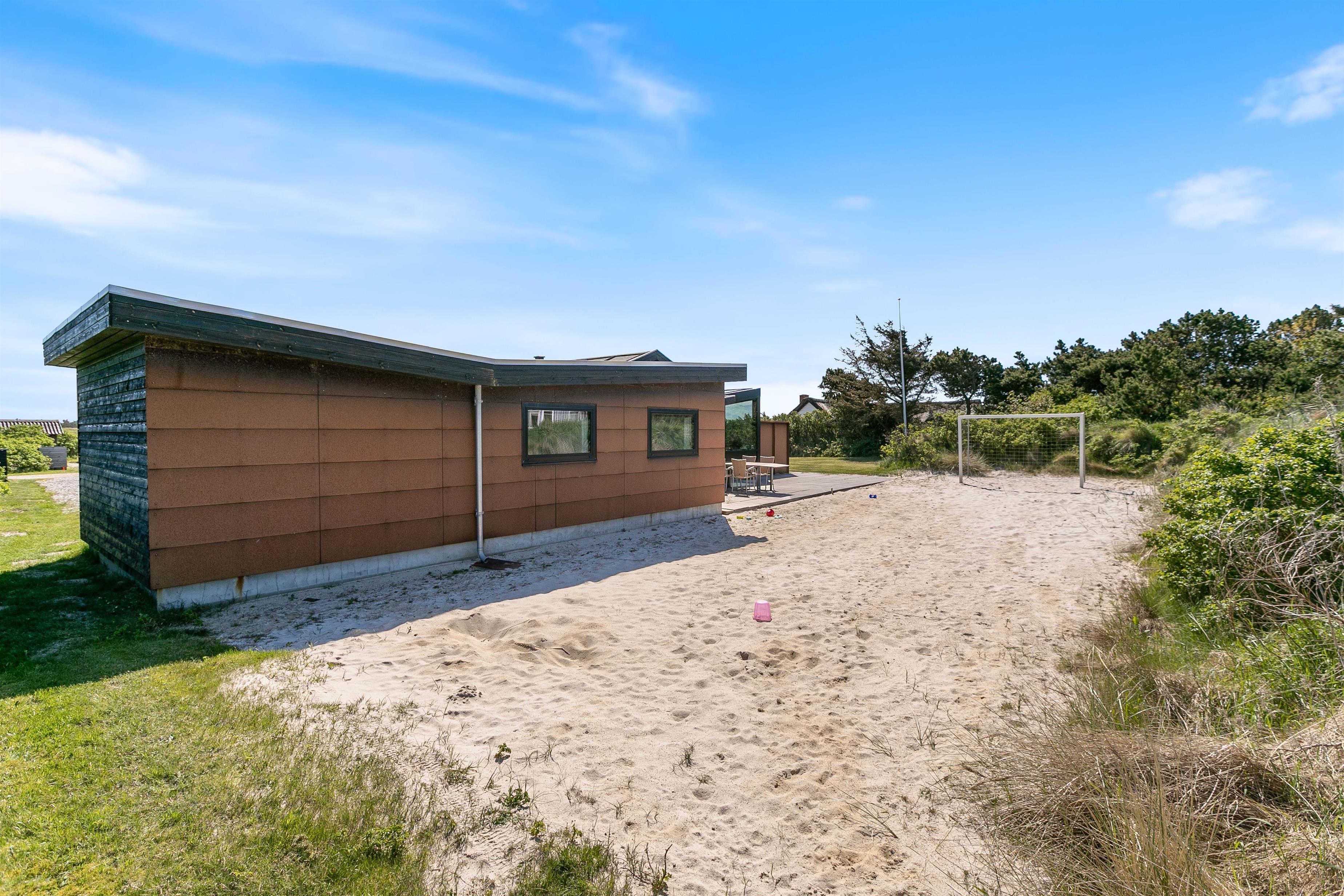 Omgivet af en skøn naturgrund finder i et ideelt miljø til afslapning. Sandet på sommerhusets grund giver de små gæster mulighed for at slå sig løs med at bygge et sandslot, mens I voksne kan slappe af i de behagelige havemøbler. Terrassen indbyder til dejlige sommeraftener hvor I kan tilberede lækre måltider på grillen og bare nyde den friske luft. Med en afskærmet del af terrassen har I også mulighed for at nyde den friske luft og slappe af i private omgivelser.