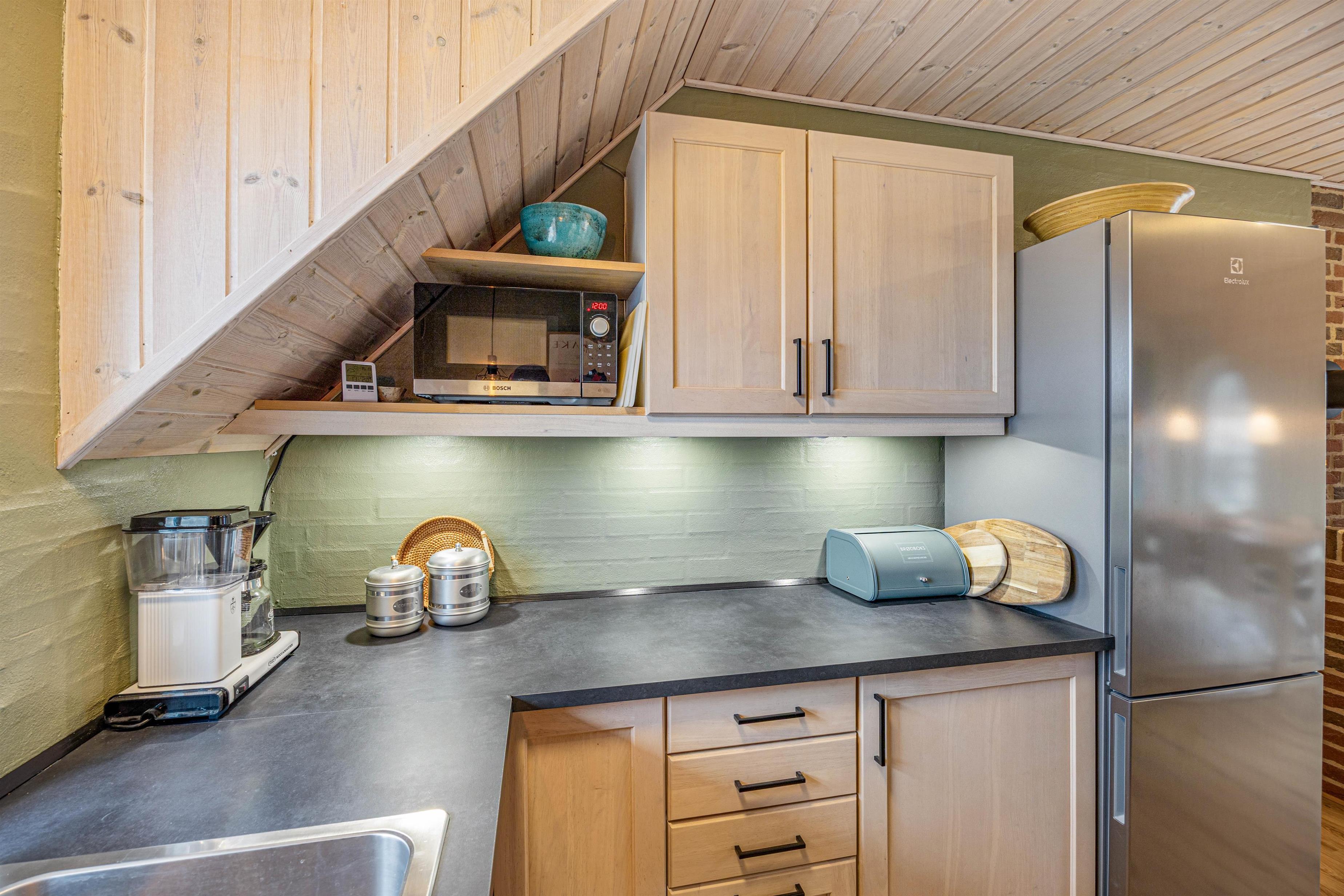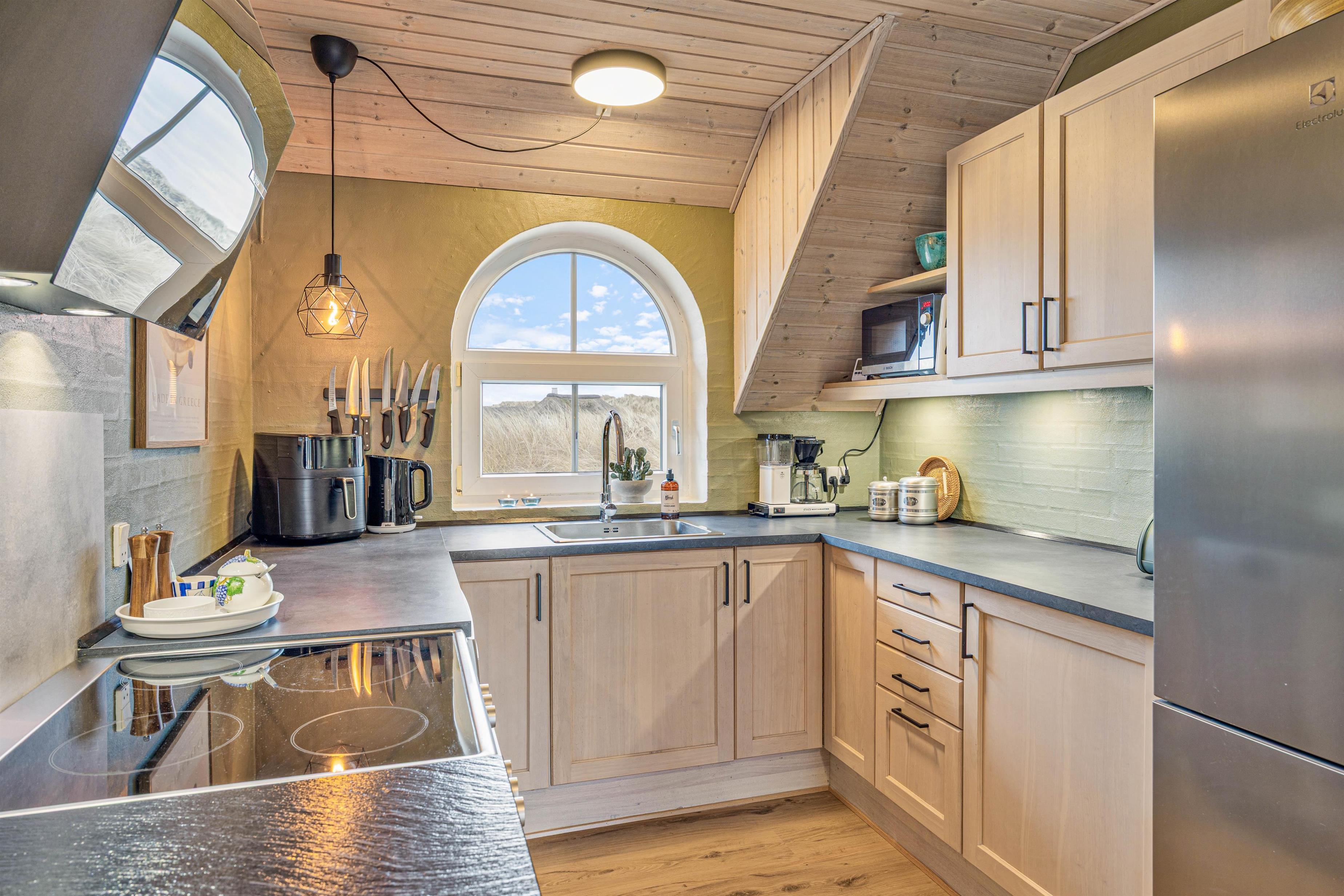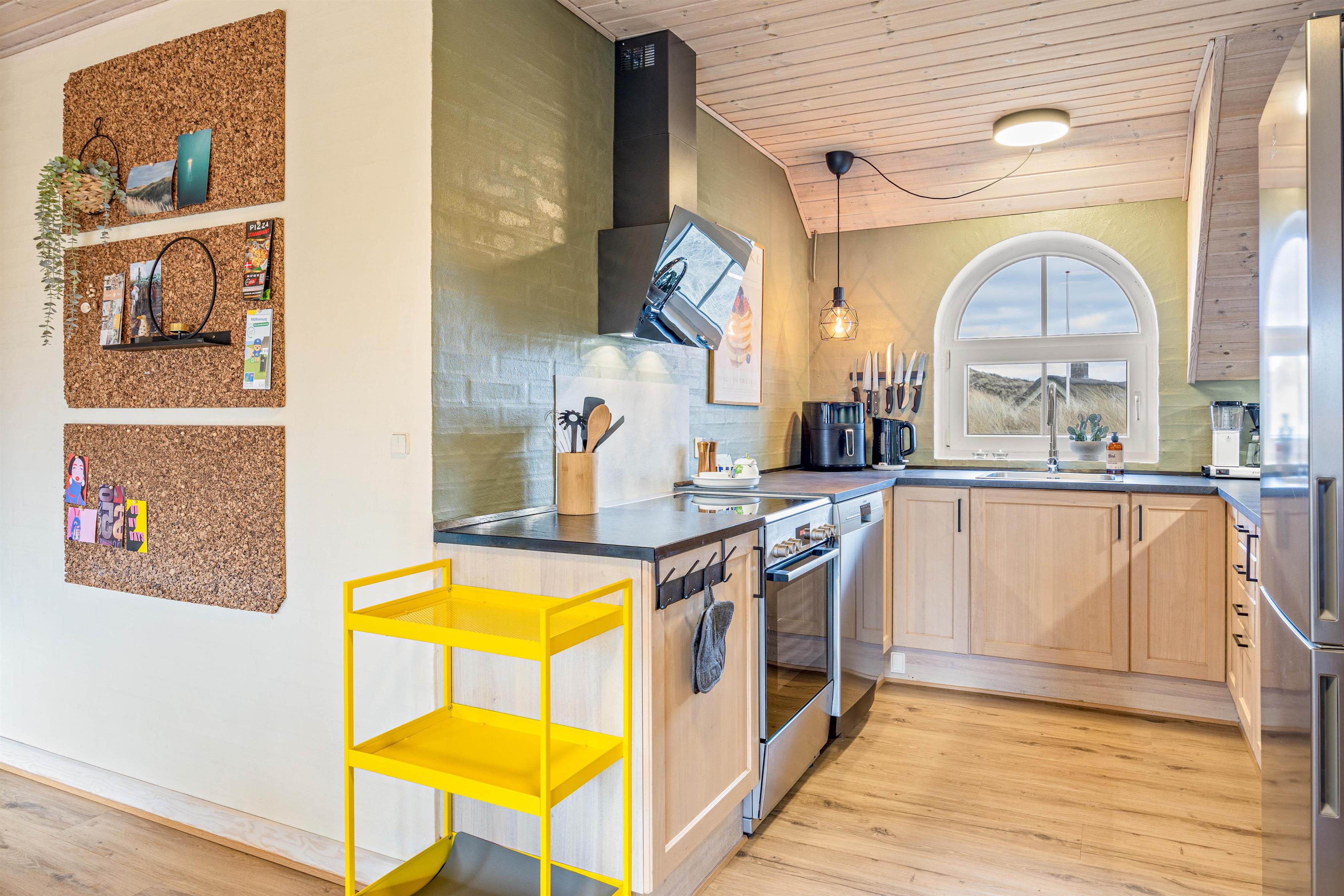 Så snart I træder ind i sommerhuset, vil I kunne mærke, at der er tænkt på, at I skal have en bekymringsfri og dejlig ferie. Det åbne opholdsrum med både stue, køkken og spiseplads inviterer til mange gode stunder og masser af kvalitetstid sammen. Her kan I holde samtalen kørende – ligegyldigt om den ene daser på sofaen, og den anden af jer står og kokkererer i det gode køkken, hvor I desuden har en opvaskemaskine til rådighed.
