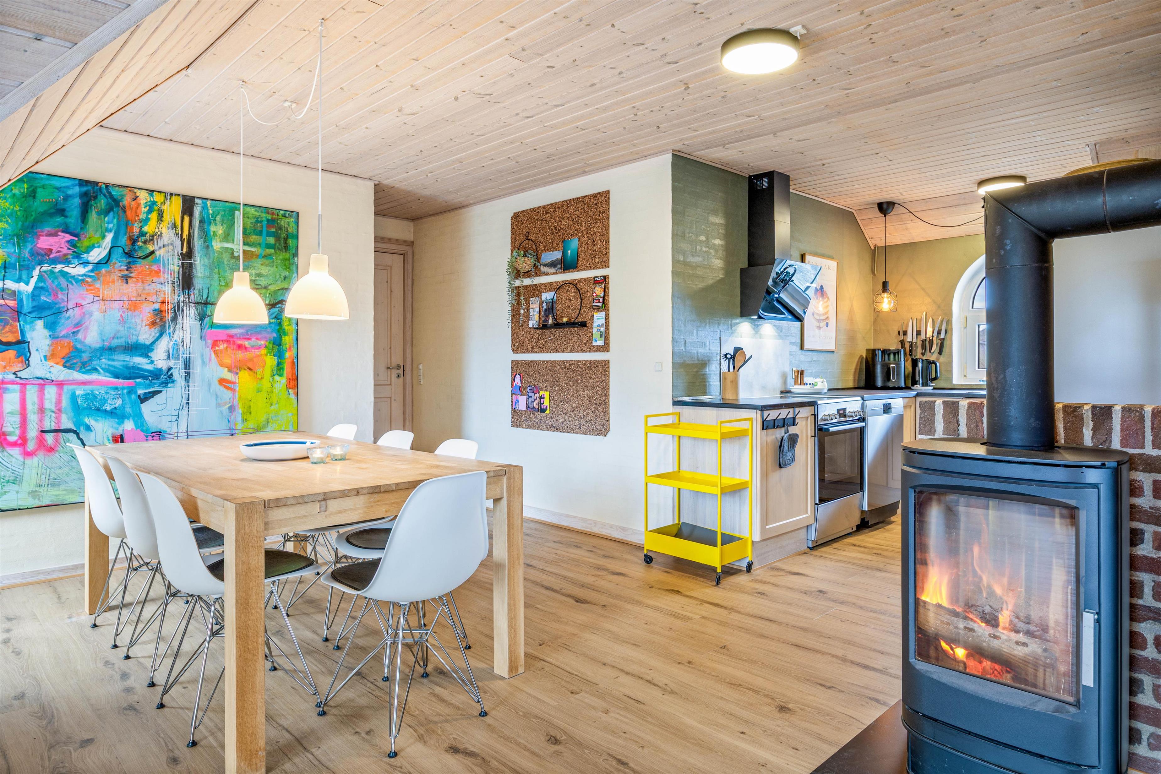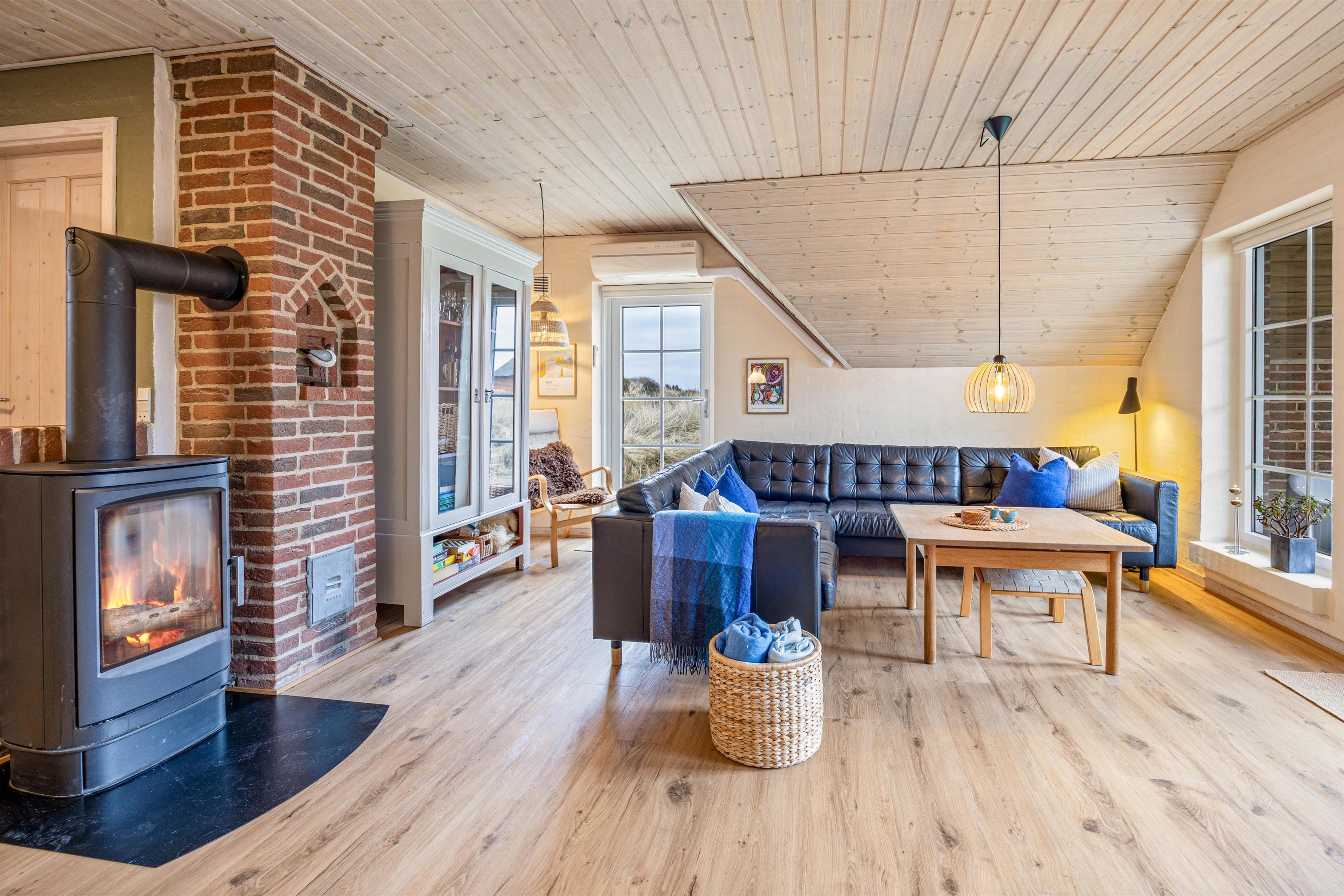 Centrum i dette opholdsrum er uden tvivl den dejlige brændeovn, der kan tilføje masser af hygge med sine knitrende flammer. Det er også ekstra belejligt på de køligere aftener, hvor brændeovnen kan bruges til at varme hele rummet op.