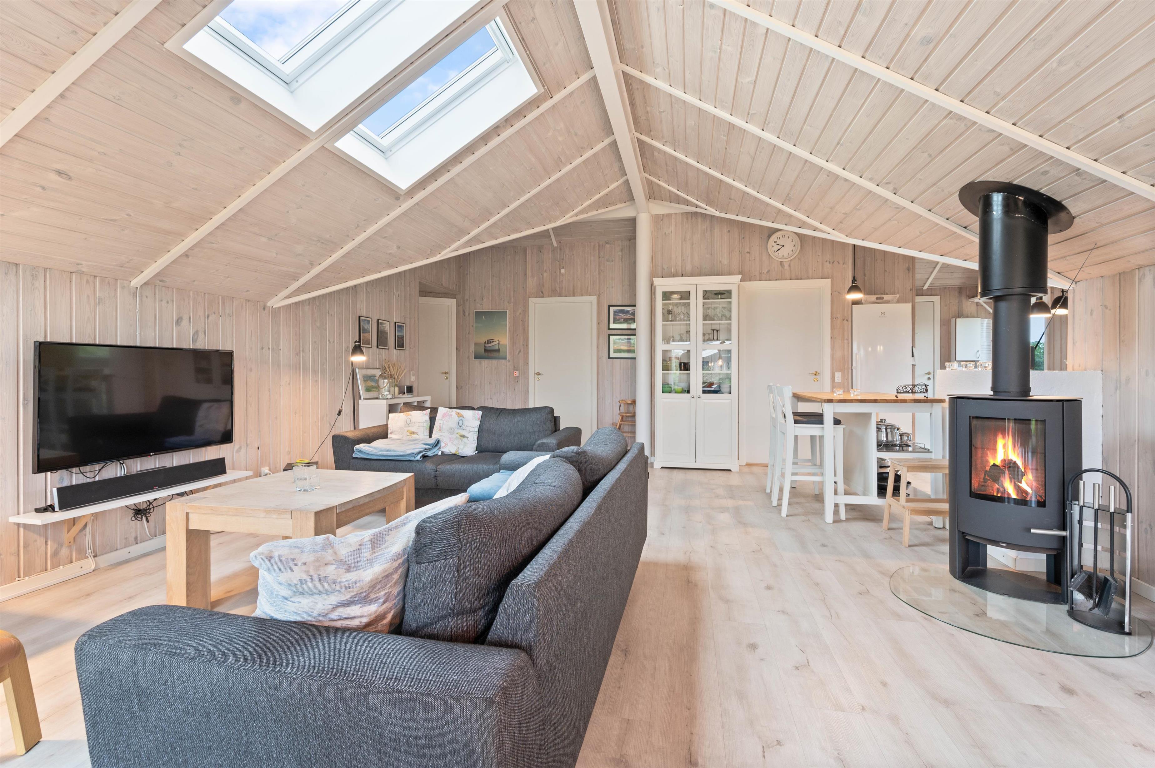 Feriehusets hjerte er helt klar det åbne køkkenalrum, hvor loftet også går hele vejen til kip samt dejlige ovenlysvinduer der giver et godt lysindfald. Her er der virkelige skruet op for hyggen, og der er nøje tænkt på at skabe et dejligt rum, der er klar til at skabe mange dejlige ferieminder. Det er også her i stue afdelingen, hvor I finder brændeovn, der altid er garant for at skabe en hyggelig og varm atmosfære.