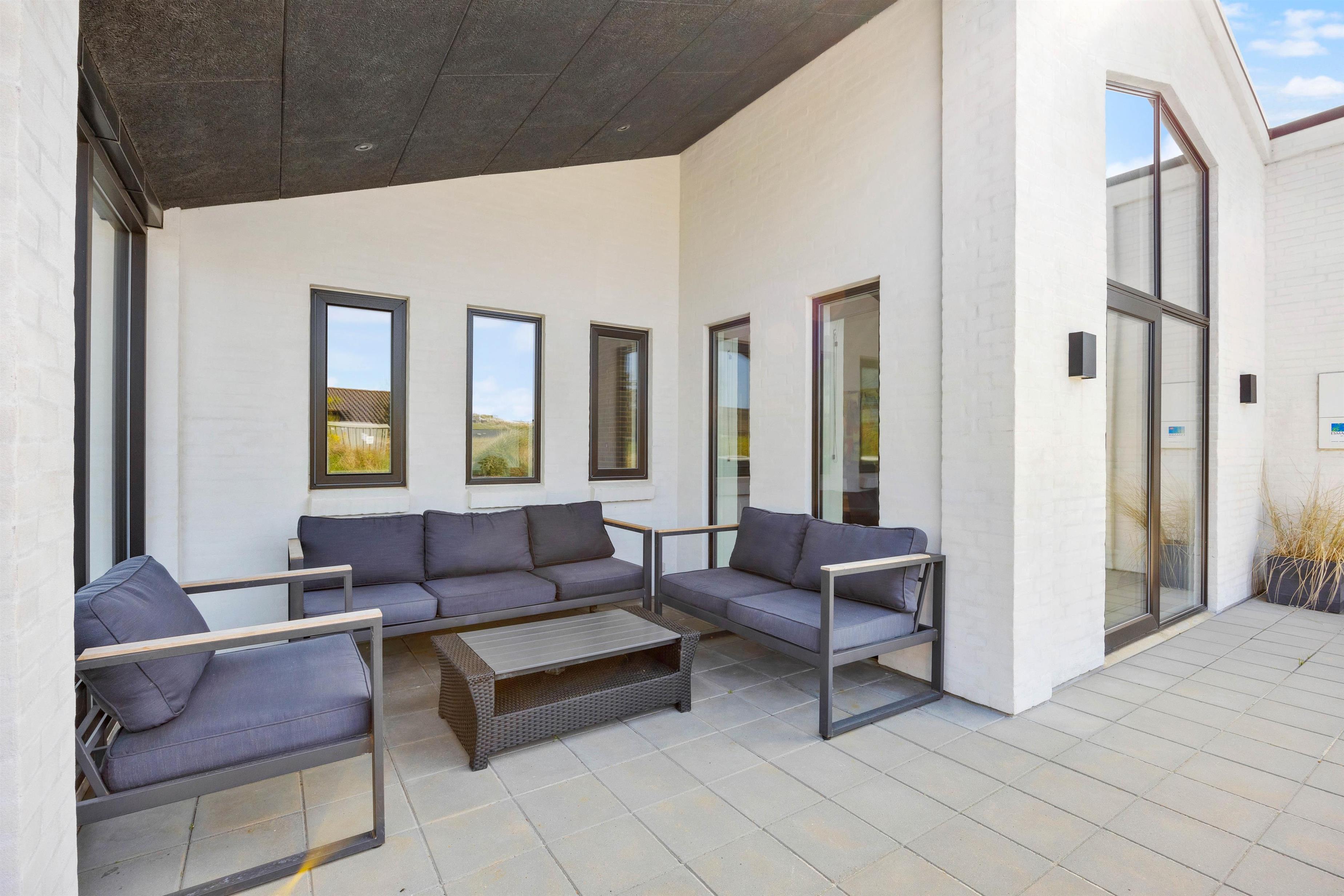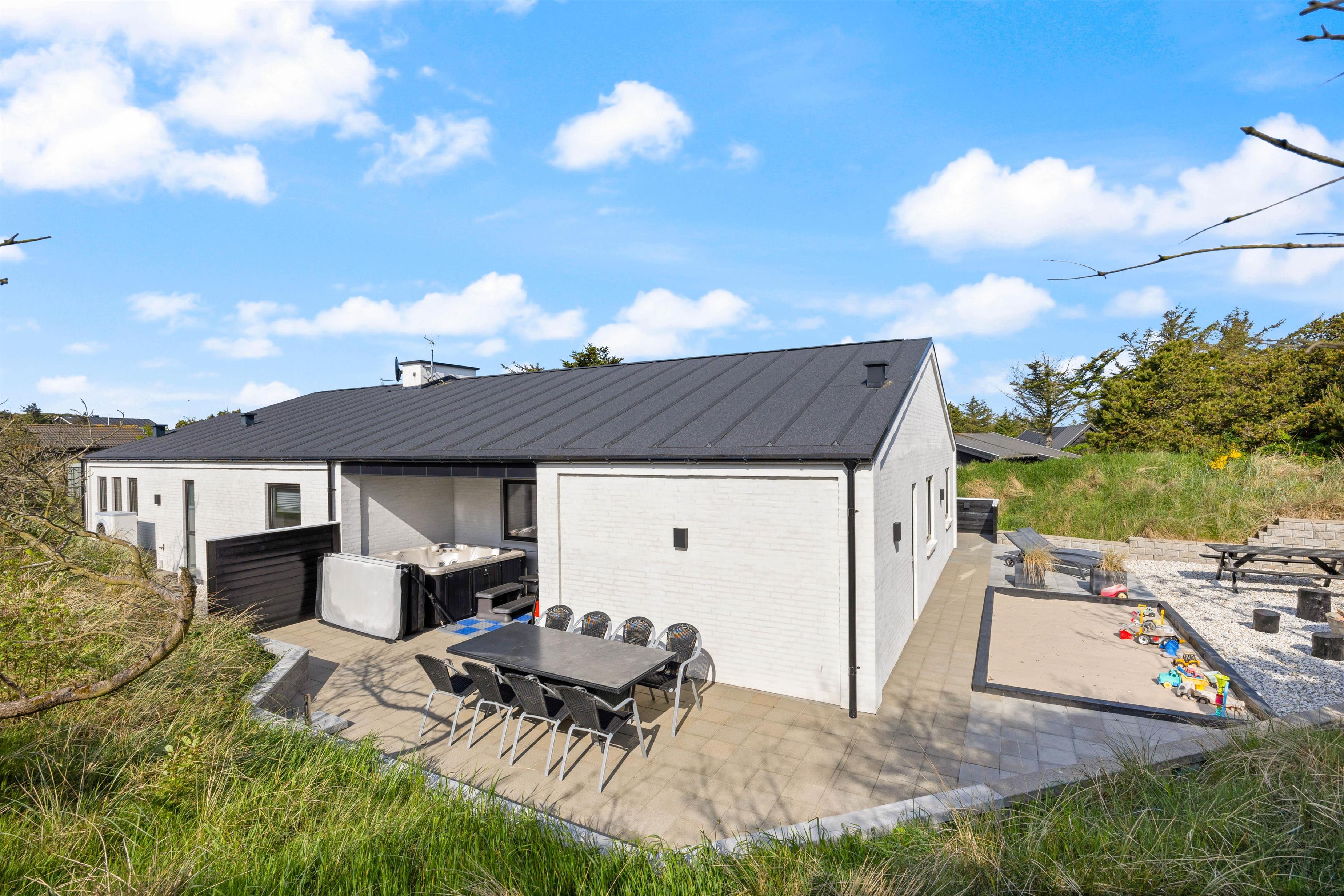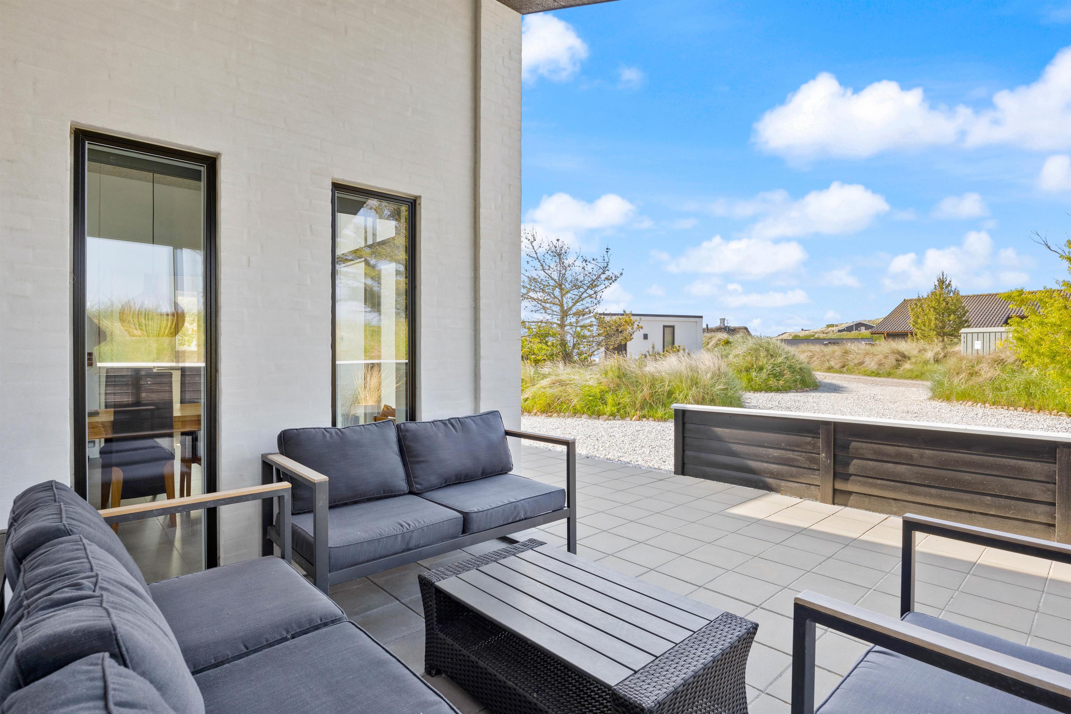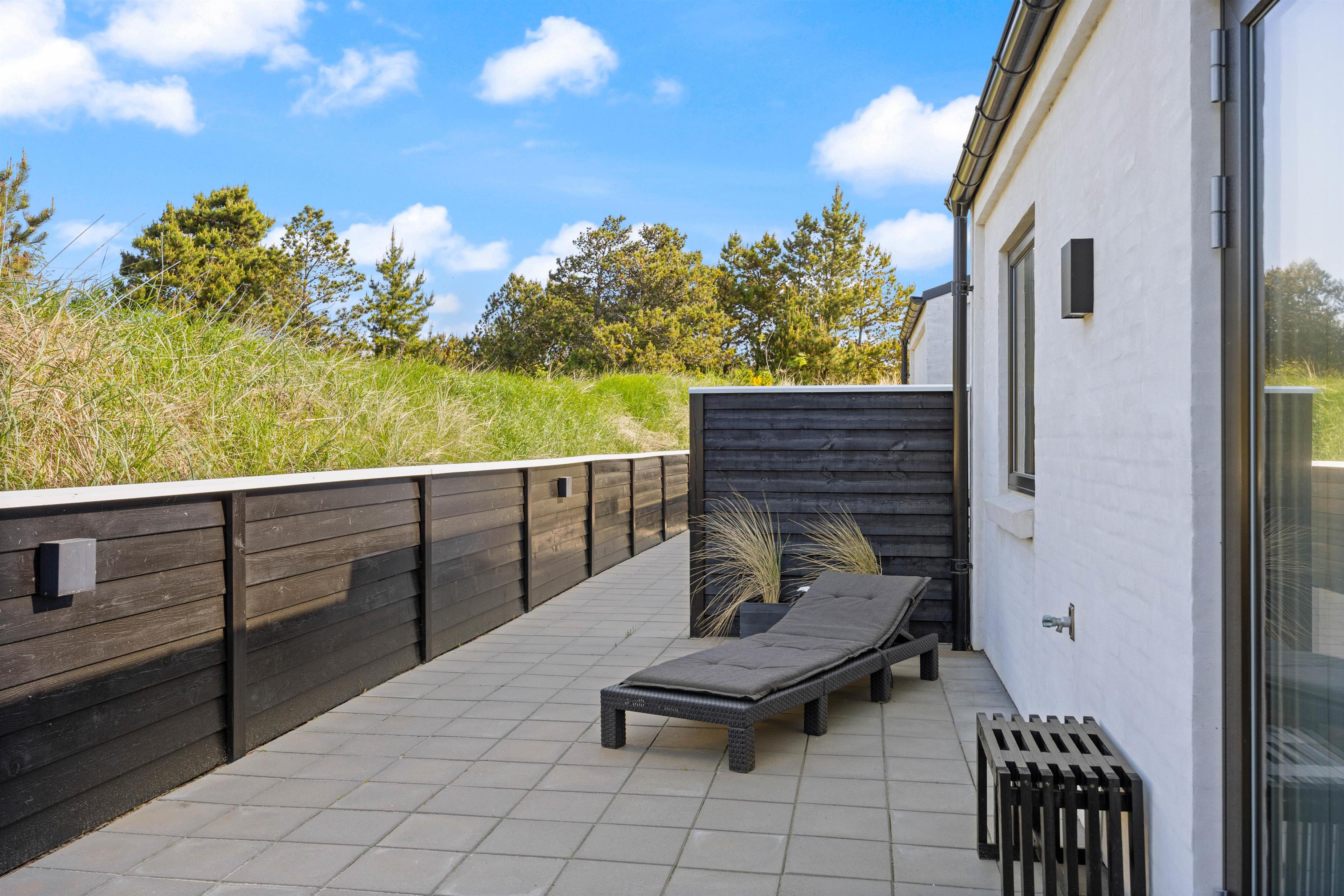 Selvom der er nok at fordrive tiden med indendørs, har I også masser af muligheder for at tilbringe tiden udendørs på bedste vis. Uanset om I er til afslapning eller aktivitet. Rundt om huset løber en stor terrasse med flere kroge til forskellige formål. Her er blandt andet et afskærmet område med loungemøbler, en solrig plet med liggestole samt et afgrænset område med en stor sandkasse og bålfad.