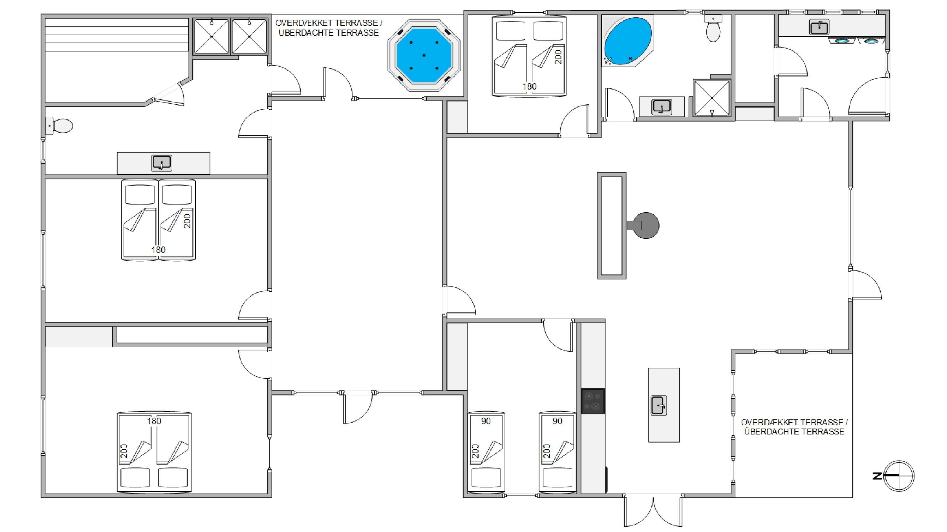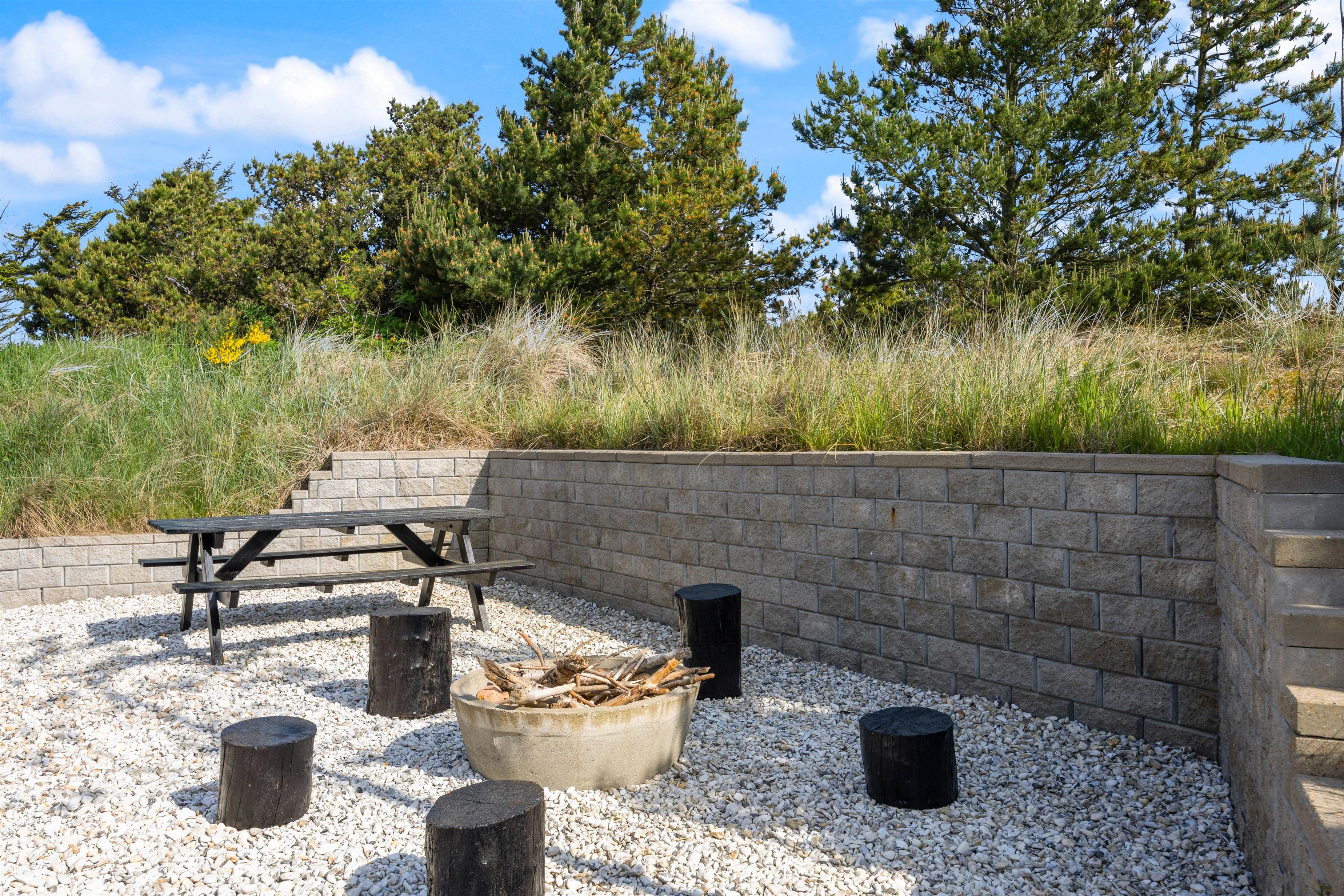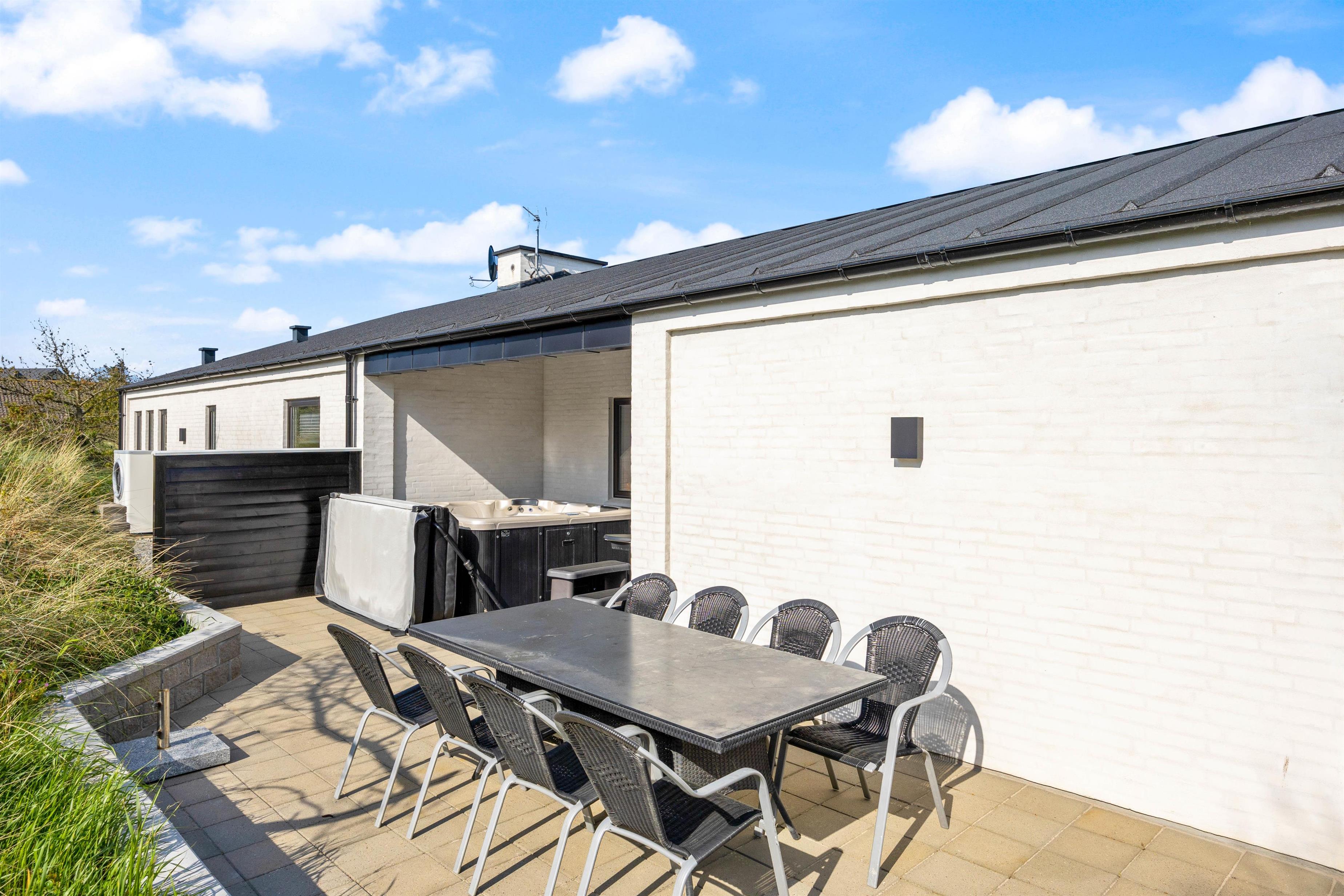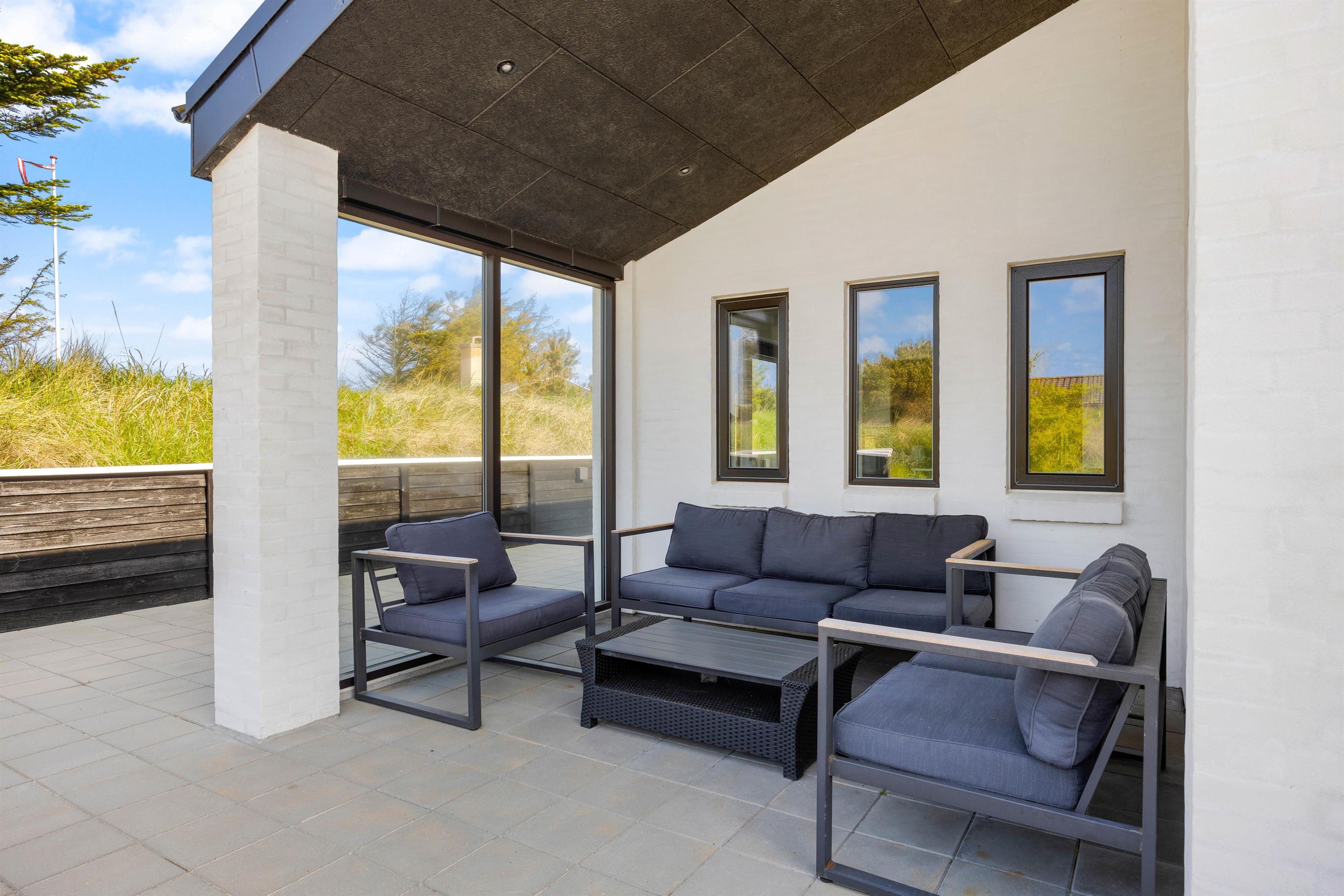 Selvom der er nok at fordrive tiden med indendørs, har I også masser af muligheder for at tilbringe tiden udendørs på bedste vis. Uanset om I er til afslapning eller aktivitet. Rundt om huset løber en stor terrasse med flere kroge til forskellige formål. Her er blandt andet et afskærmet område med loungemøbler, en solrig plet med liggestole samt et afgrænset område med en stor sandkasse og bålfad.