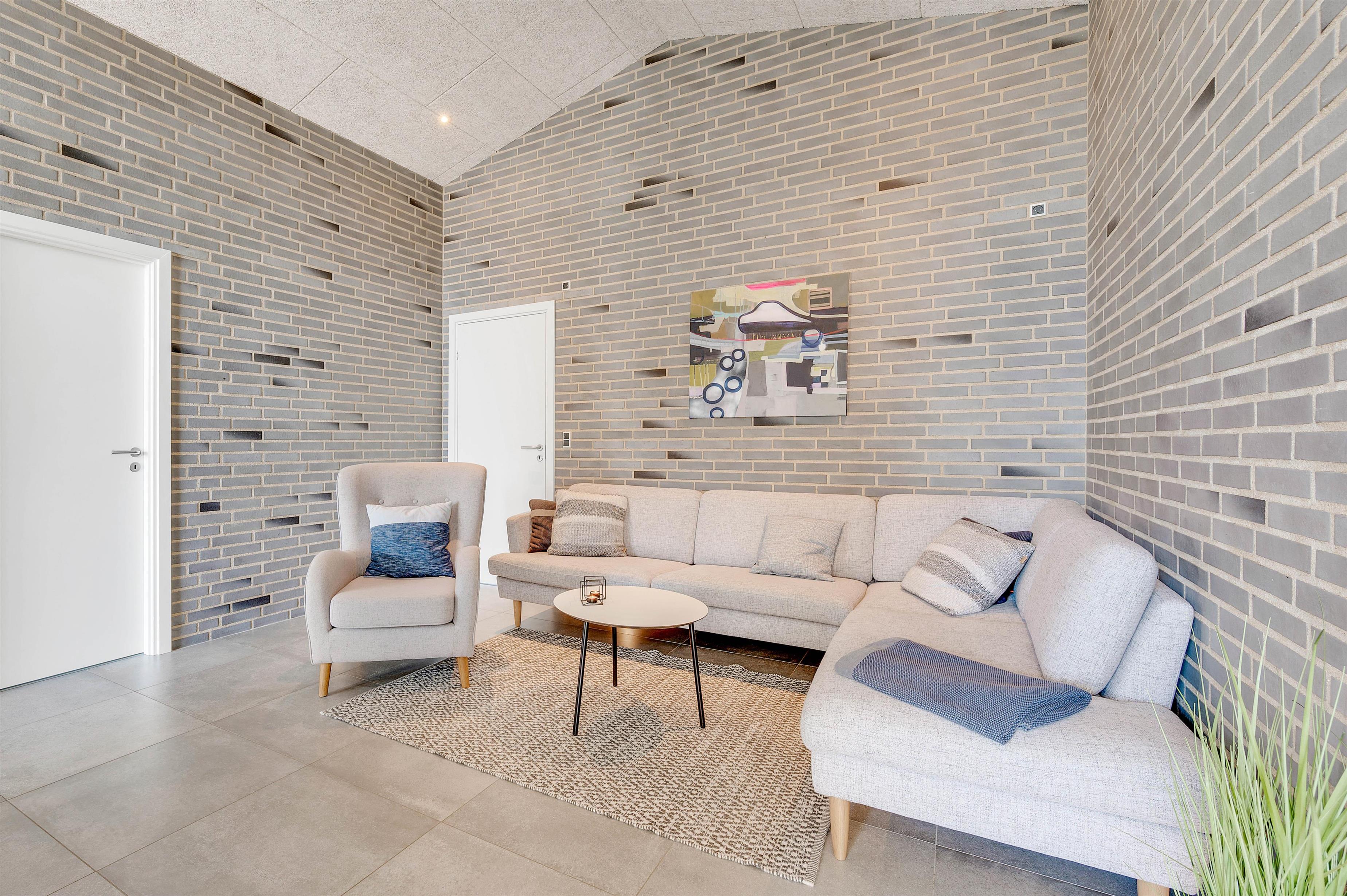 Huset er gennemført fra inderst til yderst. Det sort-hvide eksteriør modsvares af et smagfuldt interiør i en gråtonet farveskala, der indimellem brydes af farverige indslag såsom flotte kunstværker og enkelte møbler eller lamper. Det er virkelig en kyndig hånd, der har ført indretningspenslen. I opholdsrummet ligger et flot, gråt gulv, der står smukt til de rå murstensvægge i stue- og køkkenafdeling.