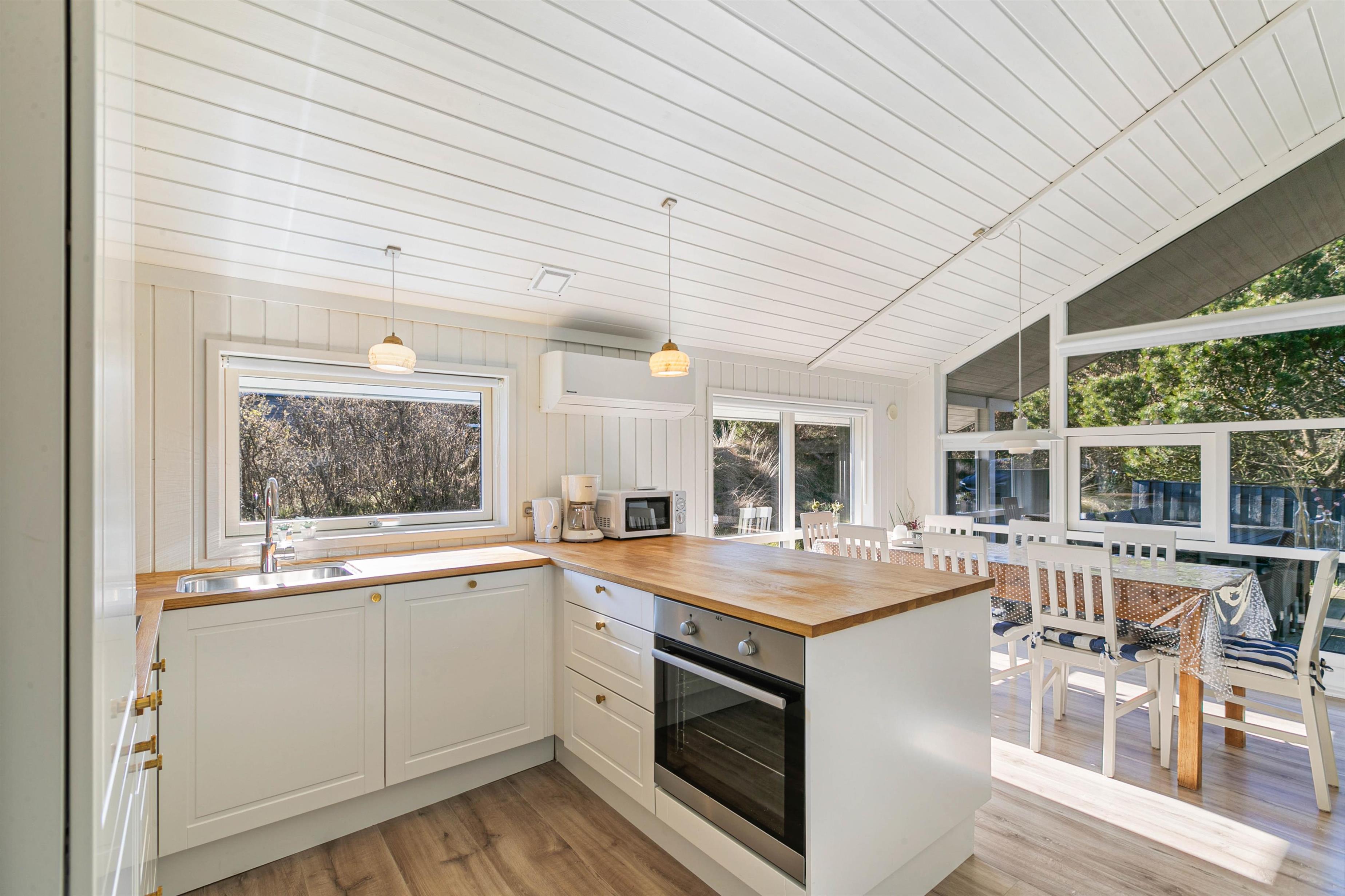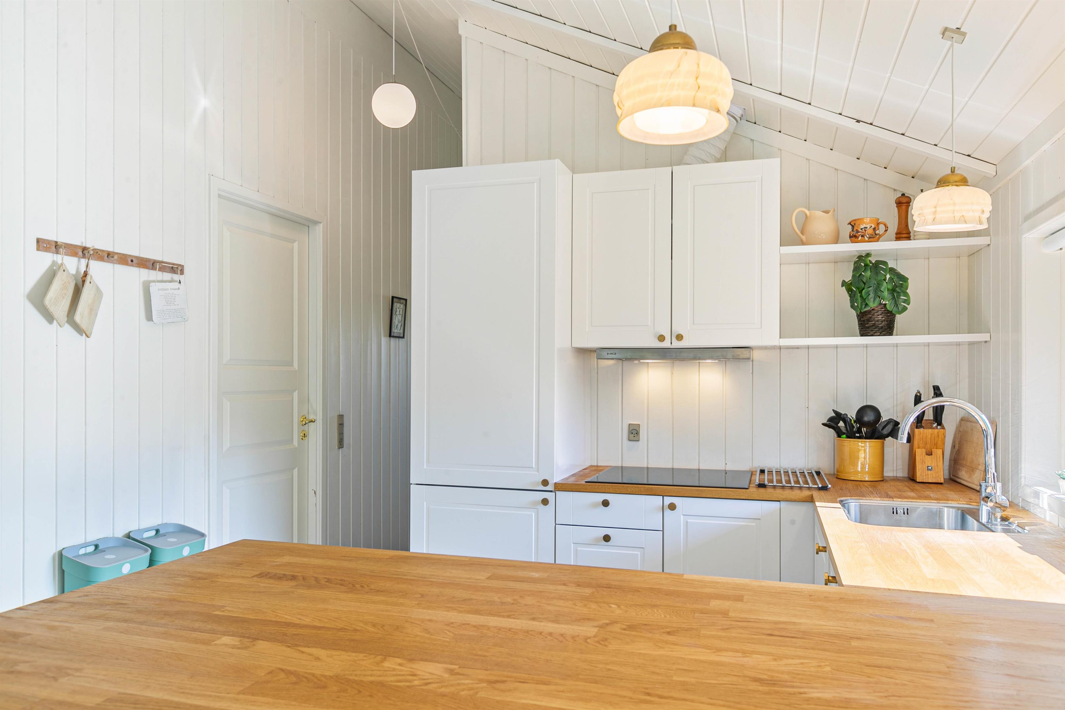 Den åbne køkkenløsning indbyder til masser af kvalitetstid, og køkkenet i sig selv er veludstyret, heriblandt med en opvaskemaskine og en separat fryser med kapacitet til 50 liter. Dette gør det nemt for jer at tilberede, nyde og rydde op efter forskellige måltider.