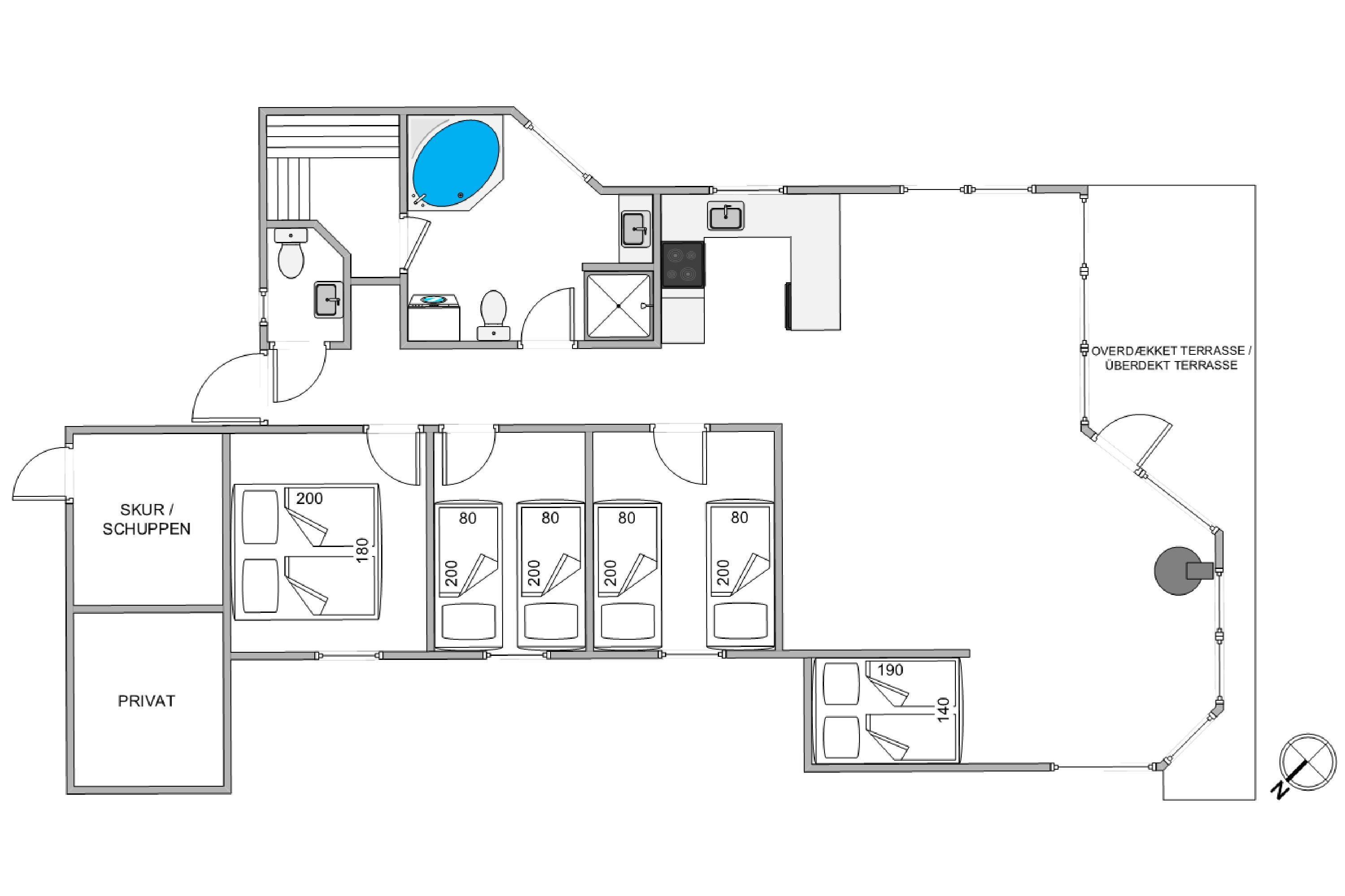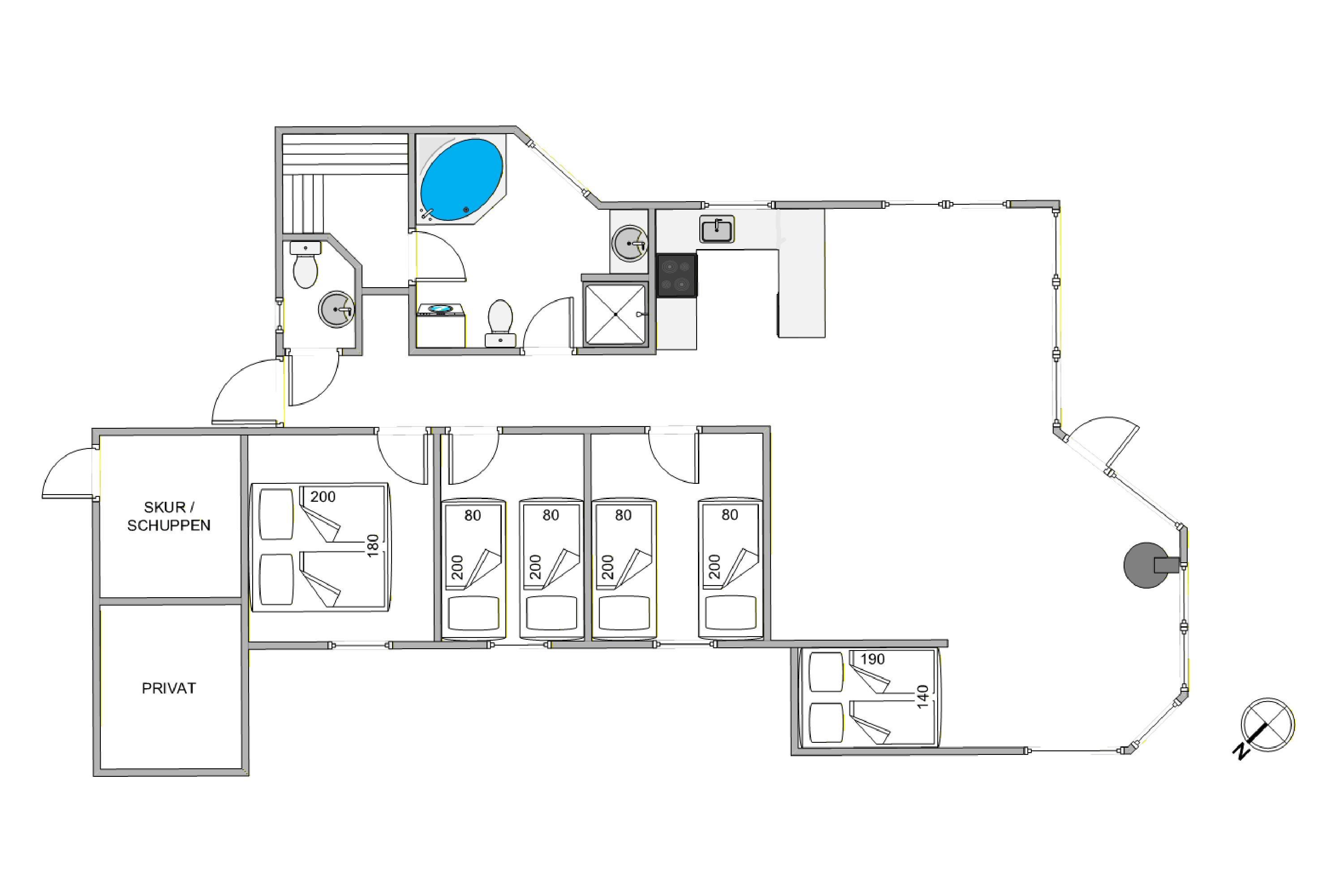 Hvis I efter en lang dag fyldt med aktiviteter og oplevelser har brug for at få ladet jeres batterier op igen, kan I eventuelt søge mod sommerhusets badeværelse, der byder på lidt selvforkælelse og strejf af wellness. På badeværelset, der desuden er med gulvvarme, bliver I også tilbudt lidt ekstra komfort i form af en sauna og spabad, mens et gæstetoilet giver ekstra bekvemmelighed for hele familien.