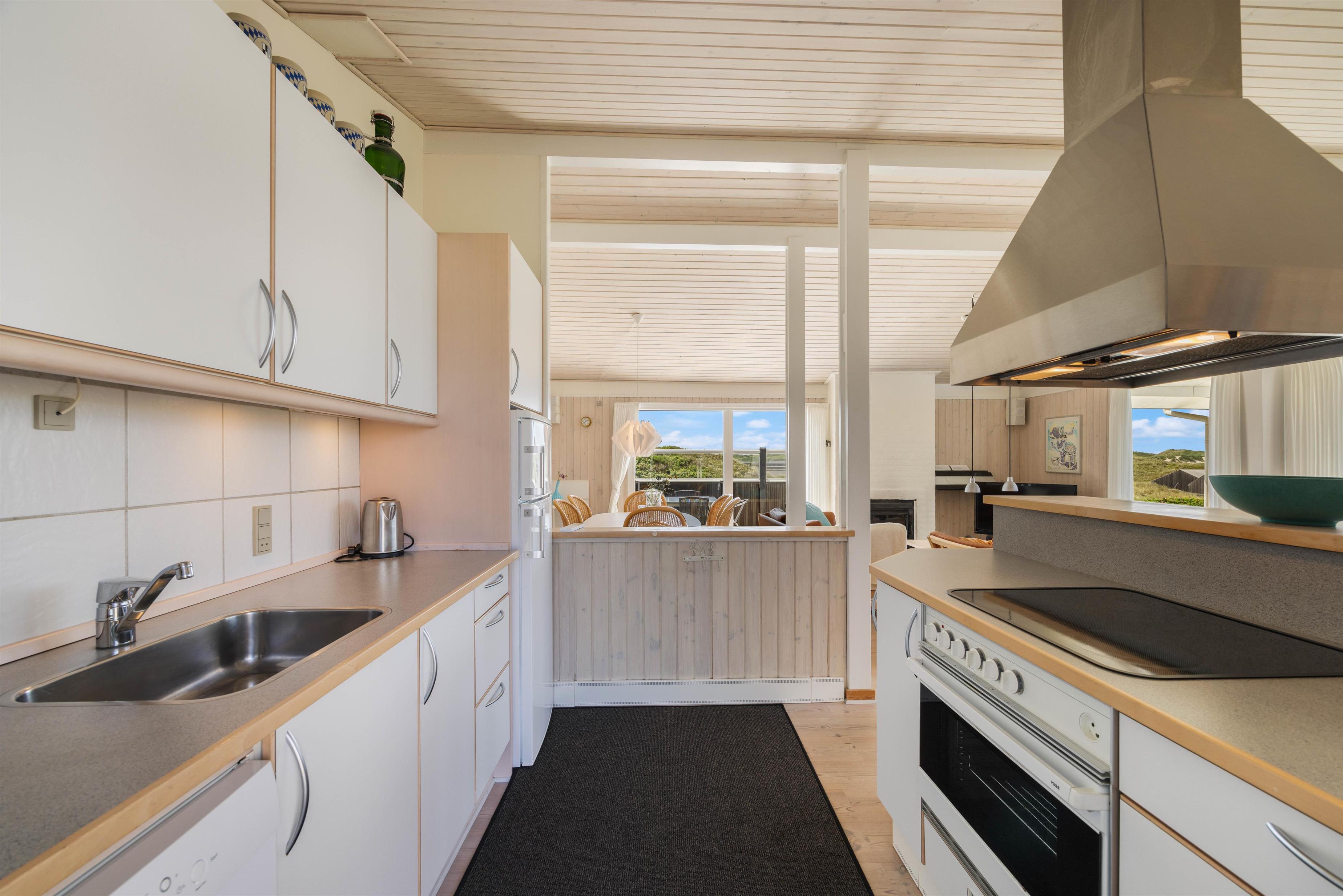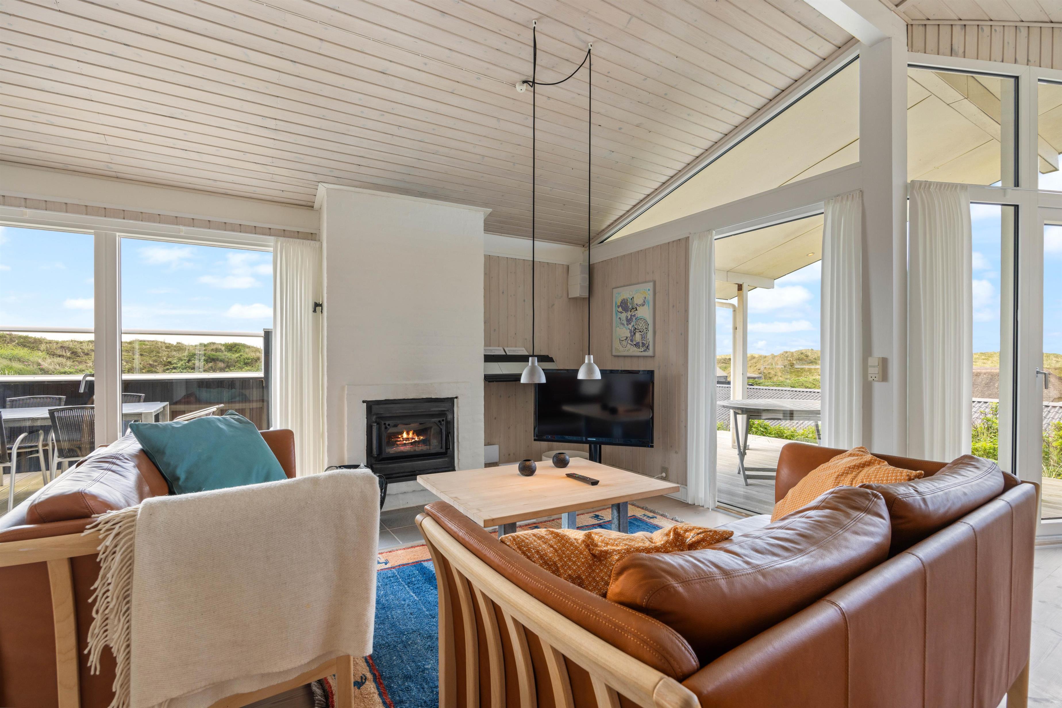 I opholdsstuen finder I en dejlig pejs, som I kan varme jer ved på køligere dage, og fra sofaen har I et skønt kig ud på landskabet udenfor gennem de store panoramavinduer, som også lader en masse sollys ind i boligen. Fra sofaen kan alle følge med i madlavningen og planlægningen af feriens kommende aktiviteter. Opvaskemaskinen klarer hurtigt opvasken på ferien og der er god plads til at samles og nyde et glas vin, mens maden simrer.