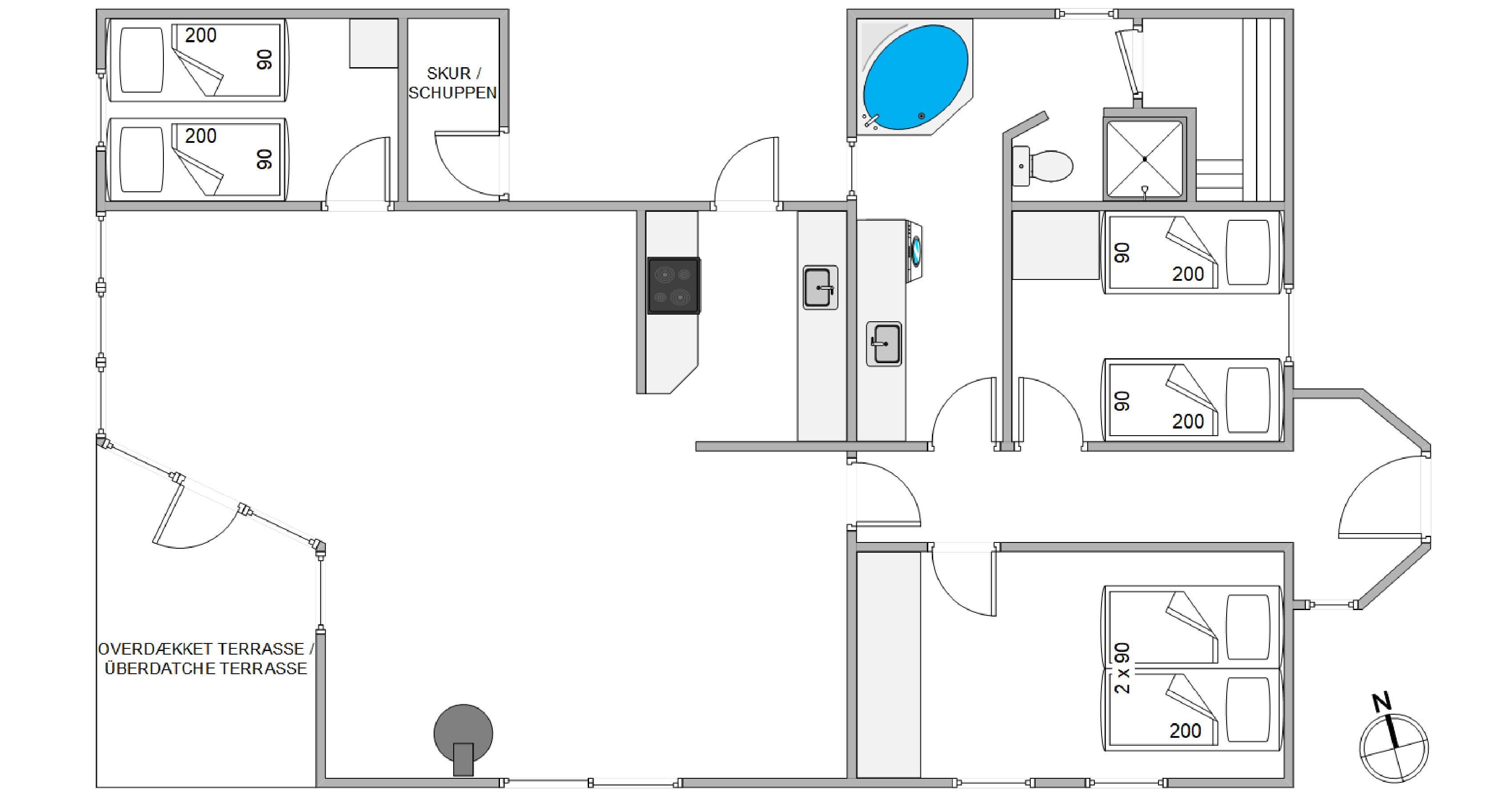 Troldedalen 23 fordeler sig på 3 soverum hvoraf det ene er med dobbeltseng, de 2 andre har enkeltsenge. På badeværelset finder I et af husets absolutte højdepunkter nemlig saunaen og spabadet. Her kan I rigtig sidde og slappe af og lade tankerne flyde mens I nyder varmen og får batterierne ladet op på ny. Der er også gulvvarme på badeværelset og en energibesparende varmepumpe som sørger for behagelig rumtemperatur.