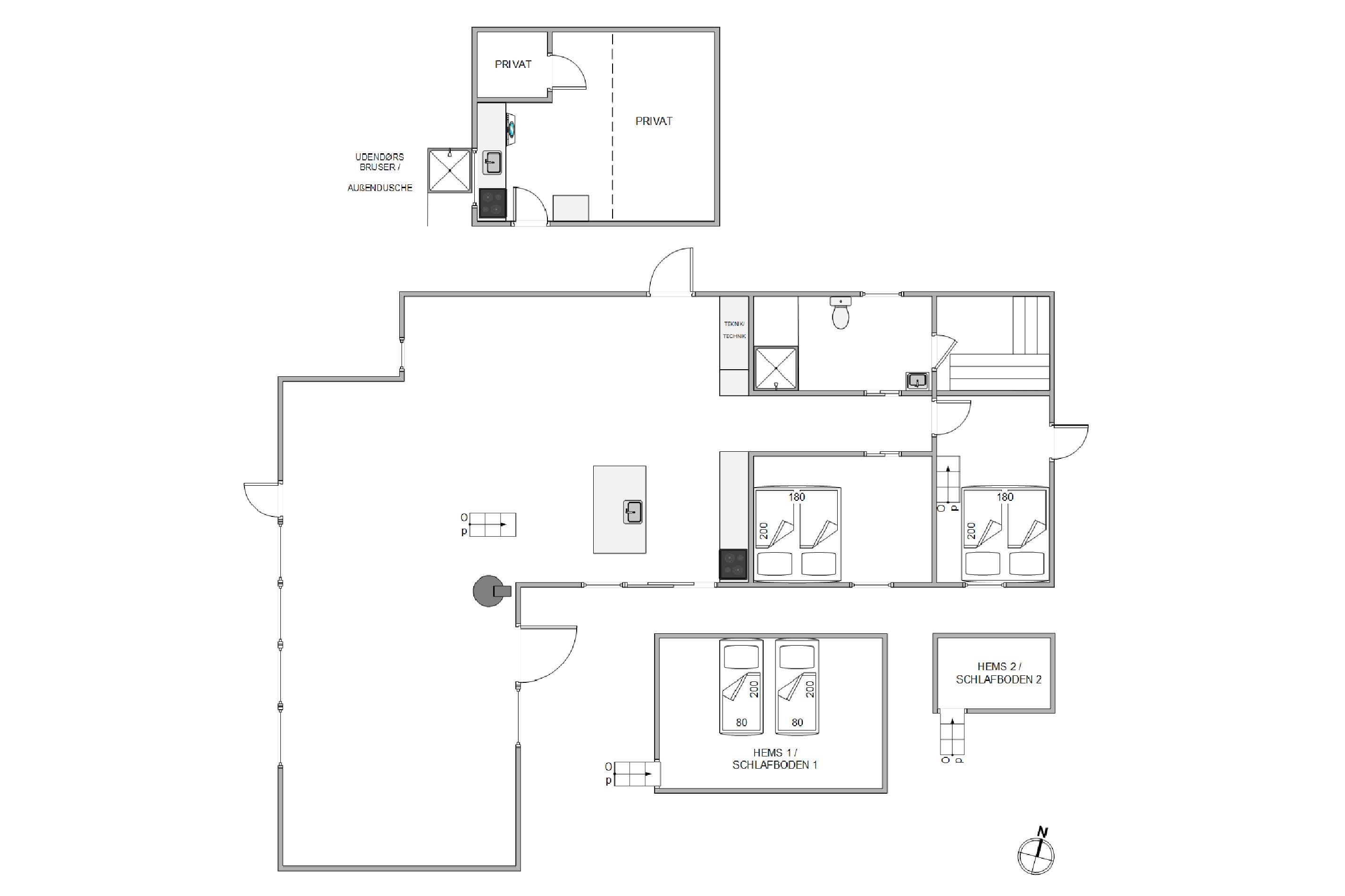 Har I været en tur på stranden, har i mulighed for at skylle det værste sand af kroppen, væk under feriehusets udebruser. OBS. Er åben i perioden april-november.
