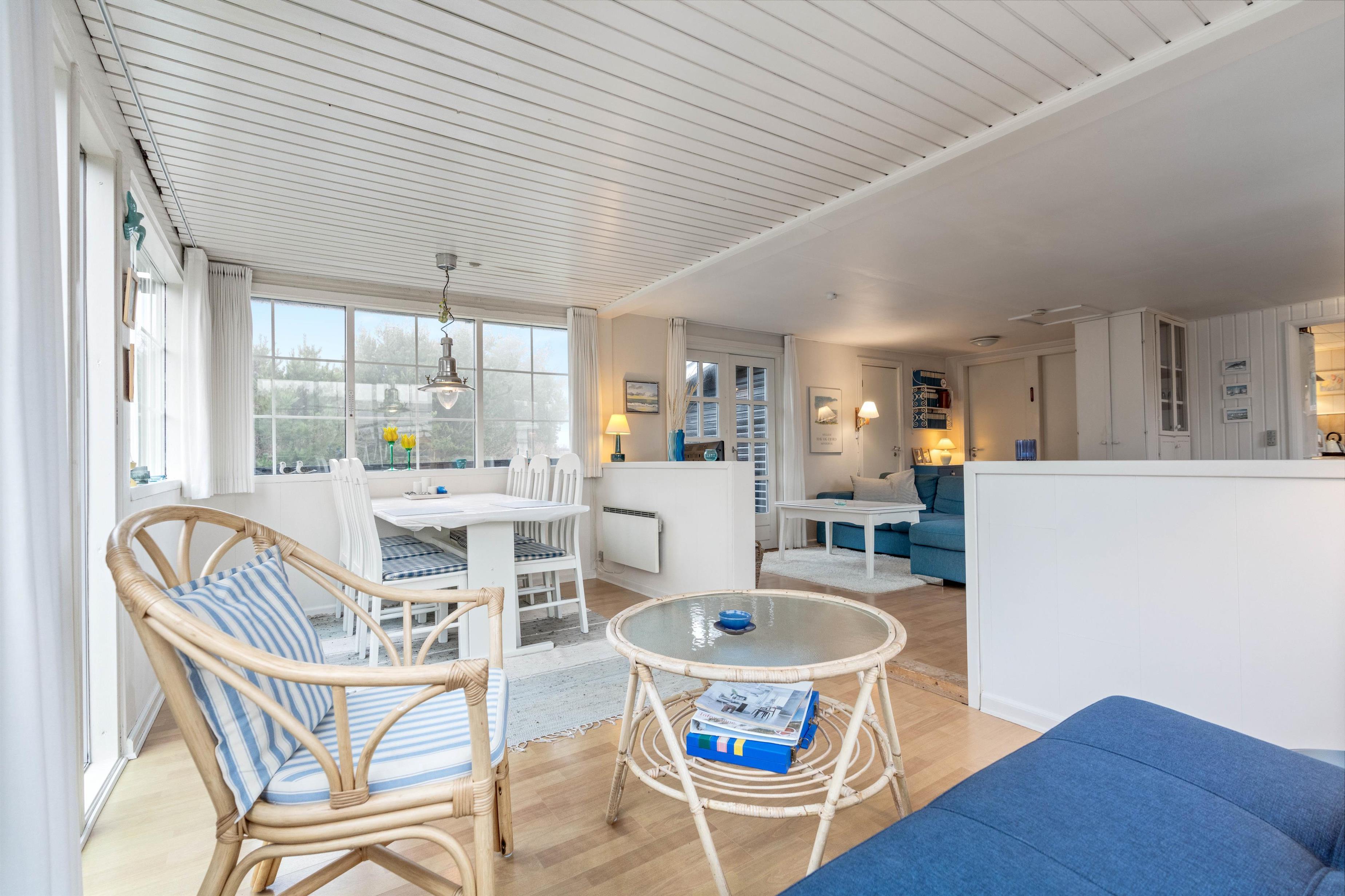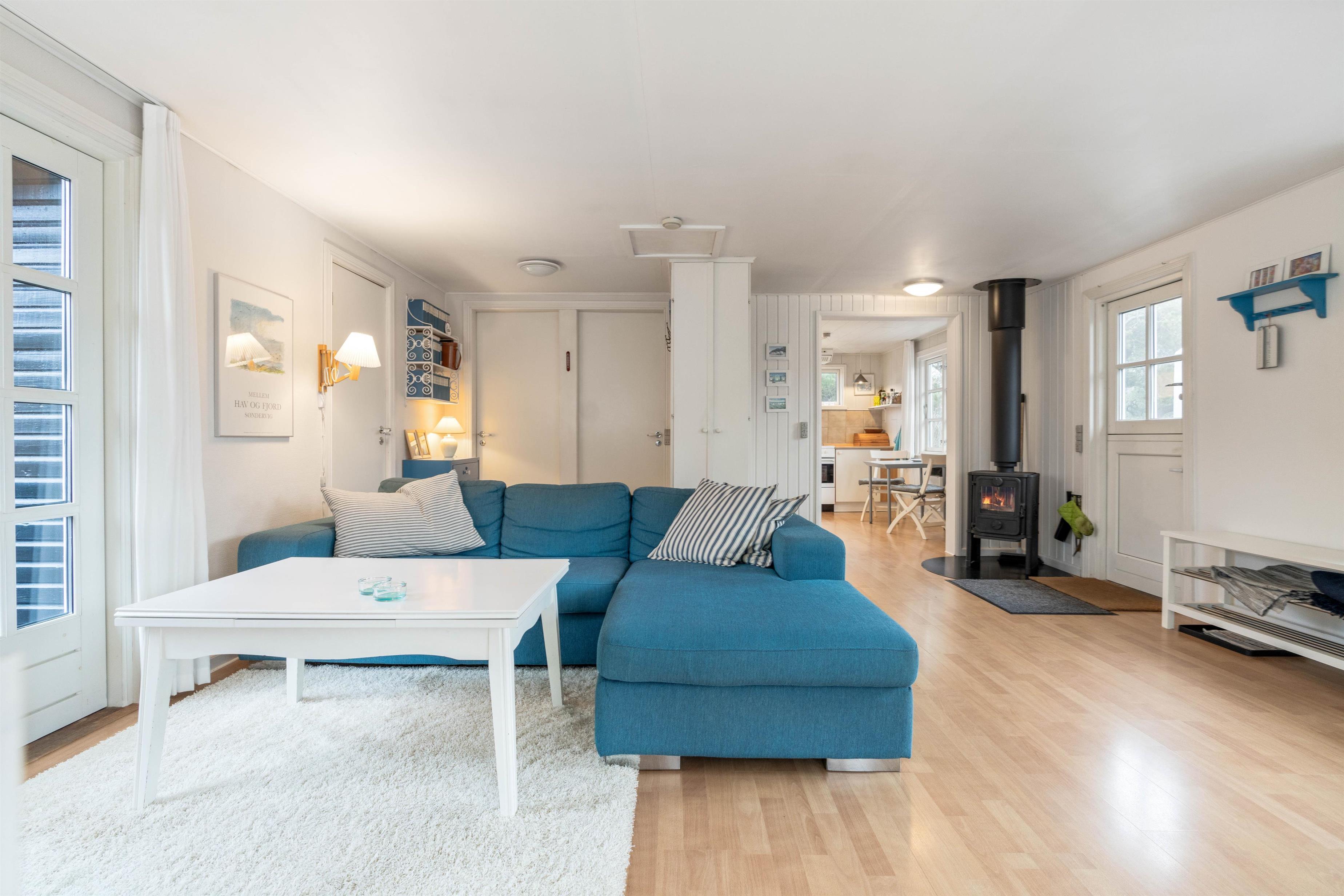Alt i huset fremstår lyst og venligt. Stuen ligger i forbindelse med køkken og spiseplads og er indrettet med behagelige møbler, bløde tekstiler, brændeovn, TV, DVD, radio og CD. Fra stuen er der direkte udgang til udestuen, hvorfra I kan betragte den skønne natur gennem vinduerne.