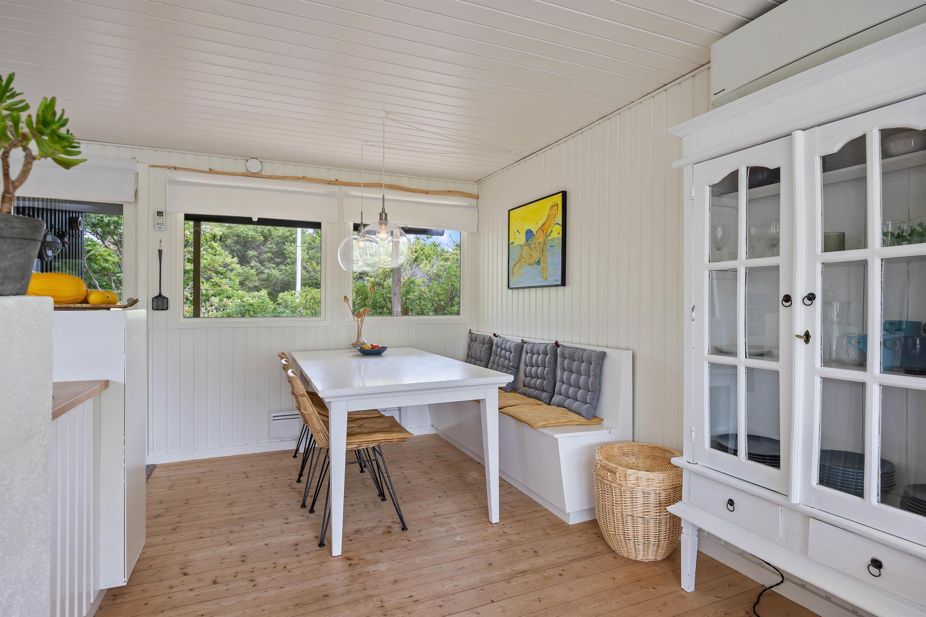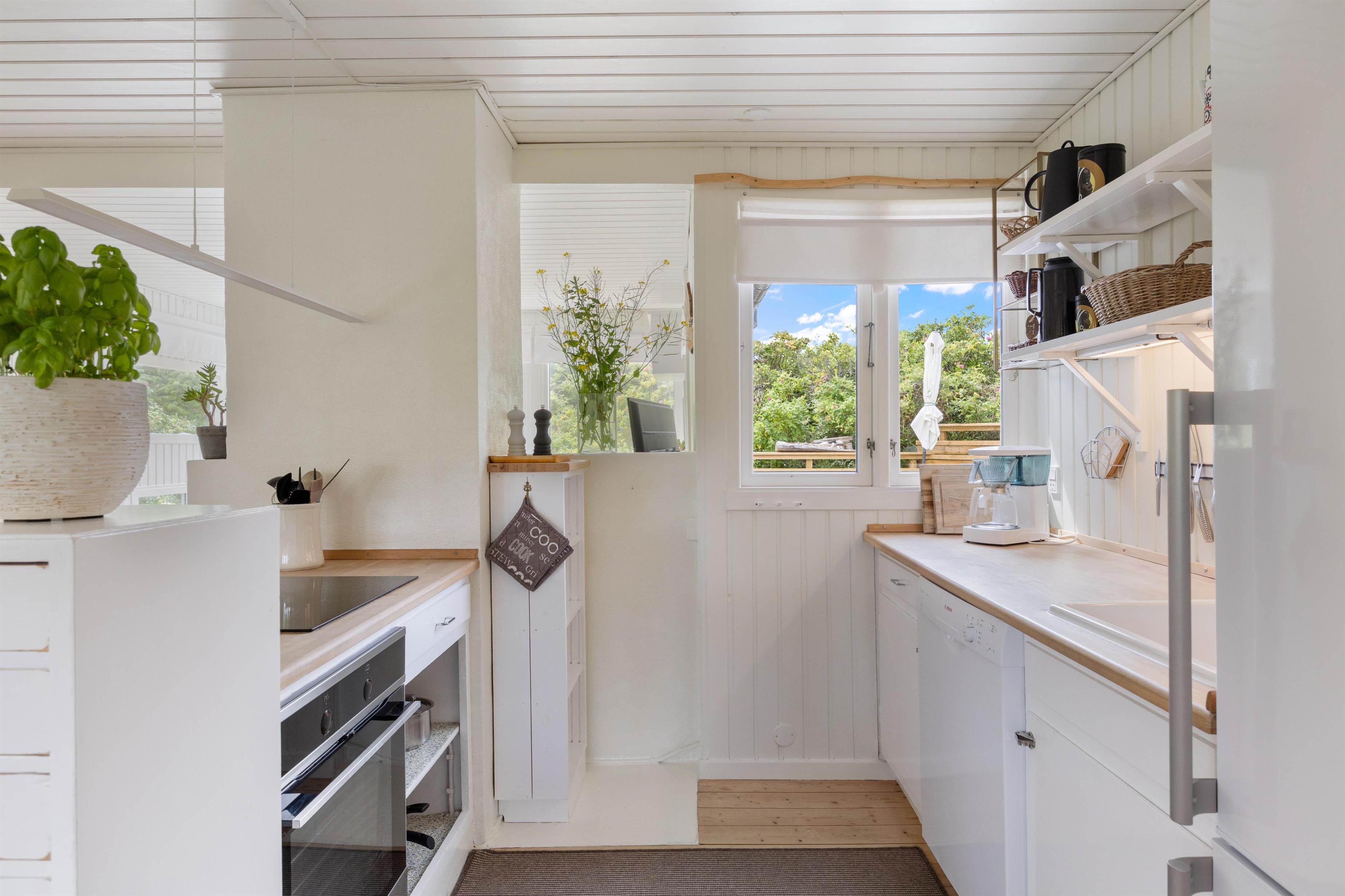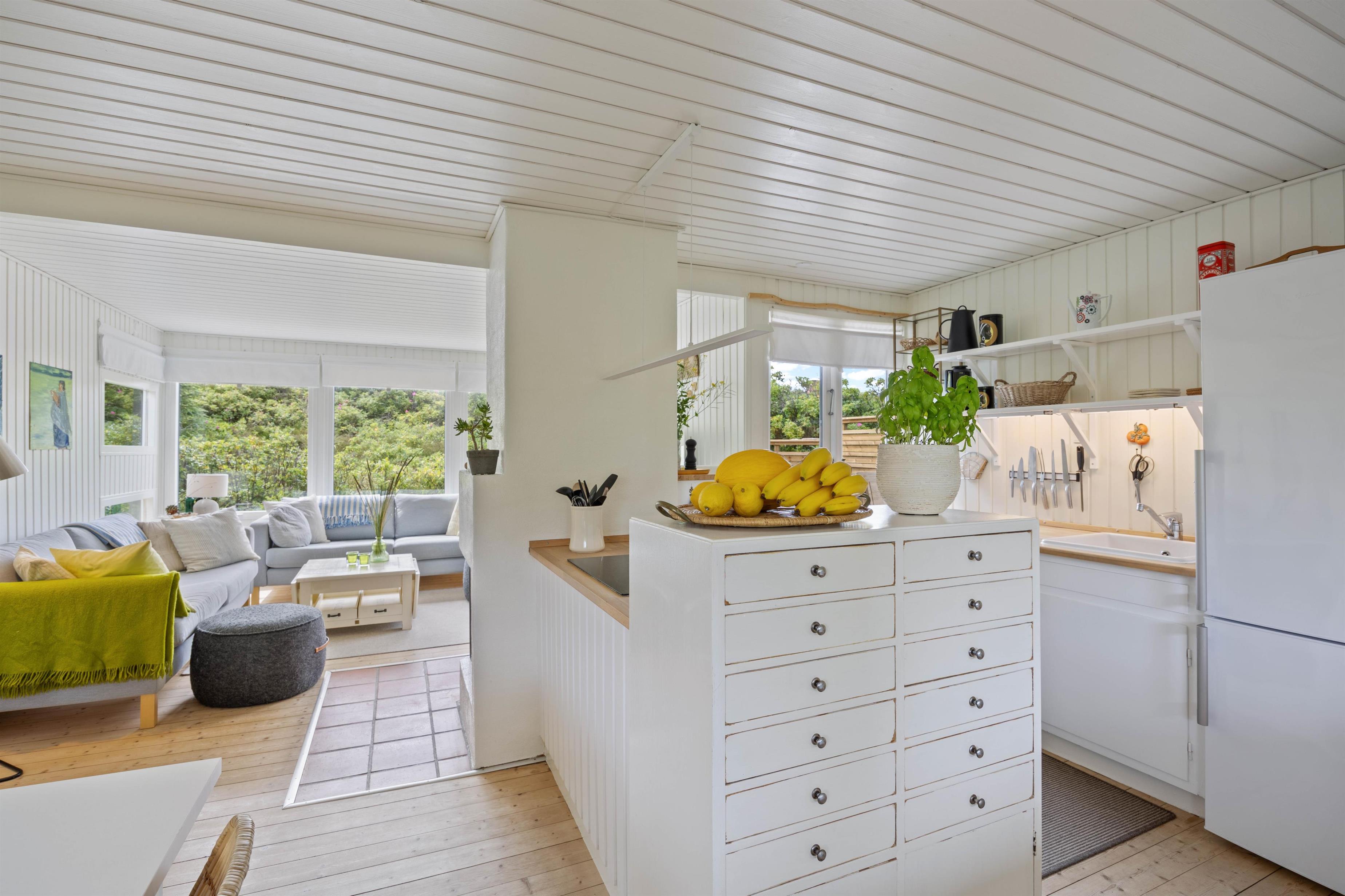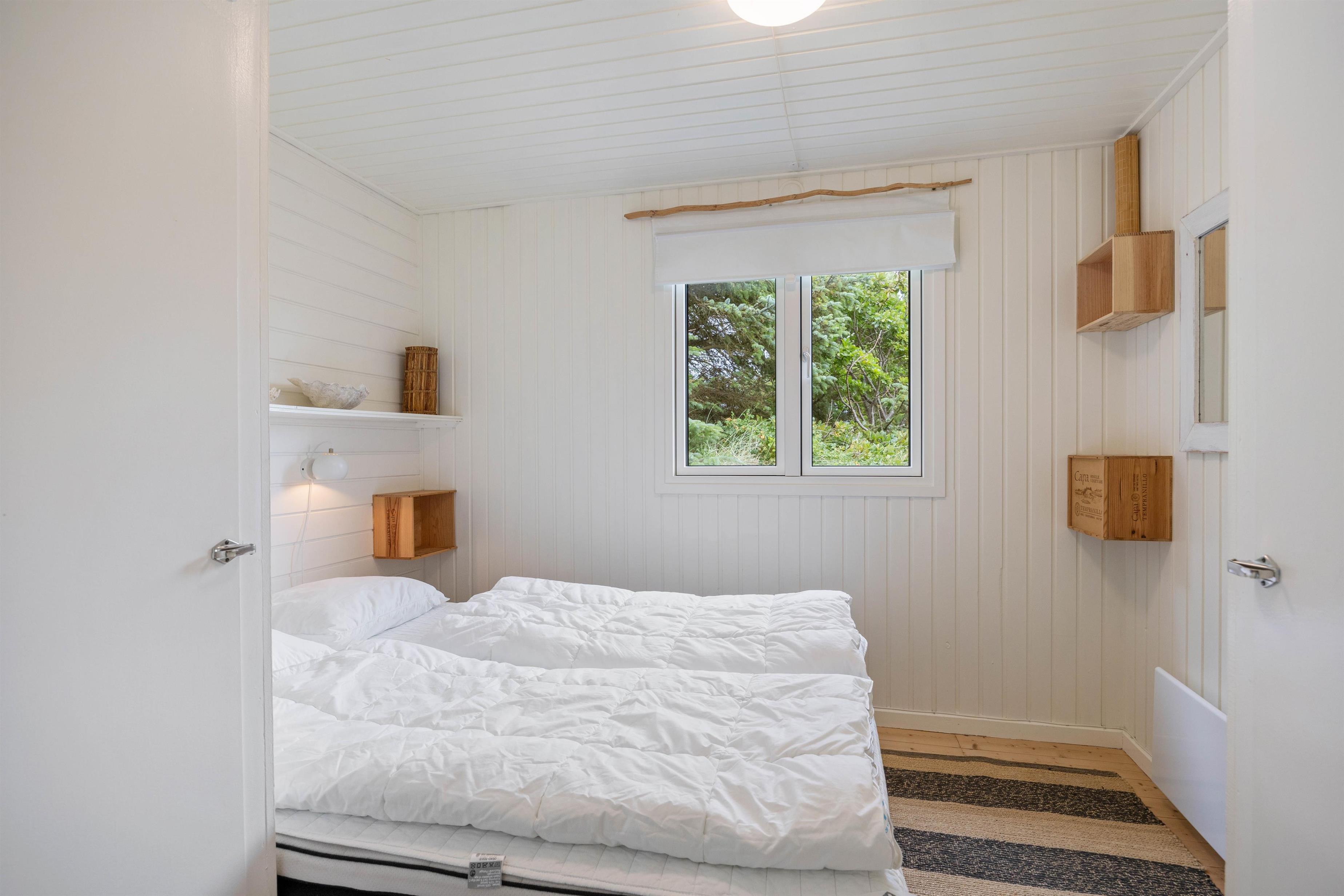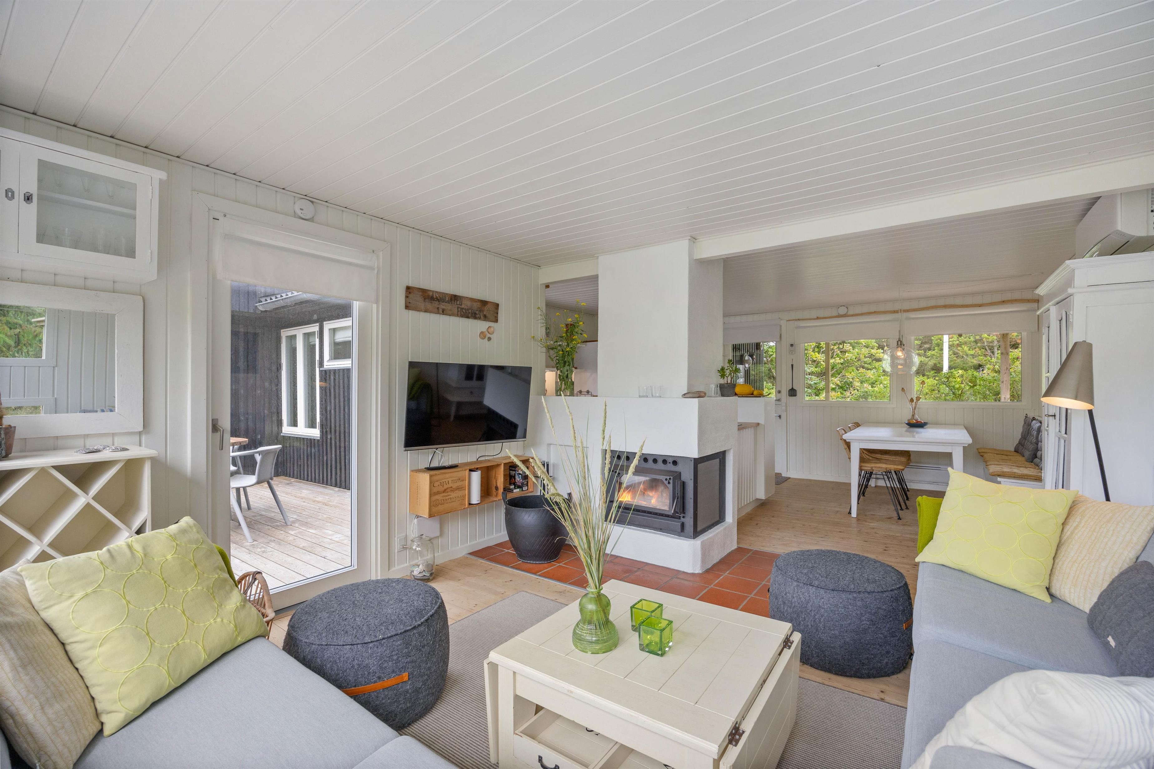 Indvendigt i sommerhuset er den klassiske sommerhusstil gennemført. Vægge, lofter og gulve er holdt i lyse og imødekommende nuancer, som skaber en rar og hyggelig atmosfære i indretningen. Samtidig sørger husets vinduer for at lukke både lyset og naturen indenfor. Fra stuen er der en dejlig udsigt til landskabet udenfor. På kolde dage kan I tænde op i pejsen og nyde lyden af knitrende brænde og lyset fra flammerne. Huset er godt indrettet med tre soverum med plads til fem personer og to hunde. Huset har både opvaskemaskine, vaskemaskine og tørretumbler, så I kan fokusere på at slappe af og nyde ferien, mens maskinerne klarer arbejdet for jer.