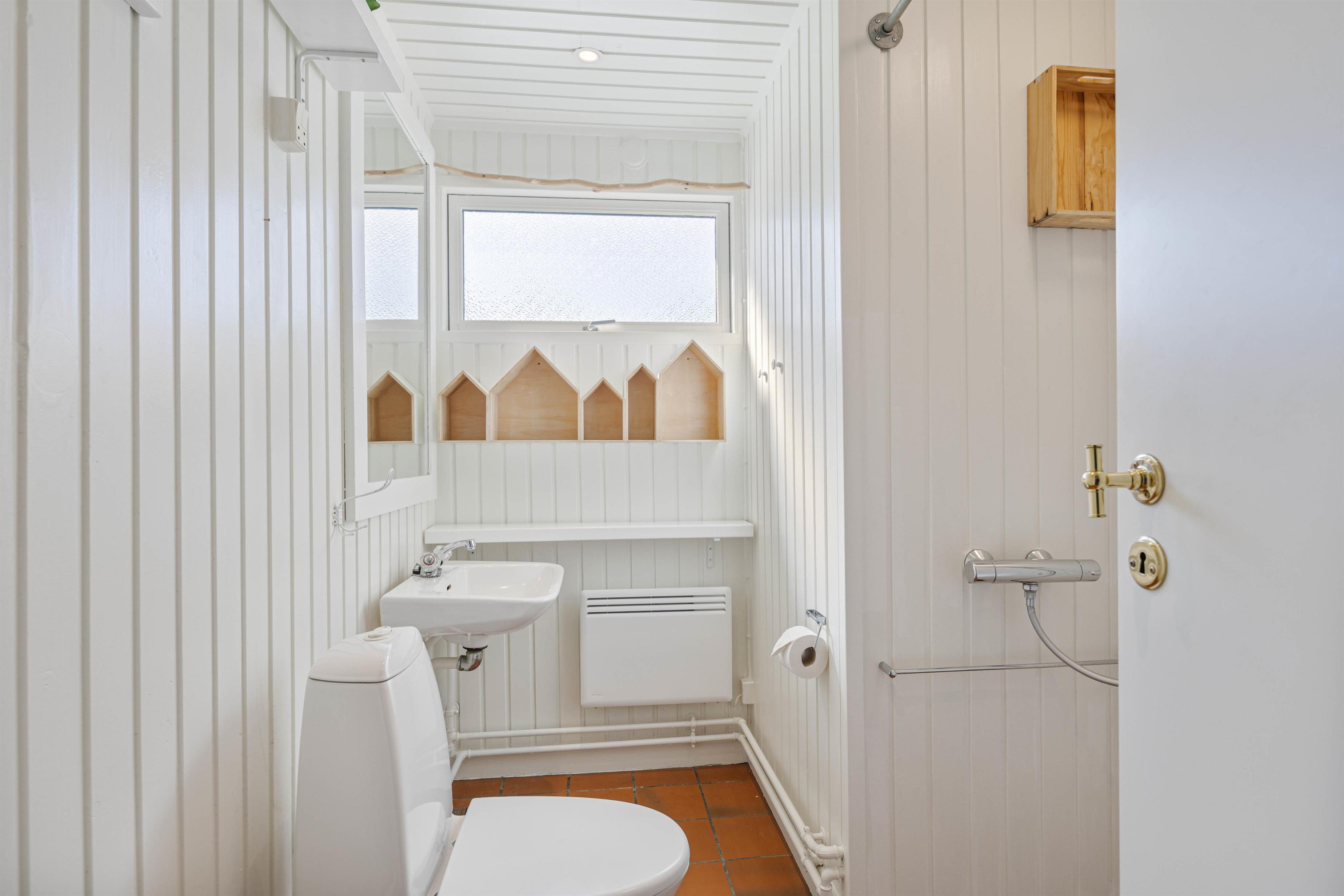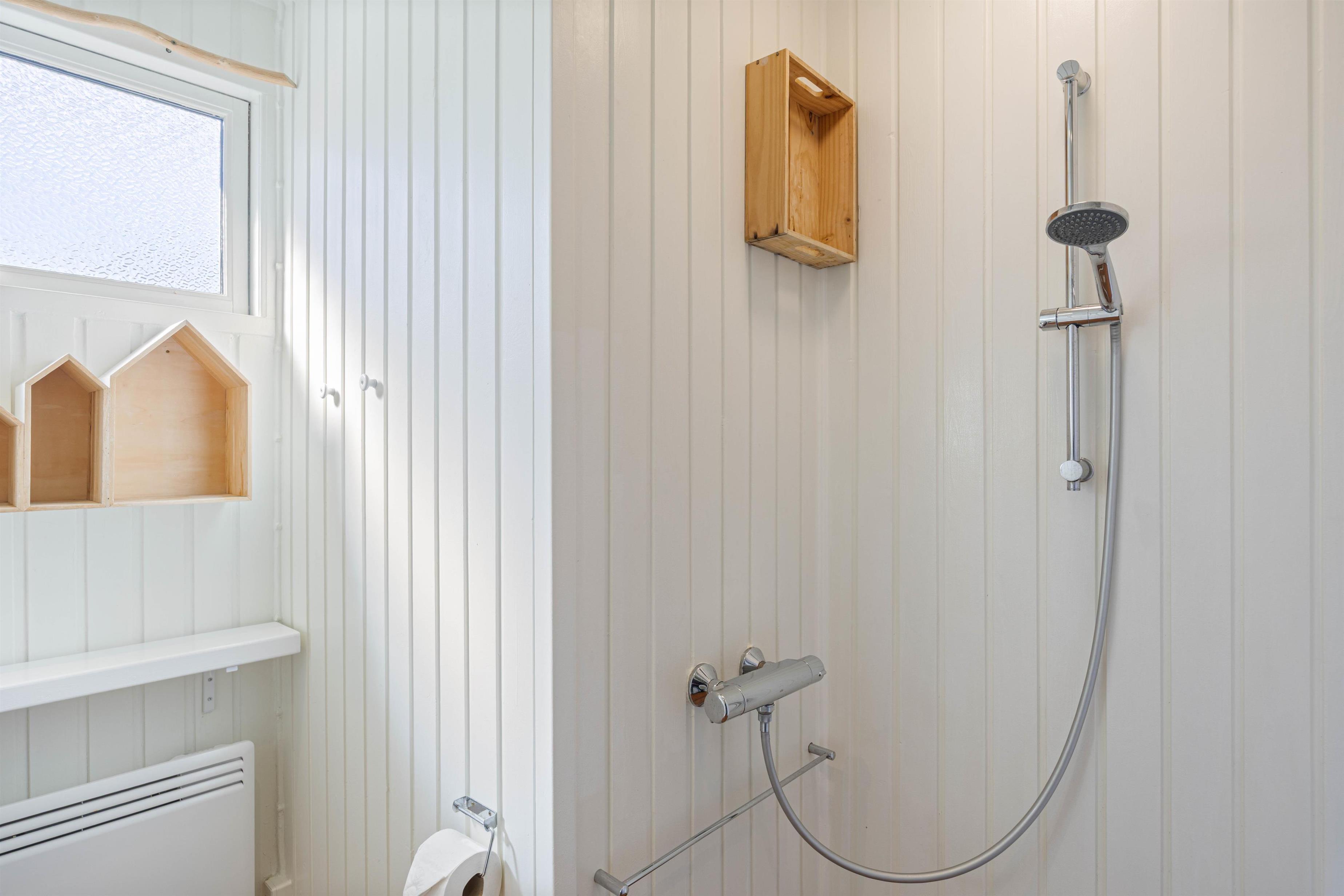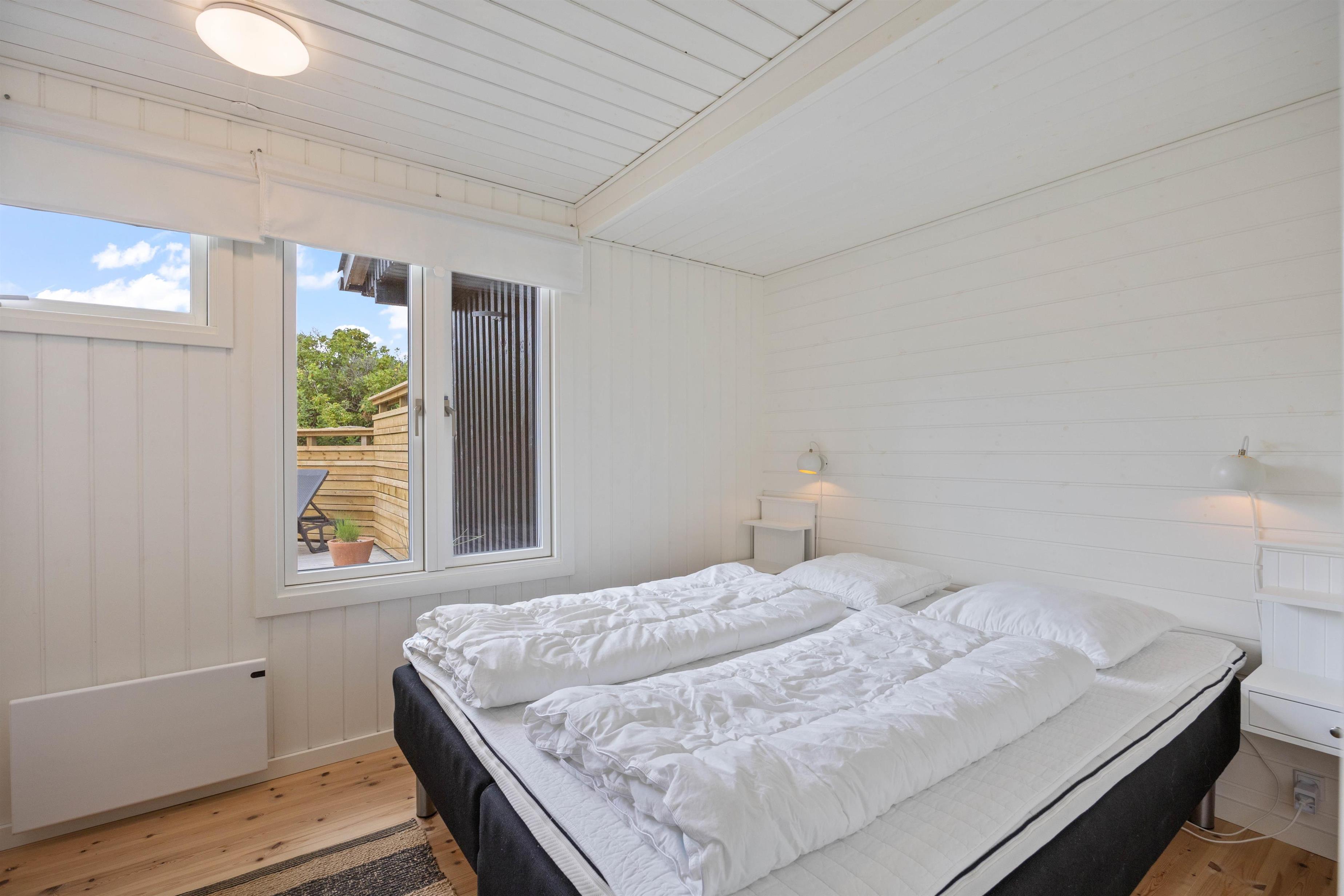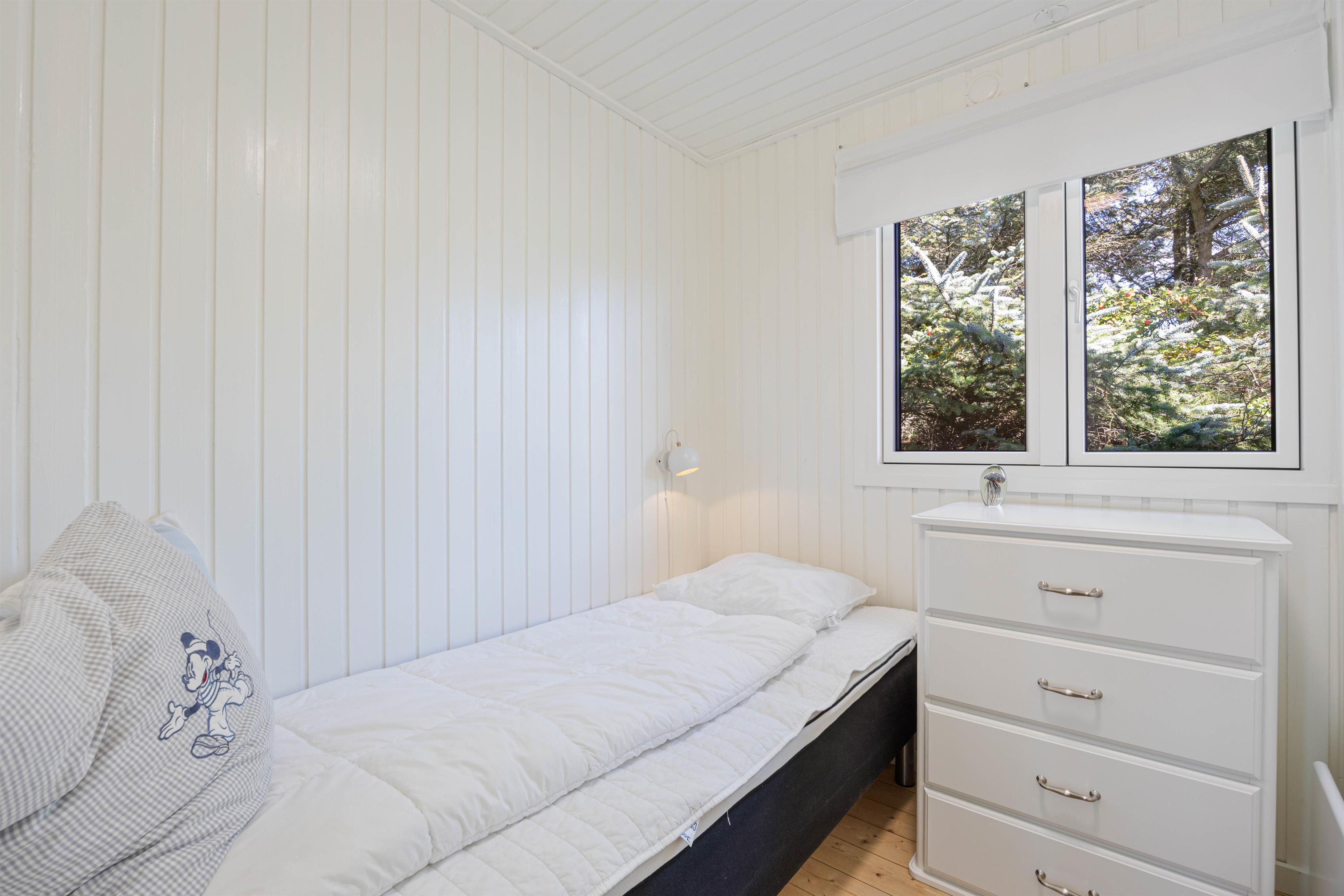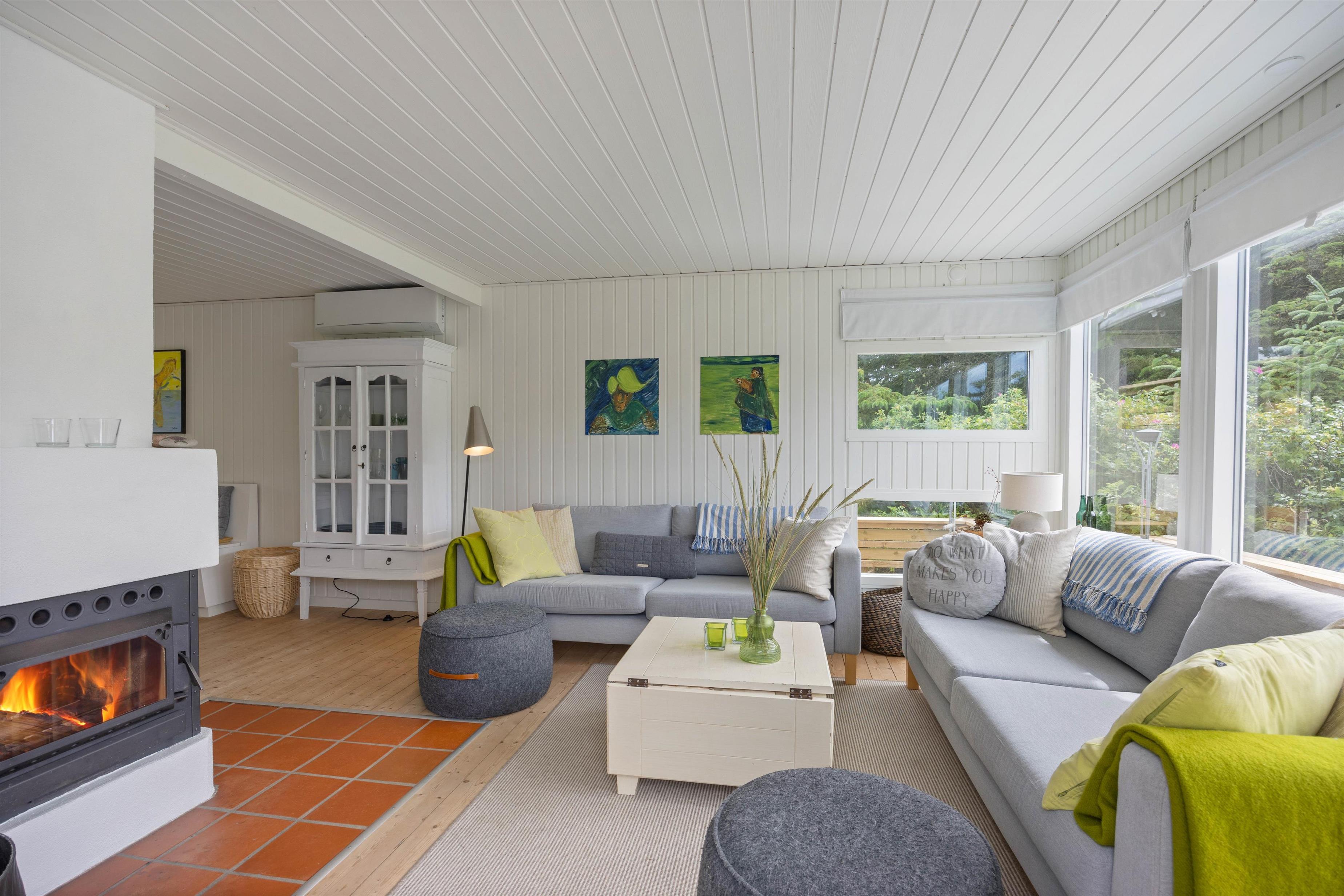 Indvendigt i sommerhuset er den klassiske sommerhusstil gennemført. Vægge, lofter og gulve er holdt i lyse og imødekommende nuancer, som skaber en rar og hyggelig atmosfære i indretningen. Samtidig sørger husets vinduer for at lukke både lyset og naturen indenfor. Fra stuen er der en dejlig udsigt til landskabet udenfor. På kolde dage kan I tænde op i pejsen og nyde lyden af knitrende brænde og lyset fra flammerne. Huset er godt indrettet med tre soverum med plads til fem personer og to hunde. Huset har både opvaskemaskine, vaskemaskine og tørretumbler, så I kan fokusere på at slappe af og nyde ferien, mens maskinerne klarer arbejdet for jer.
