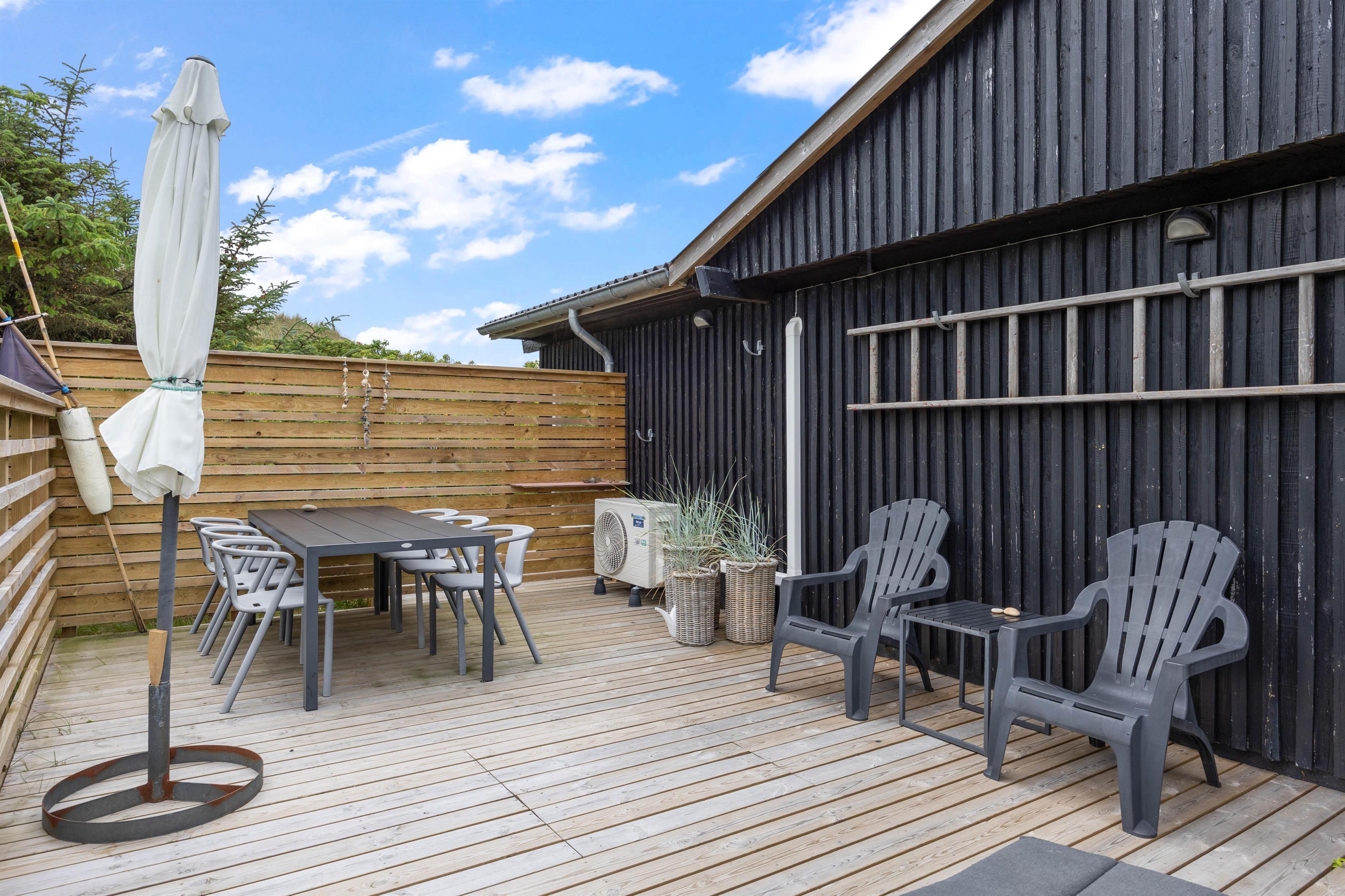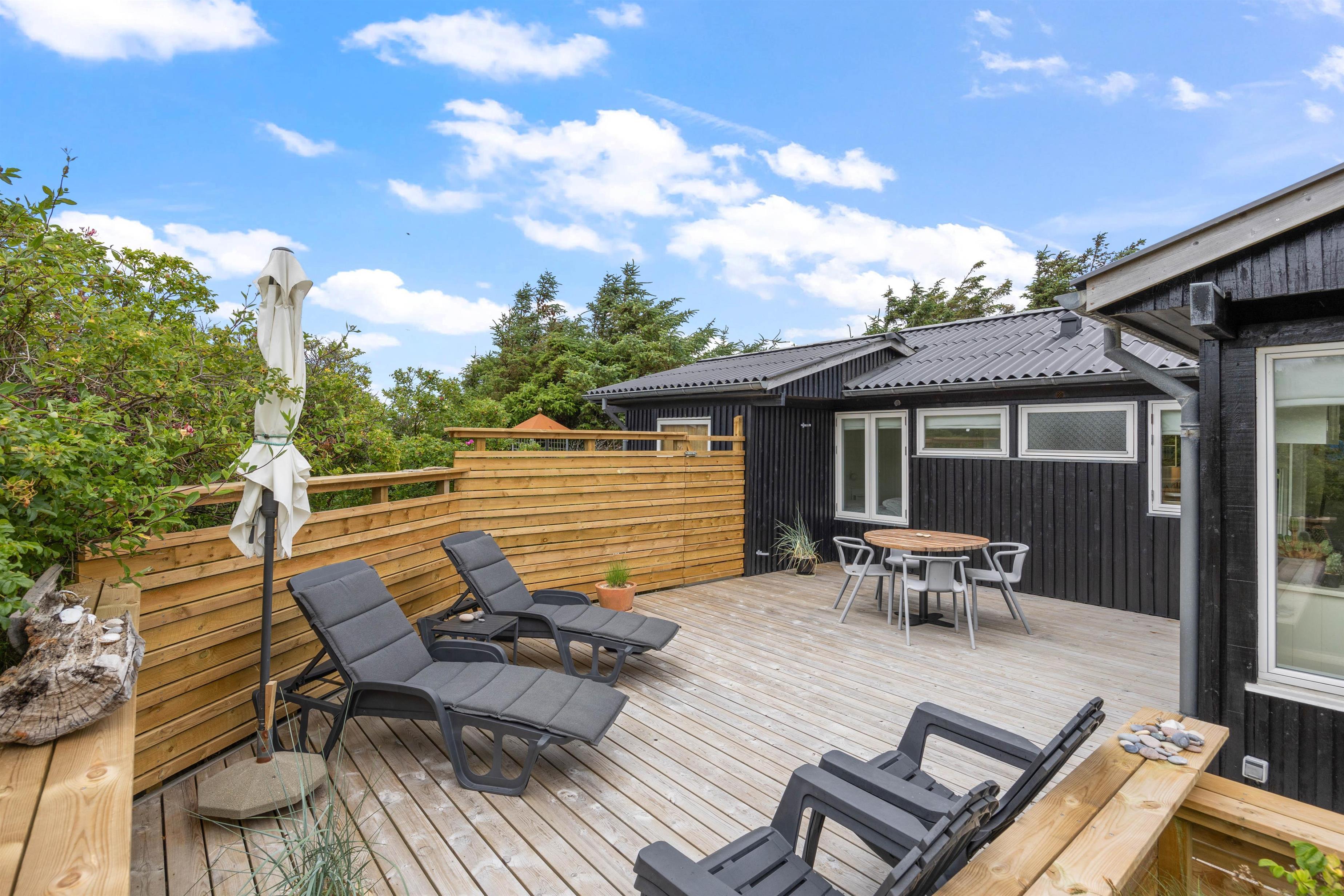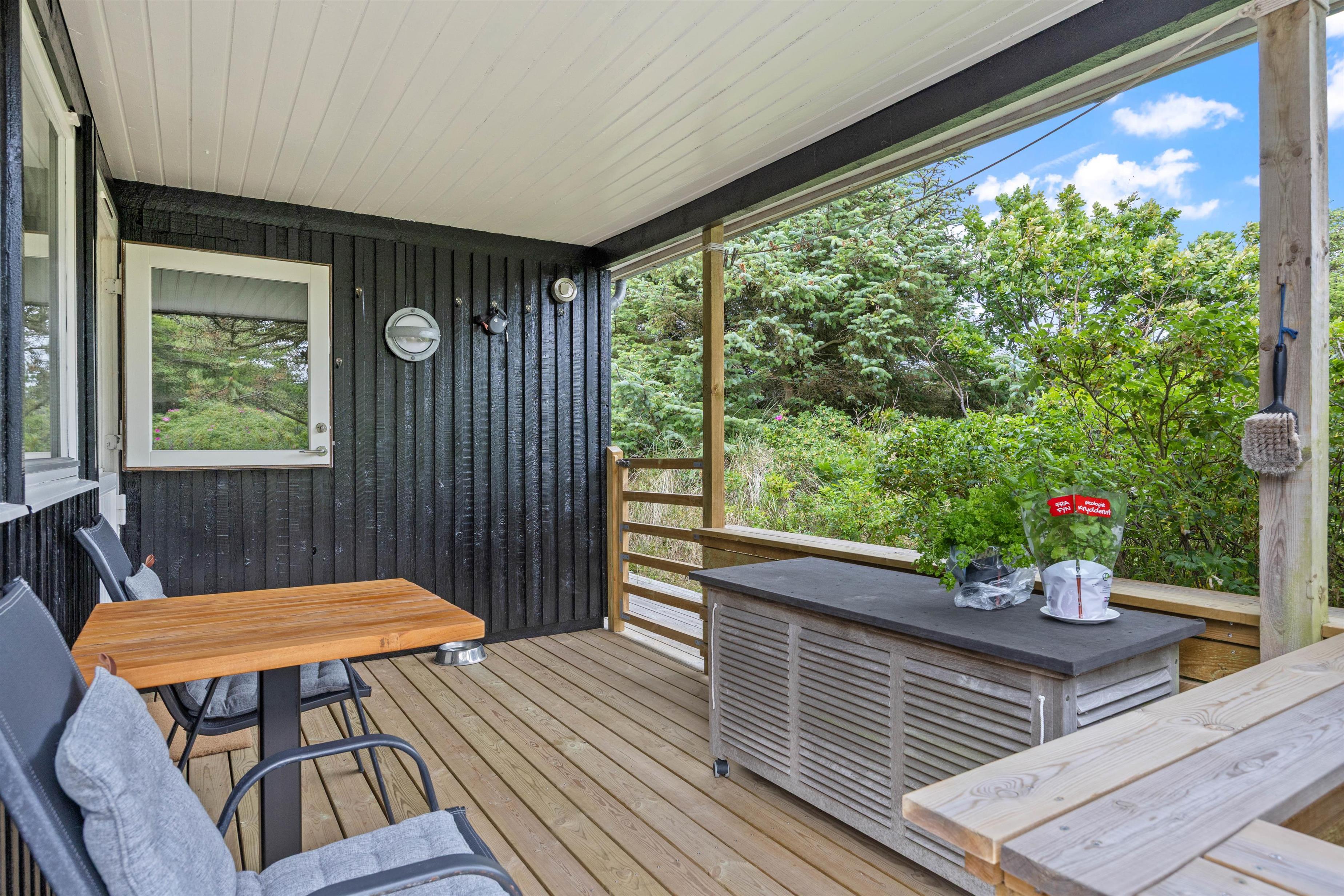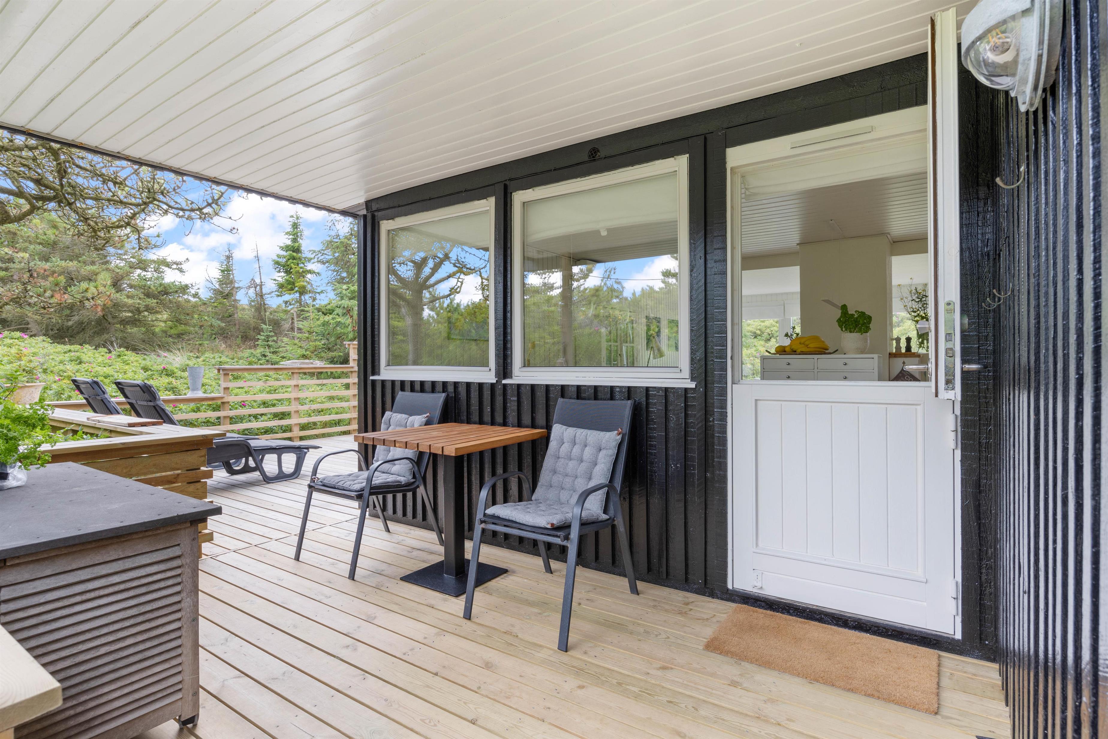 Det hyggelige sommerhus emmer af klassisk sommerhusstemning. Det sortmalede træhus ligger gemt i landskabet bag marehalm og småbuske. Det giver sommerhuset en dejlig, ugeneret placering i landskabet, der samtidig skaber hyggelige udeoaser rundt om huset, hvor I kan sidde i fred og ro og nyde feriens ro og nærvær. Noget af terrassen er også overdækket, hvilket giver jeg mulighed for at nyde noget udetid uanset vind og vejr. På terrasseområdet er der havemøbler, liggestole og grill, så I har mulighed for at nyde udelivet og de dejlige omgivelser og grille en lækker frokost her.