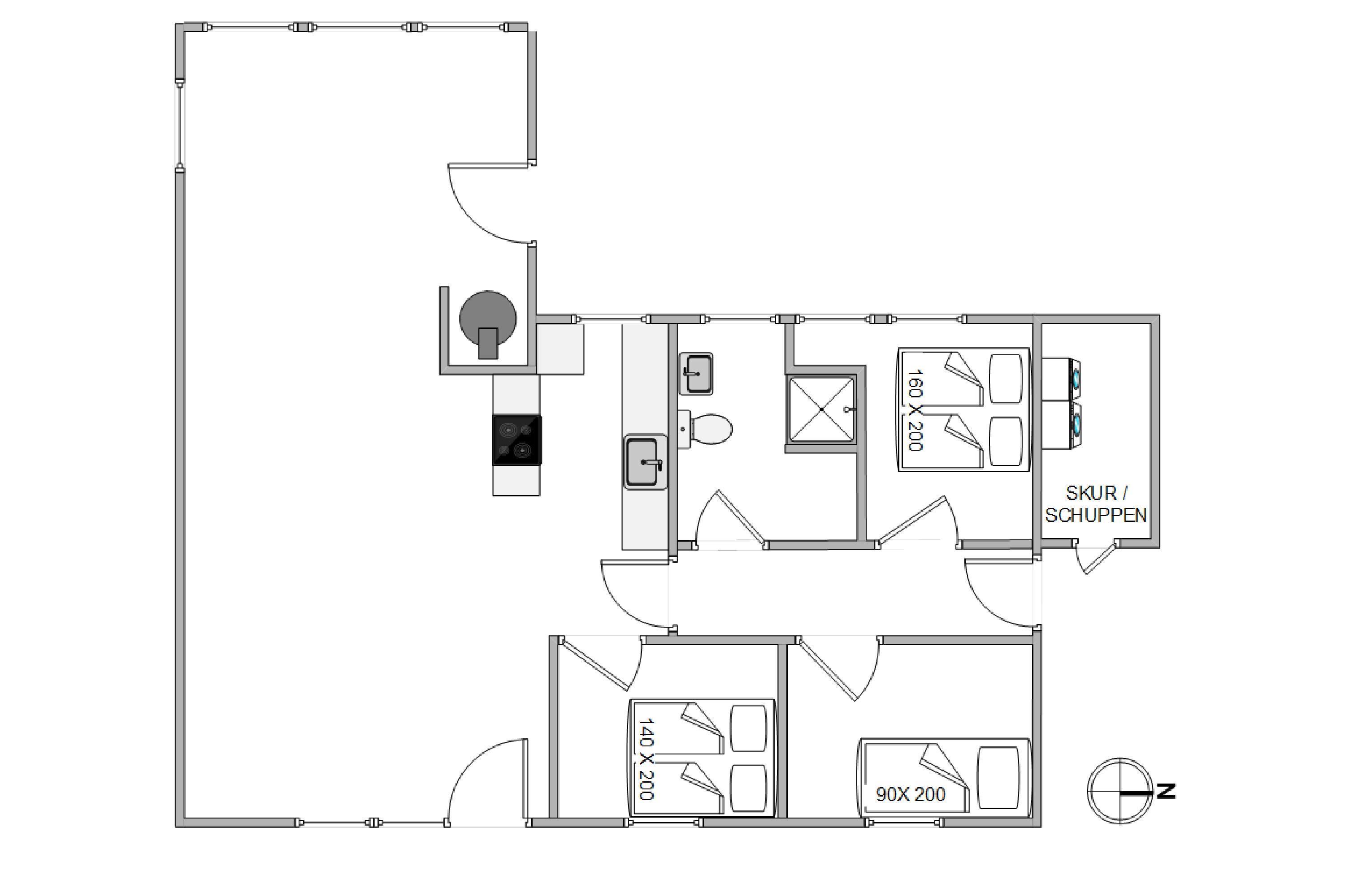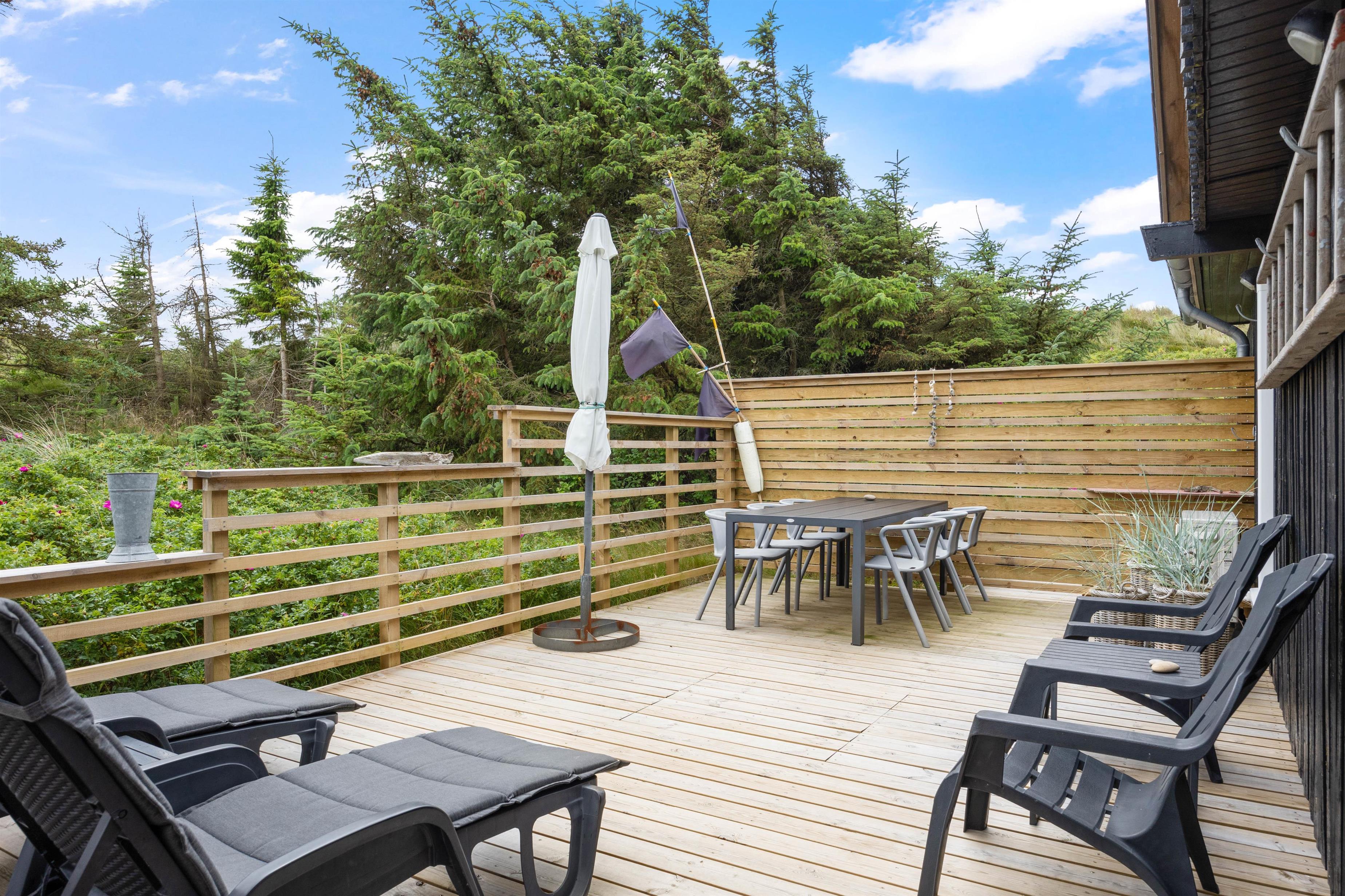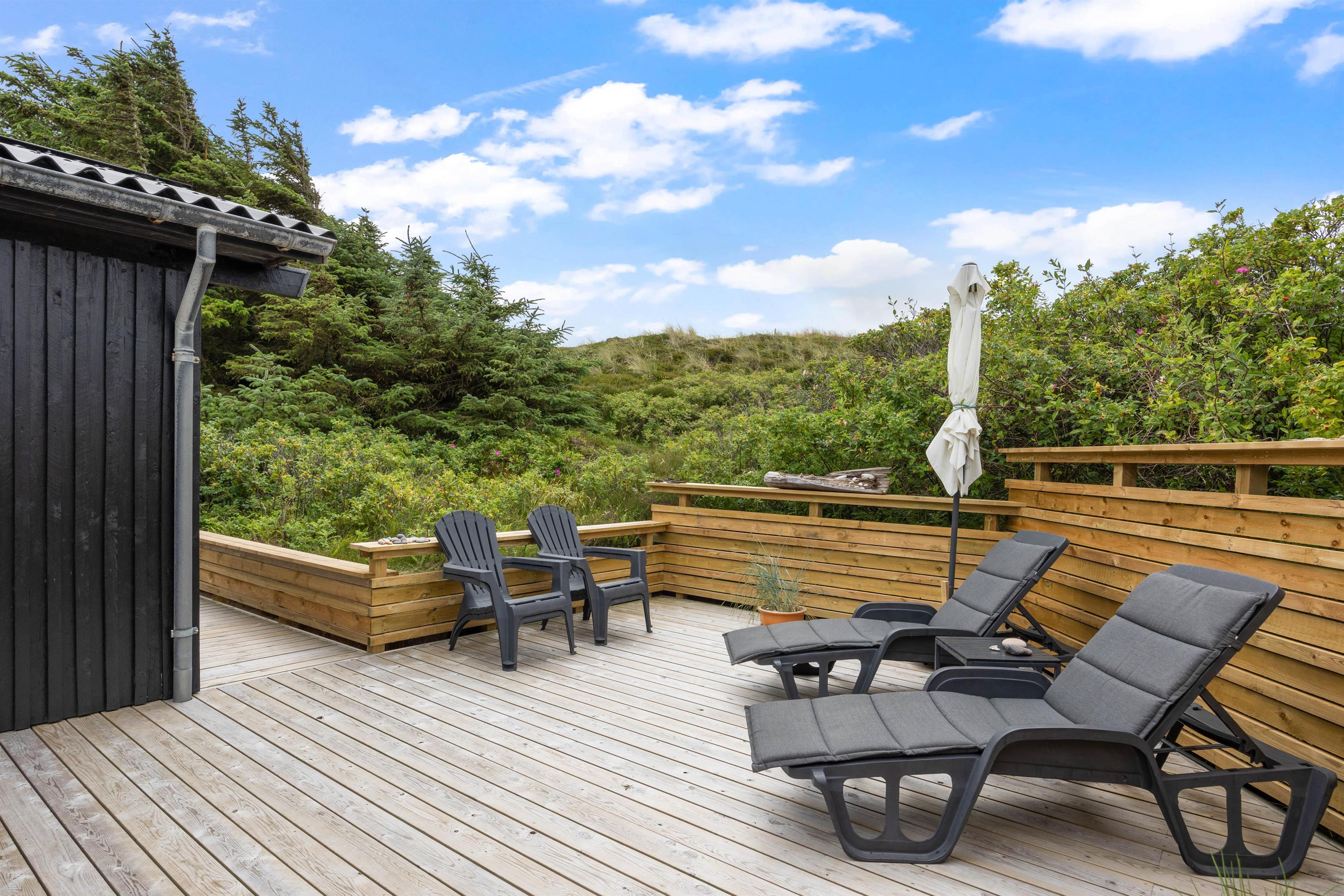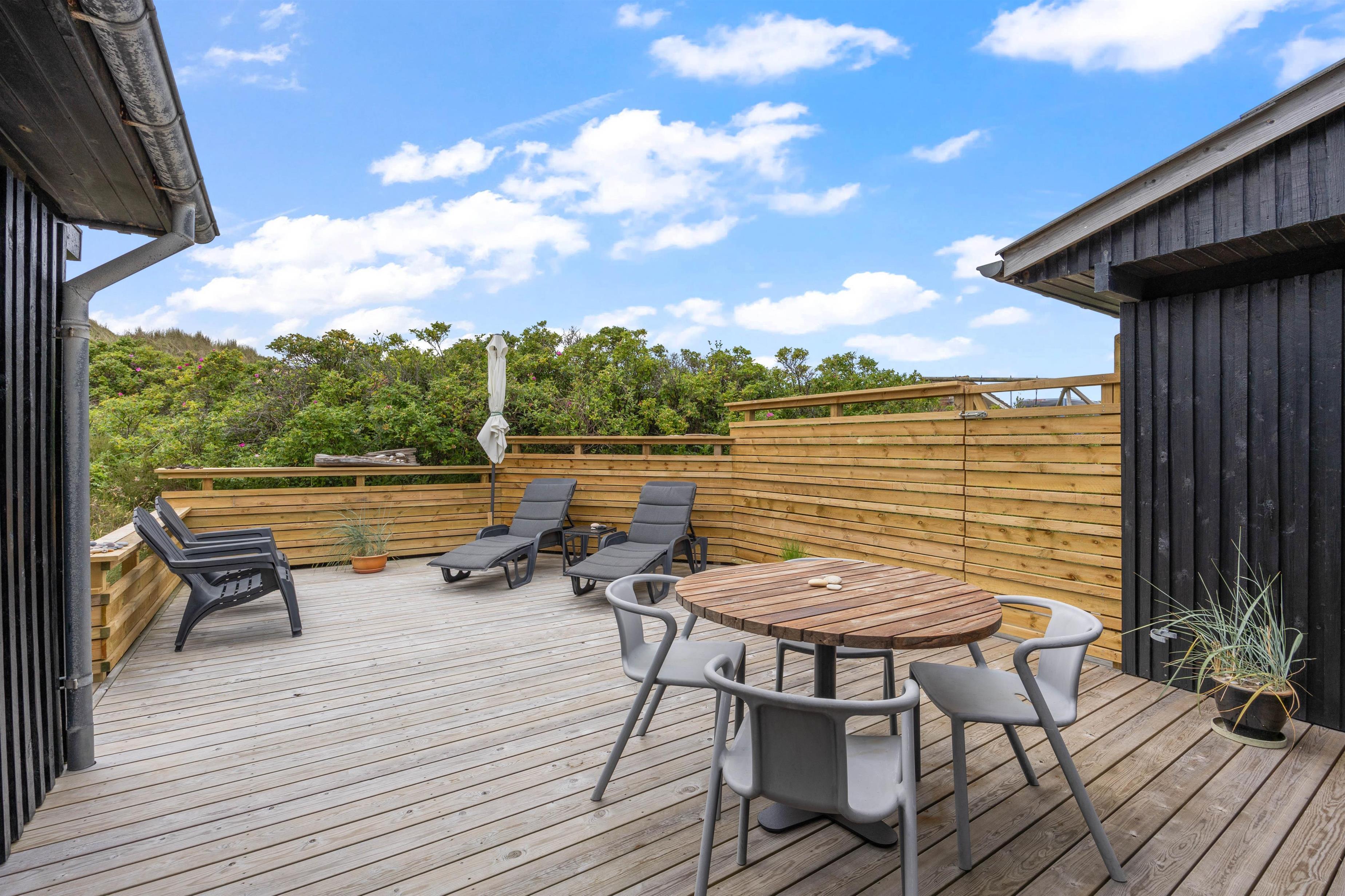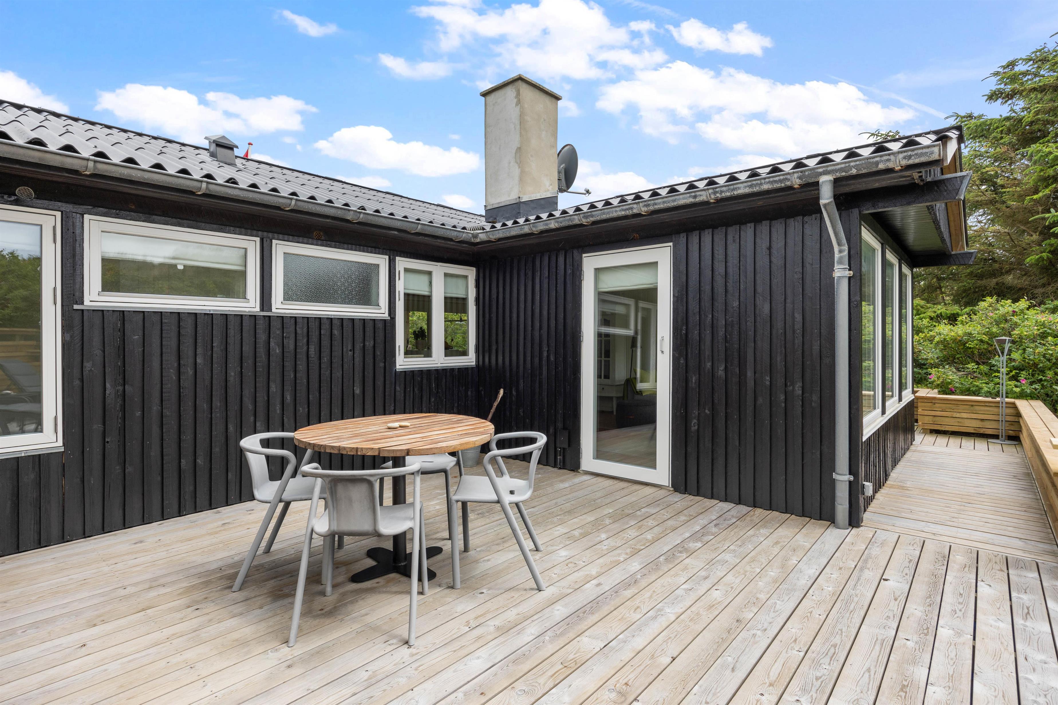 Det hyggelige sommerhus emmer af klassisk sommerhusstemning. Det sortmalede træhus ligger gemt i landskabet bag marehalm og småbuske. Det giver sommerhuset en dejlig, ugeneret placering i landskabet, der samtidig skaber hyggelige udeoaser rundt om huset, hvor I kan sidde i fred og ro og nyde feriens ro og nærvær. Noget af terrassen er også overdækket, hvilket giver jeg mulighed for at nyde noget udetid uanset vind og vejr. På terrasseområdet er der havemøbler, liggestole og grill, så I har mulighed for at nyde udelivet og de dejlige omgivelser og grille en lækker frokost her.