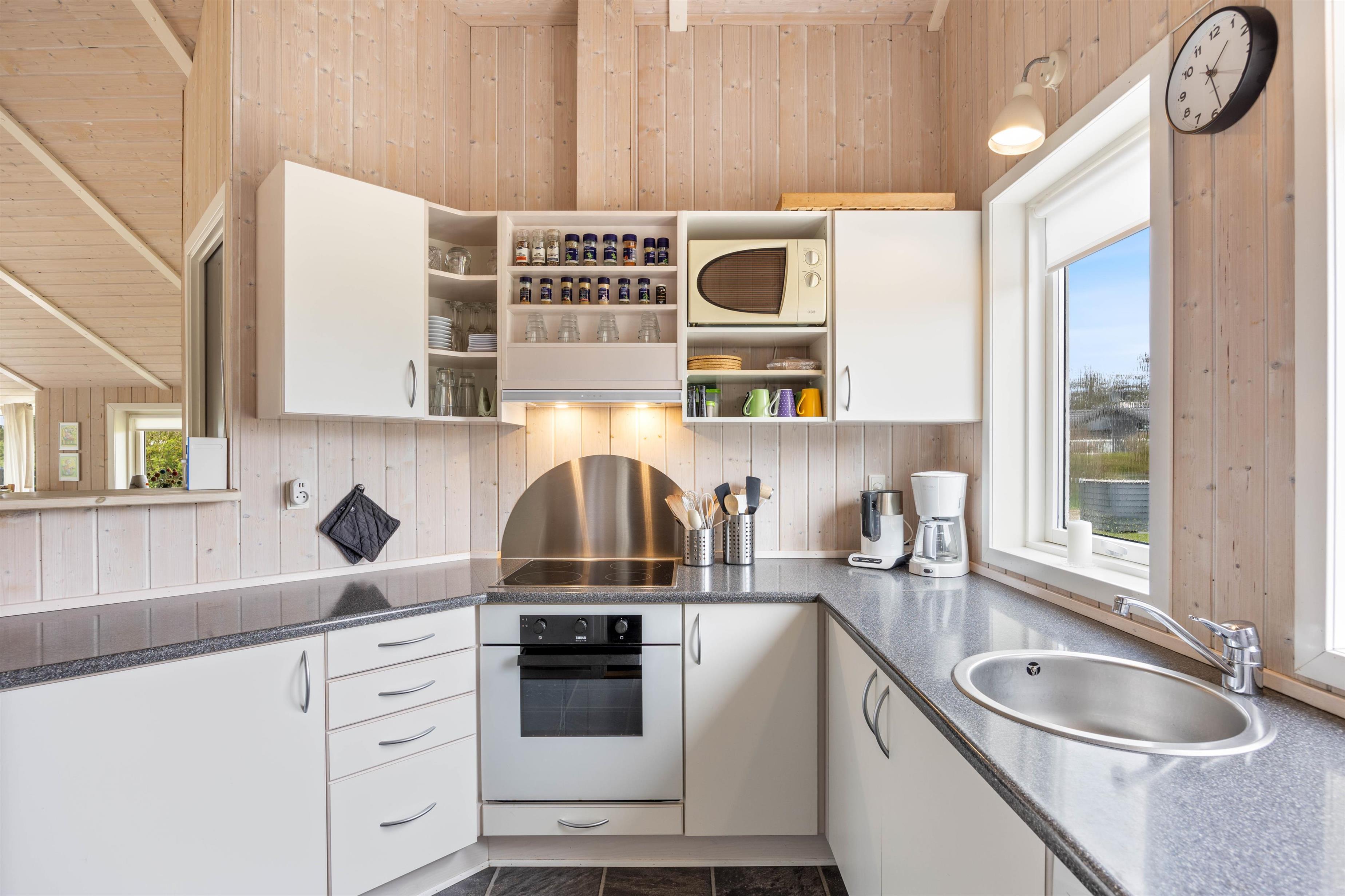 Et dejligt sommerhus med en hyggelig atmosfære, der emmer af sommerhus. Her er klassiske træpaneler på væggene, de rolige nuancer og den gode loftshøjde giver en rummelig fornemmelse. Sommerhuset på 105 m² byder på et stort åbent køkkenalrum, hvor der er god plads til at samles.
