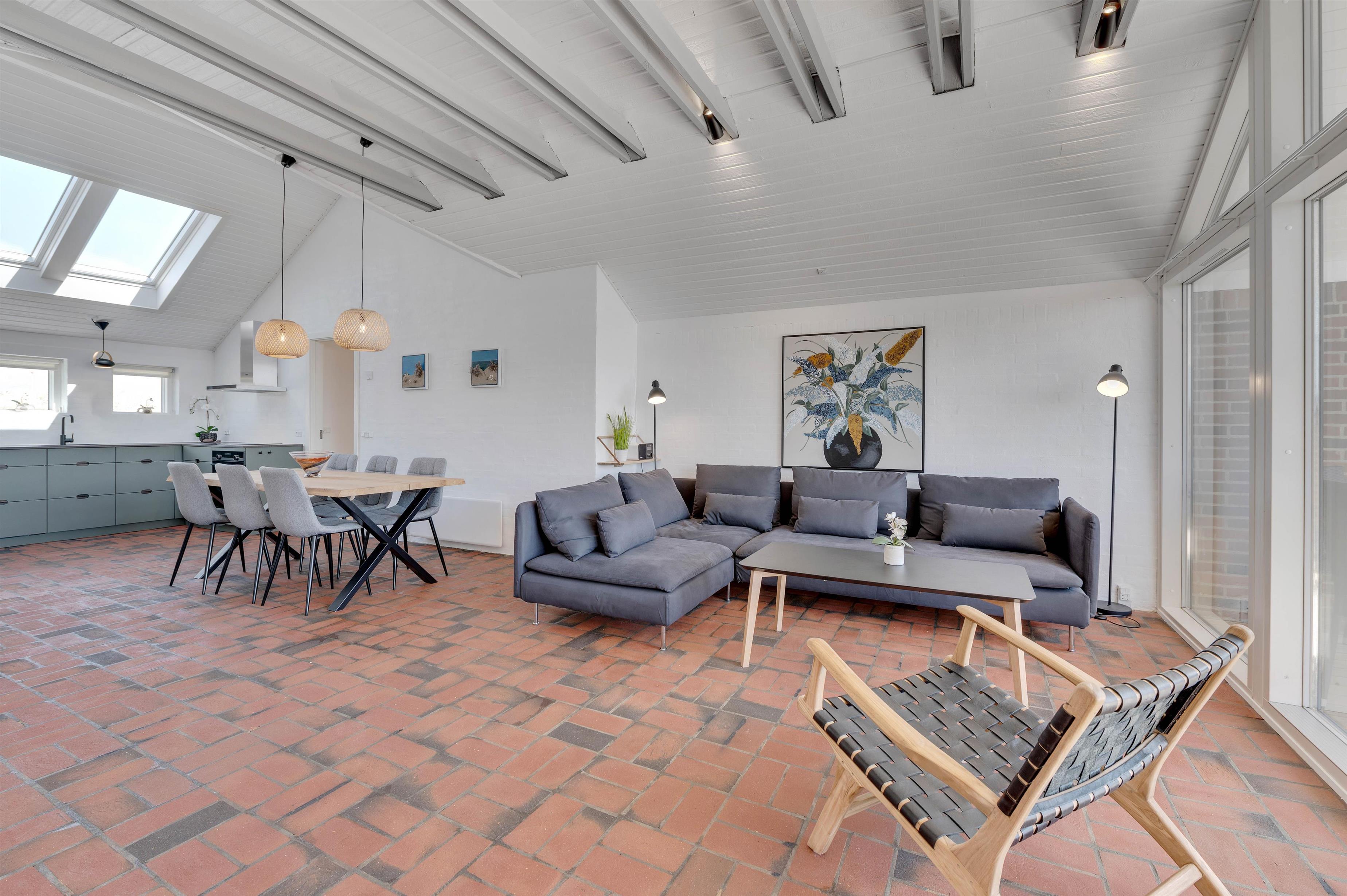 I sommerhusets køkkenalrum går loftet hele vejen til kip, hvilket er med til at give rummene en super dejlig fornemmelse. Brændeovnen i stueområdet giver den hyggelige feriestemning et ekstra nøk opad, og fjernsynet er udstyret med Chromecast, så I kan streame alle jeres yndlings- film og serier på ferien. Der er installeret gulvvarme på badeværelset og gæstetoilettet.