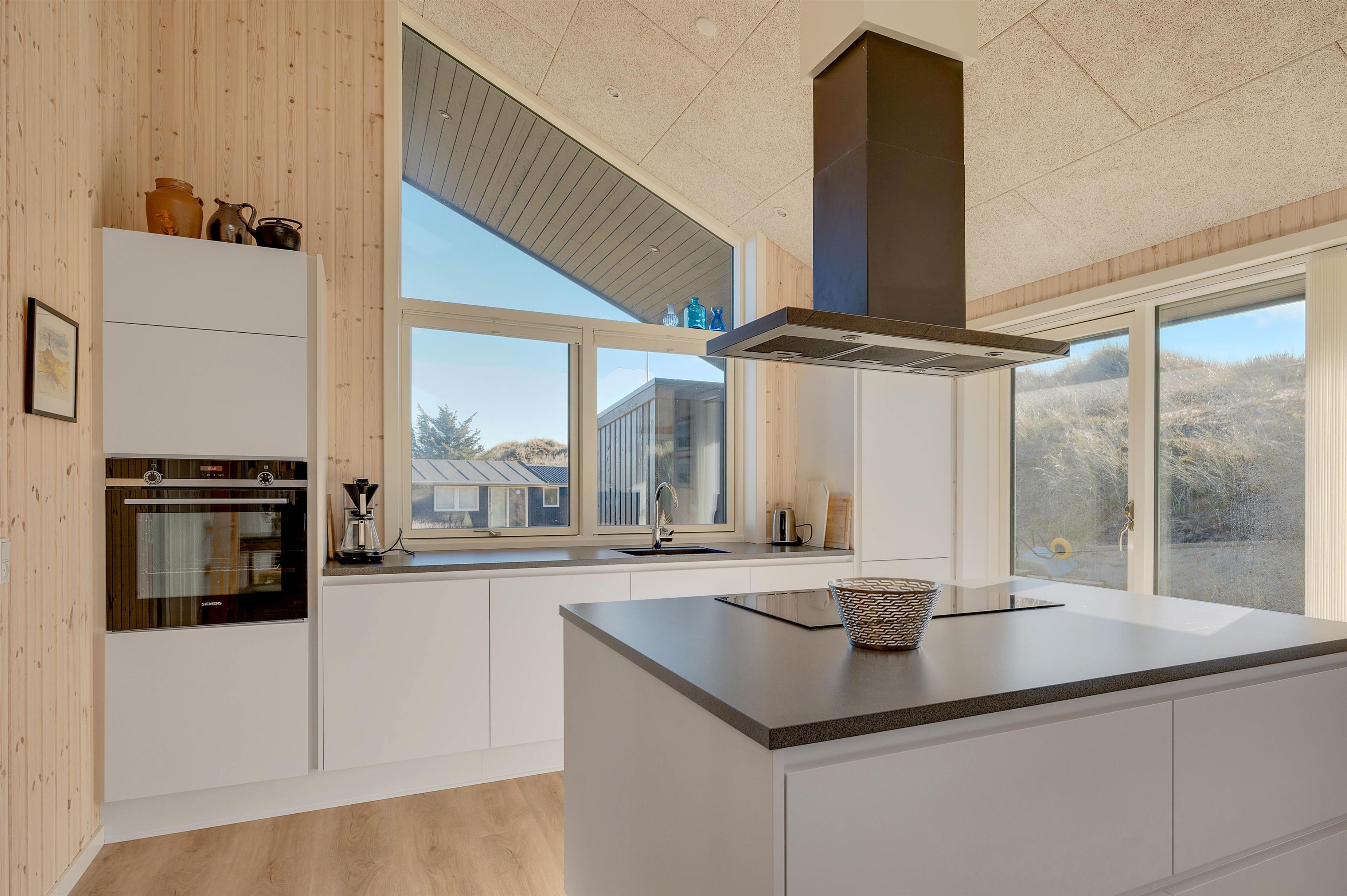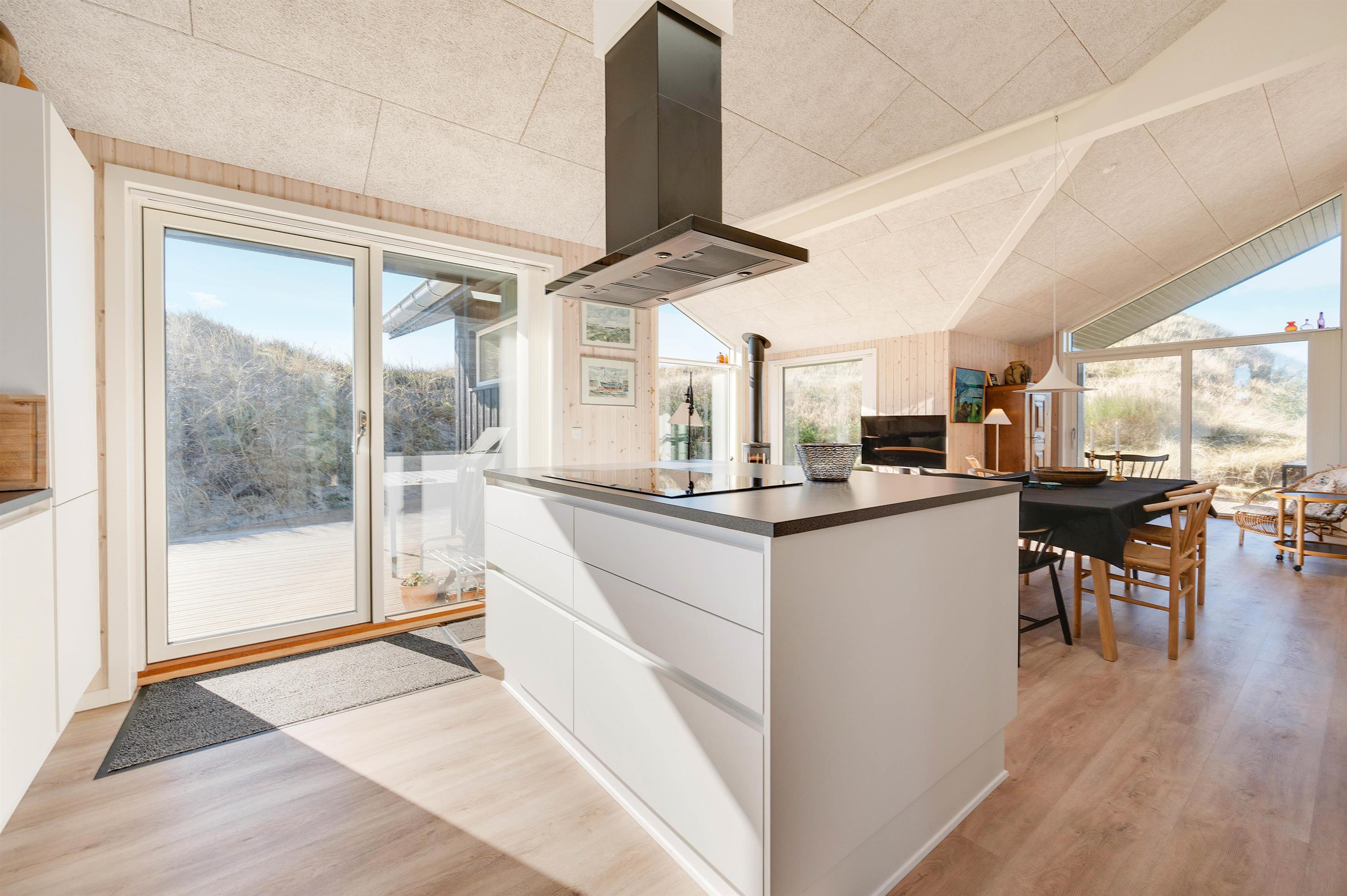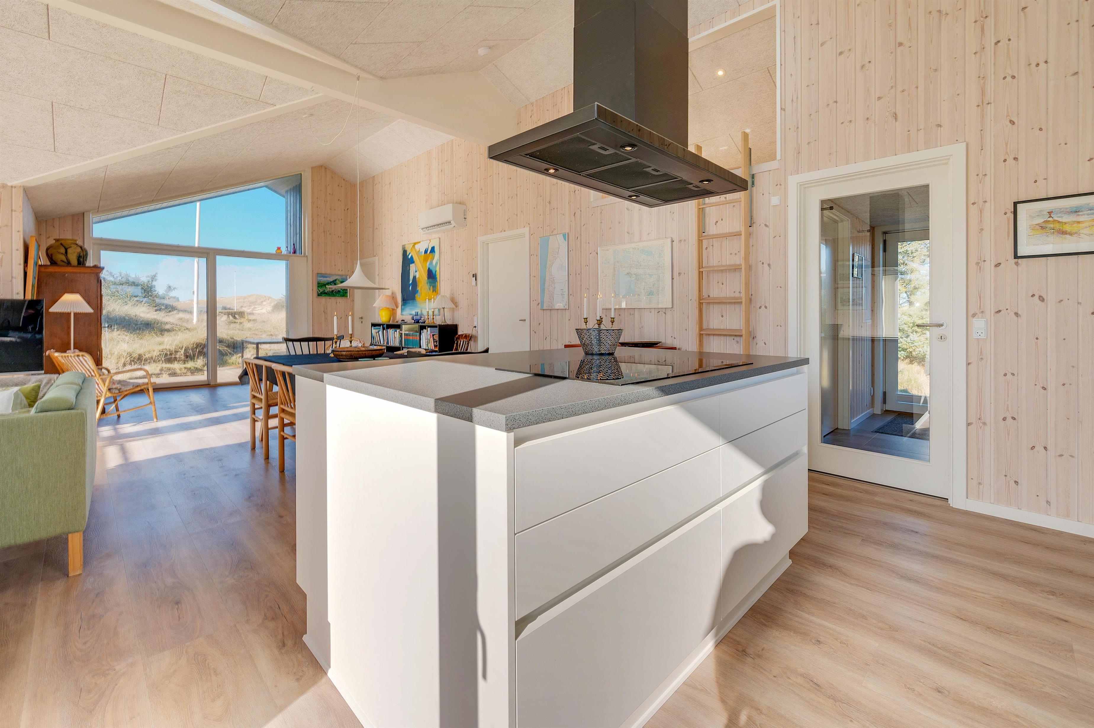Feriehuset, der er beliggende på Krogen 73, er opført i 2021 og har en superfin, moderne indretning, hvor der er tænkt over detaljen på de 109 m2. Køkkenet har en dejlig kogeø og er i direkte, åben forbindelse med opholdsstue og sofahjørne, så alle kan følge med i madlavningen og ferieplanlægningen. I både køkkenet og resten af det dejlige opholdsrummet går loftet også helt til kip, hvilket er med til give jer mere luft om ørene og bidrager til den dejlige fornemmelse af afslapning, som man oplever her i dette rum.