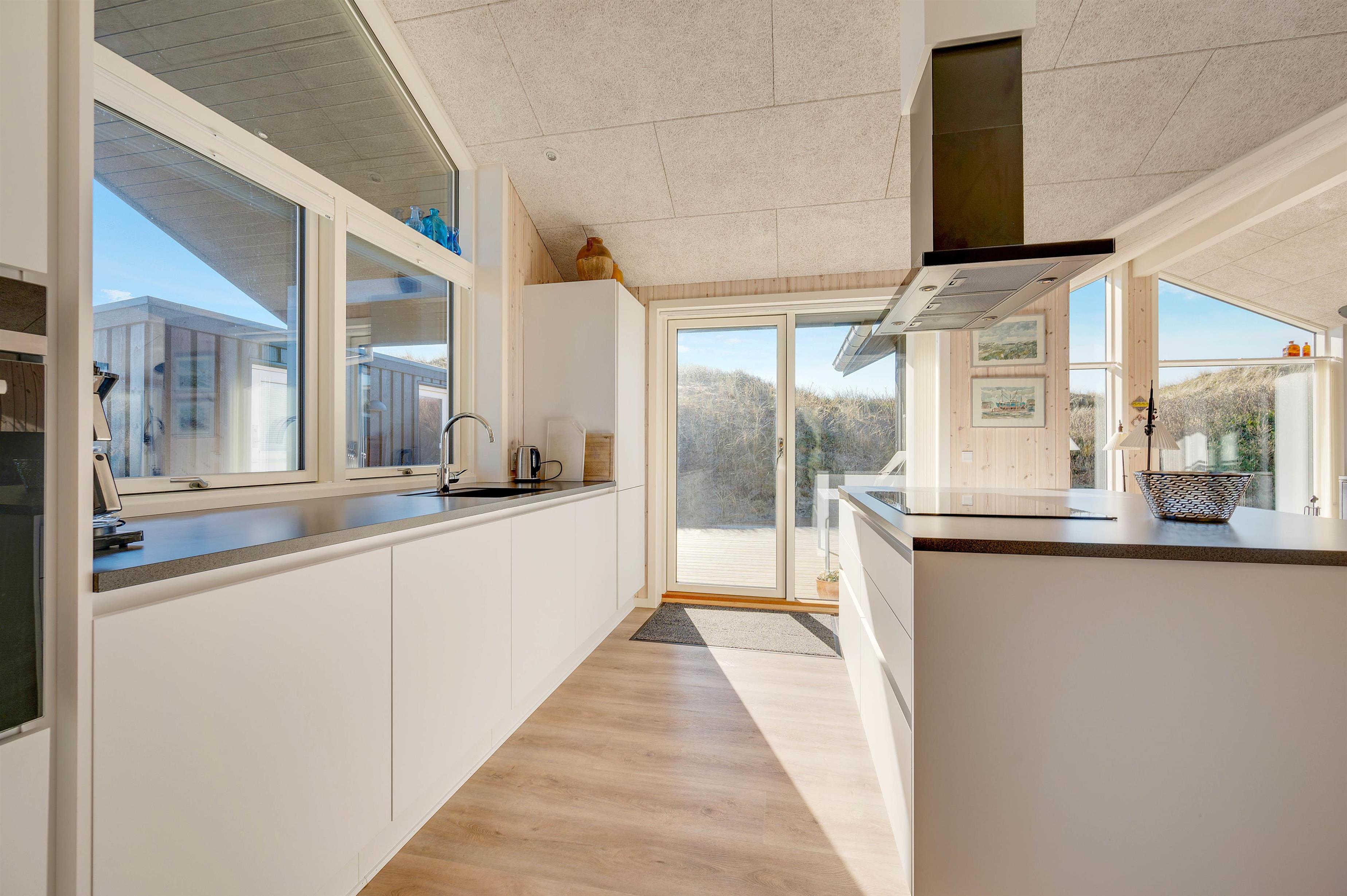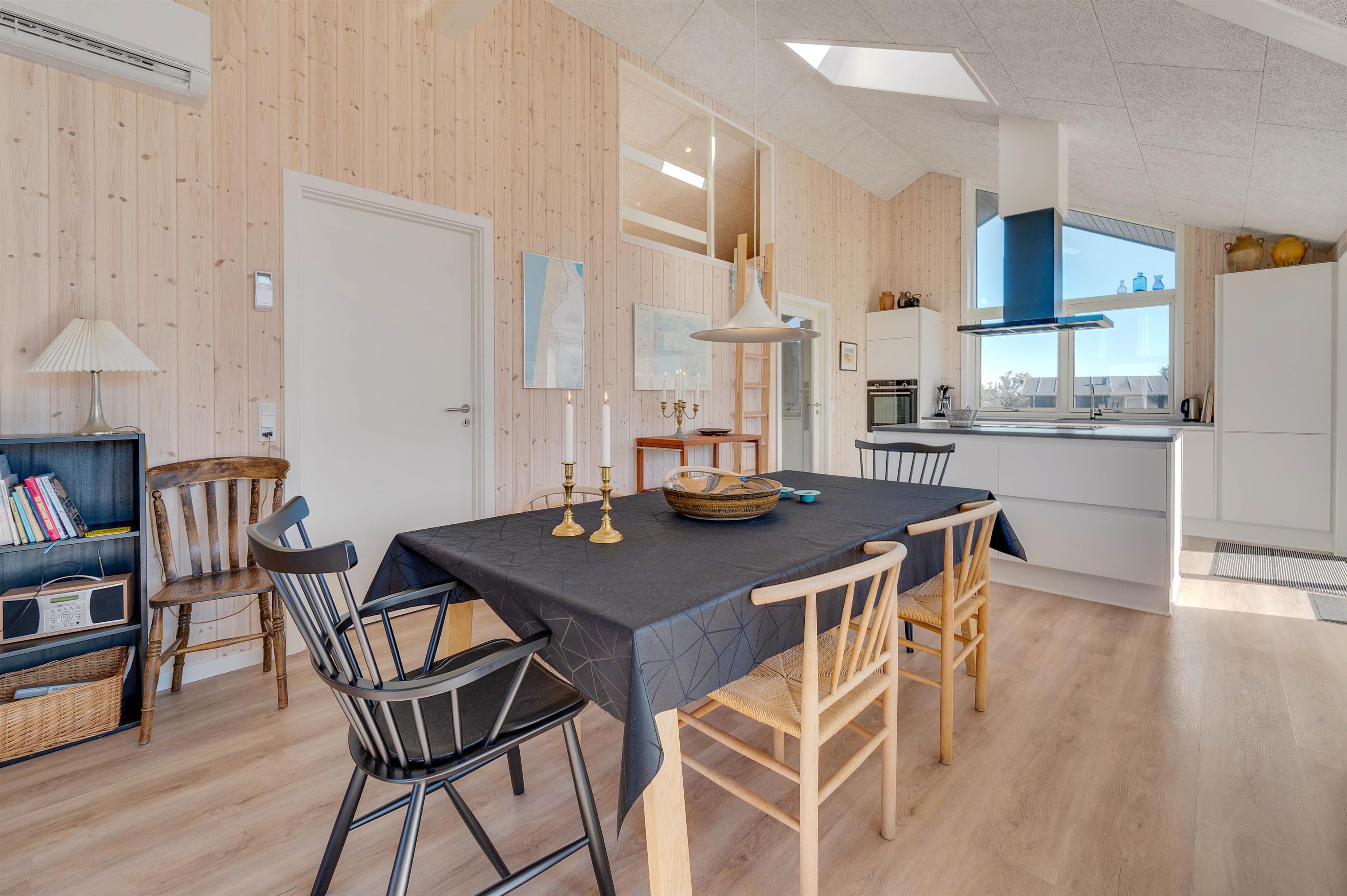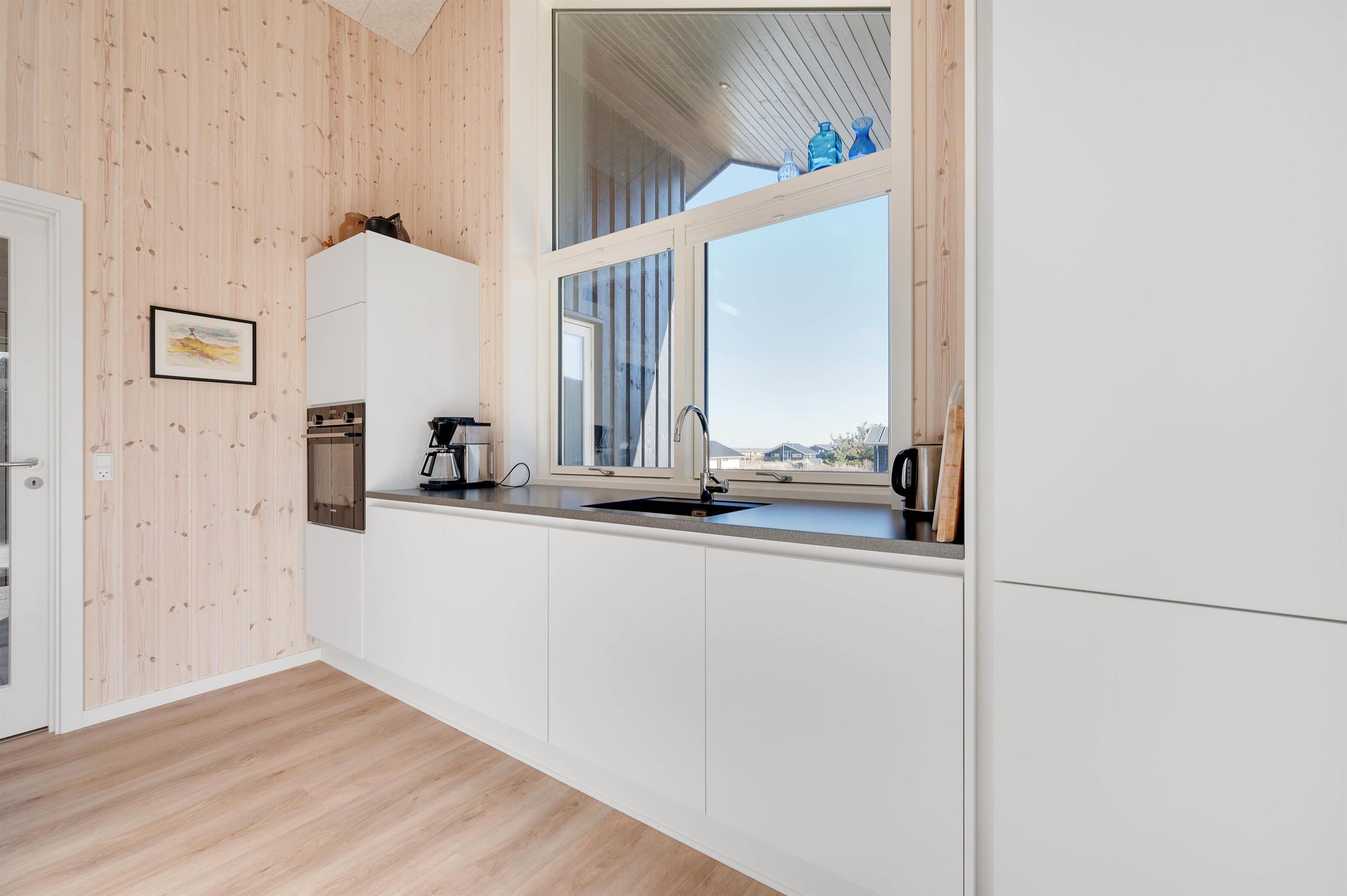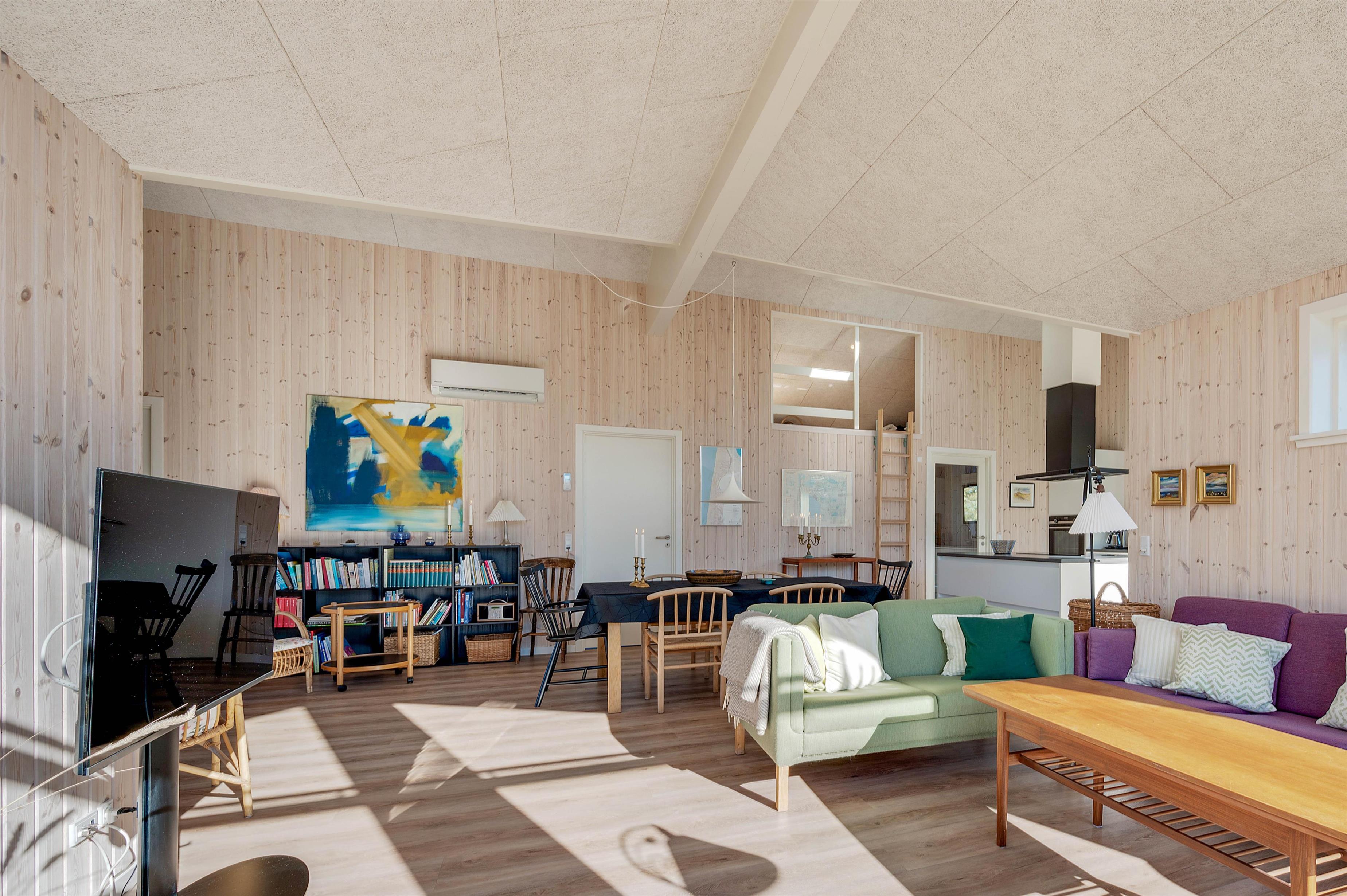 Feriehuset, der er beliggende på Krogen 73, er opført i 2021 og har en superfin, moderne indretning, hvor der er tænkt over detaljen på de 109 m2. Køkkenet har en dejlig kogeø og er i direkte, åben forbindelse med opholdsstue og sofahjørne, så alle kan følge med i madlavningen og ferieplanlægningen. I både køkkenet og resten af det dejlige opholdsrummet går loftet også helt til kip, hvilket er med til give jer mere luft om ørene og bidrager til den dejlige fornemmelse af afslapning, som man oplever her i dette rum.