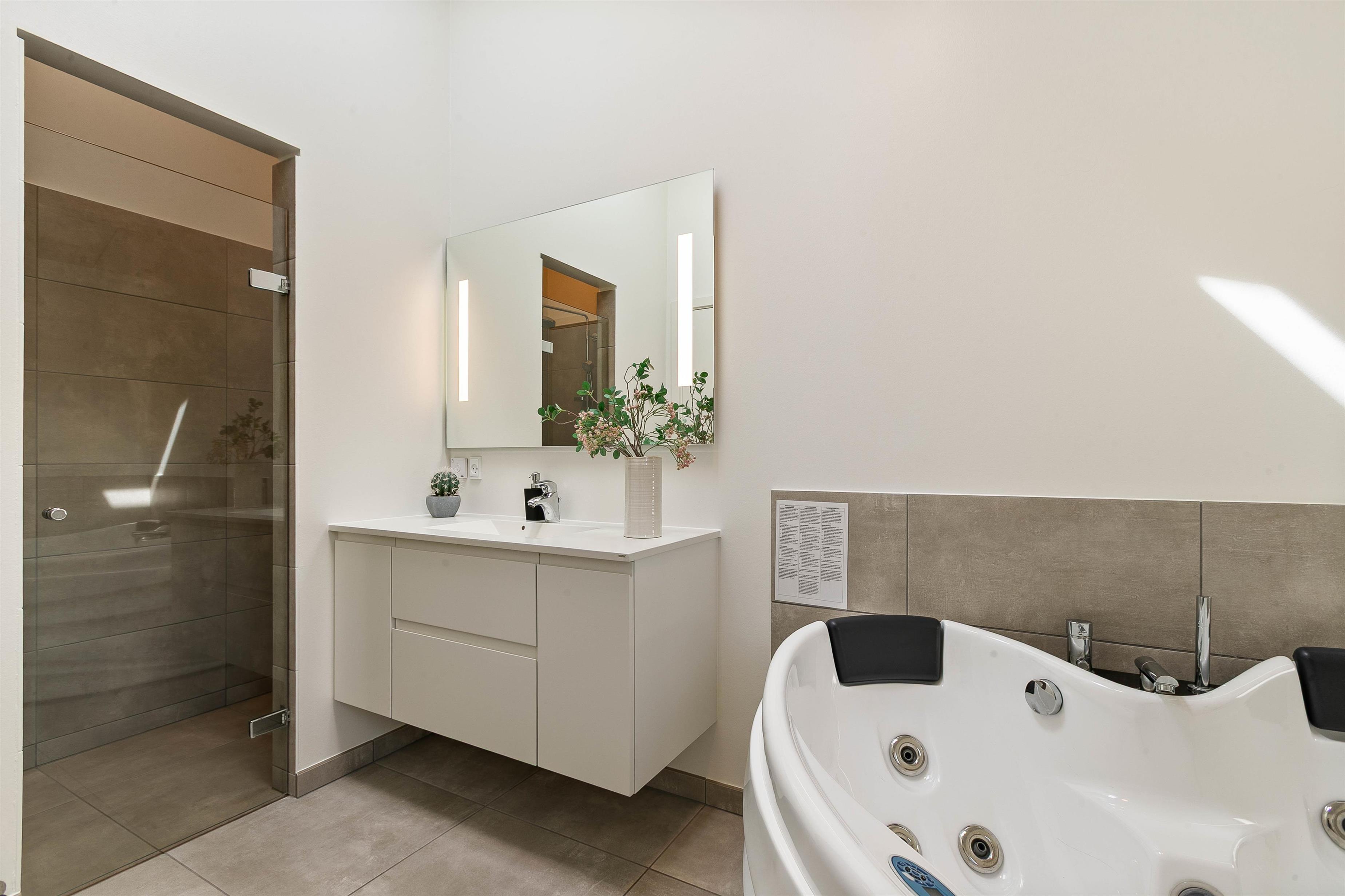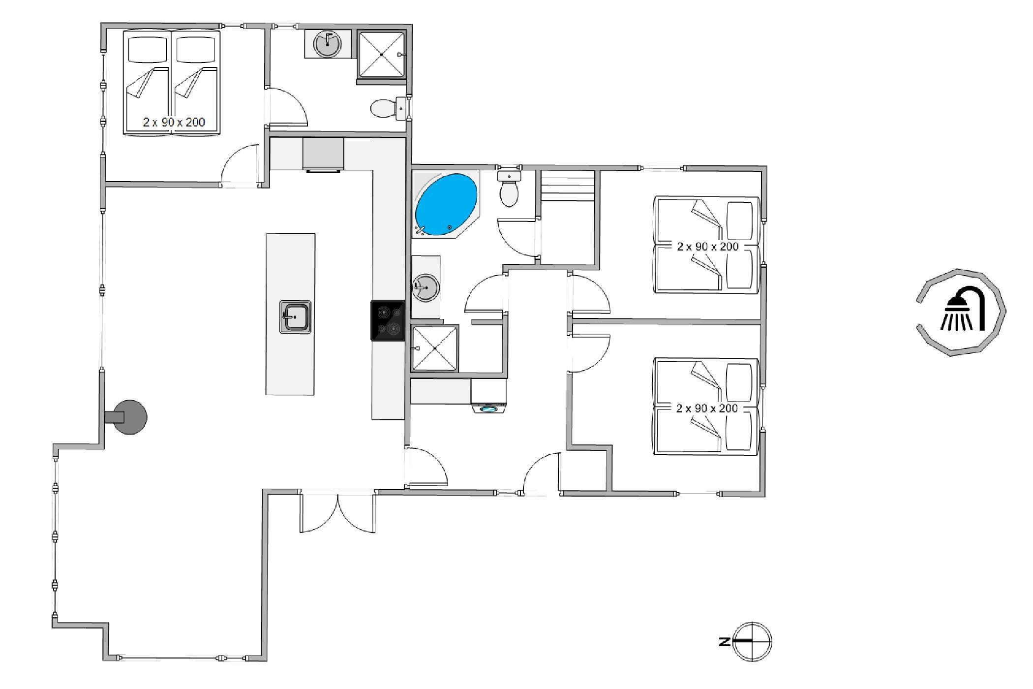 Huset er udstyret med 2 badeværelser, hvoraf det ene er tilgængeligt direkte fra et af de tre soverum. På det største badeværelse er der både sauna og spabad - en vaskeægte wellnessoase, hvor I for alvor kan koble af og tanke nye kræfter i varmen.