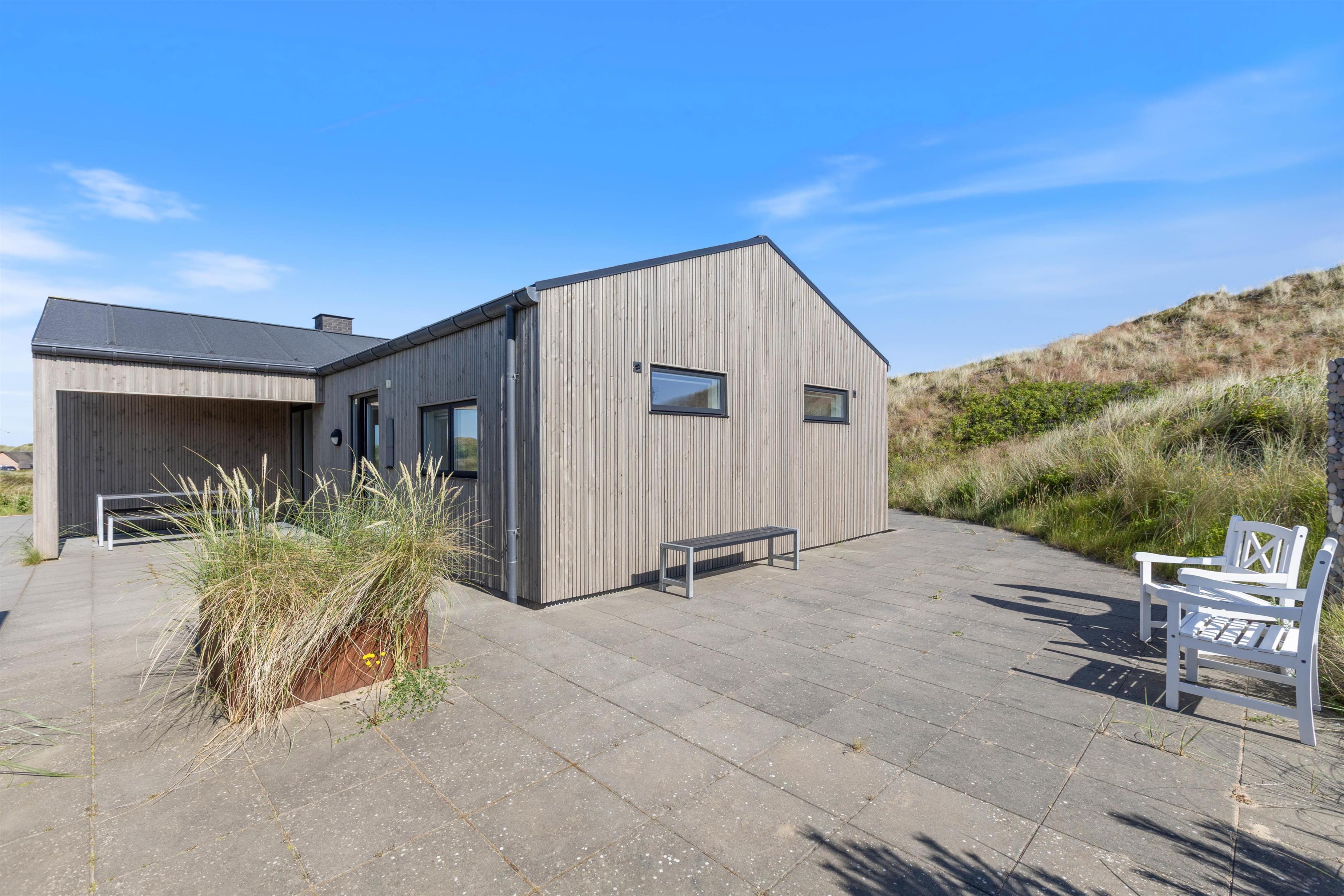 Dette moderne feriehus ligger på en skøn naturgrund i Houvig, og fra terrassen har I en helt fantastisk udsigt ud over ferieområdet med lyngklædt klitlandskab så langt, øjet rækker. Nyd solen i liggestolene og rund dagen godt af med en lækker feriemiddag på grillen i den lune aftensol.
