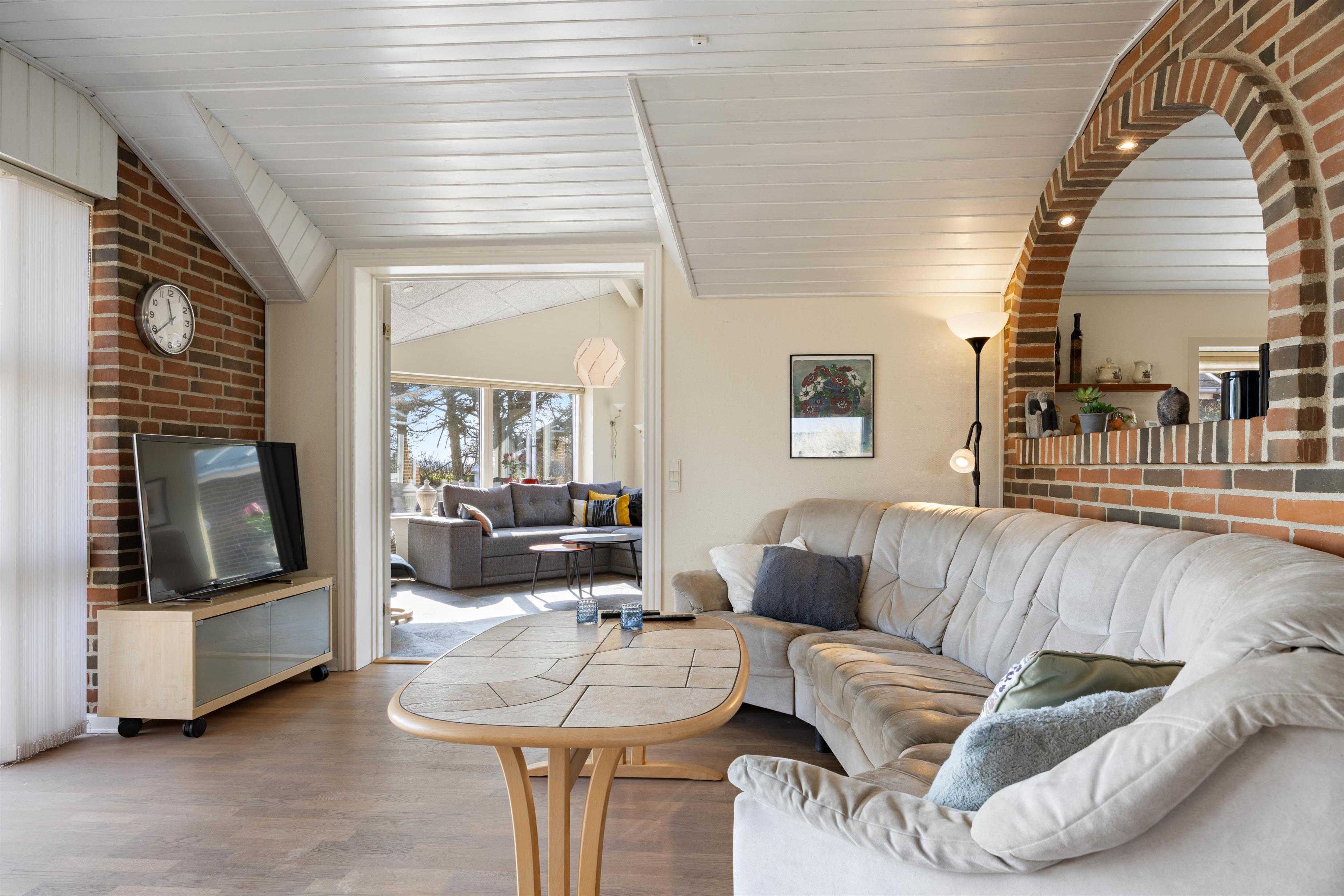 Det 132 kvadratmeter store murstenshus rummer god plads til 6 personer og er hyggeligt indrettet med fine detaljer og varme farver. Den klassiske brændeovn tilfører ekstra charme og feriestemning og sørger for god varme hele året rundt. Med jeres egen sauna kan I forkæle jer selv med lidt ekstra wellness på ferien.