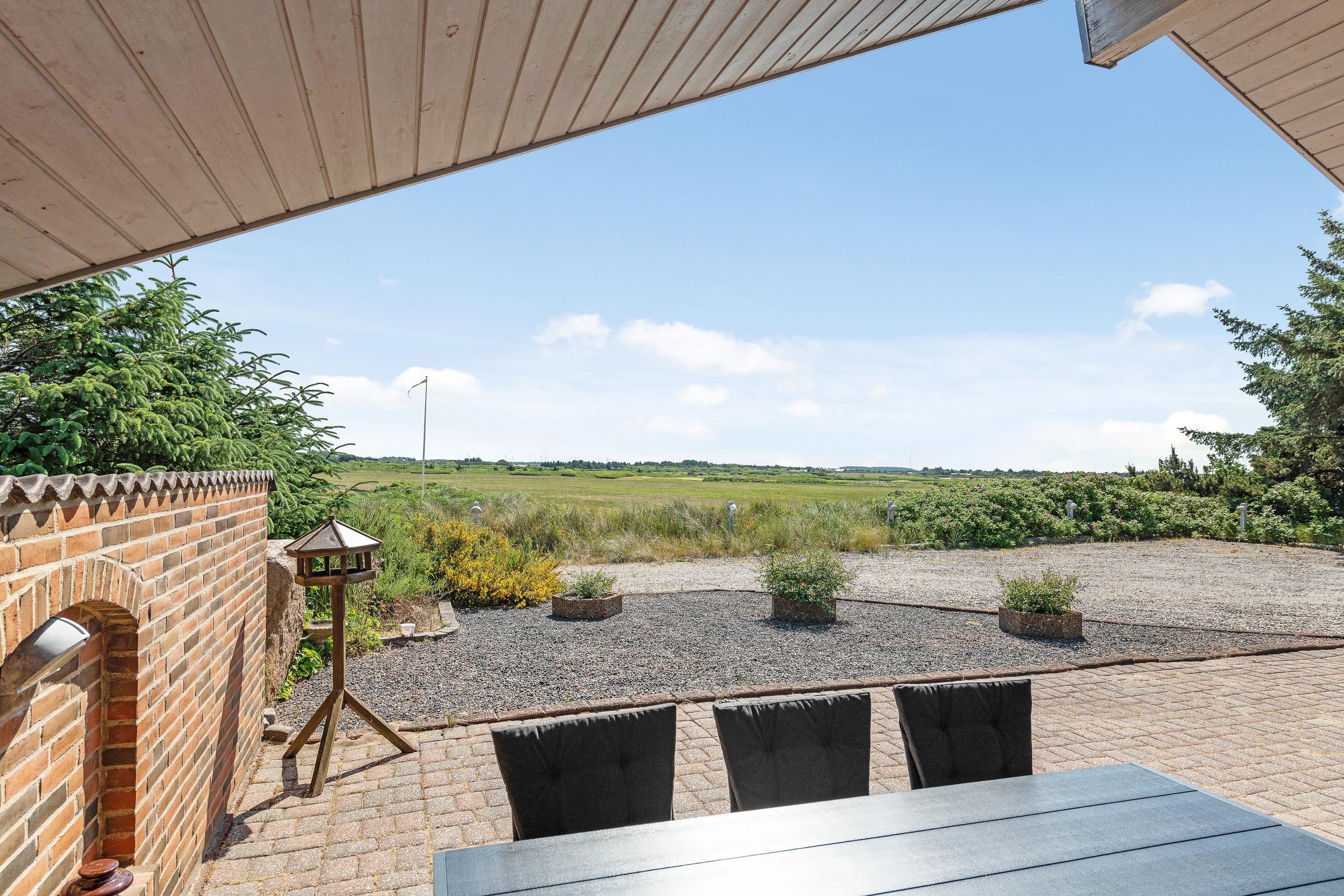 Rundt om feriehuset går en stor terrasse, som på den ene side er helt ugeneret og lukket af. Her kan I læne jer tilbage i havemøblerne og nyde det gode vejr og den friske havluft. Fra huset er der også udsigt ud over den grønne golfbane i Søndervig.