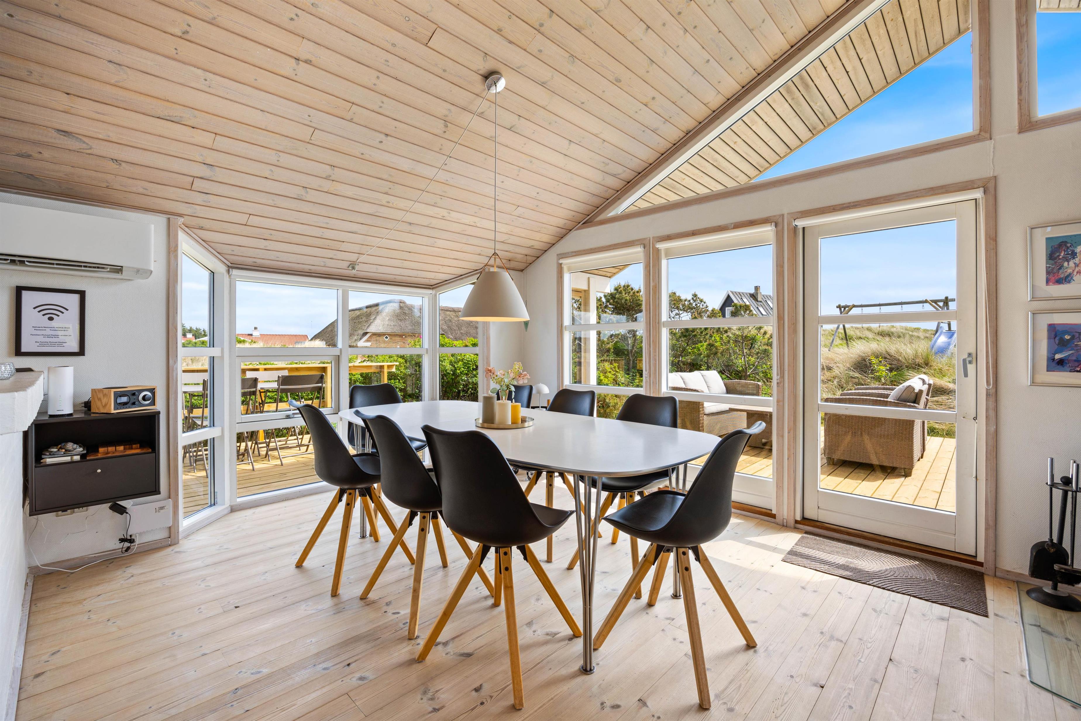 Feriehuset har en stor åben terrasse, og når vejret viser sig fra sin bedste side, er det oplagt at indtage havemøblerne og liggestolene. Høje klitter og små buske sørger for afskærmning og privatsfære, og om aftenen kan I tænde op i grillen og fejre endnu en dejlig feriedag med et lækkert grillmåltid. Udenfor er der også tænkt på de yngste feriegæster, med det dejlige gyngestativ og sandkassen, hvor de kan tilbringe mange timers leg og sjov.