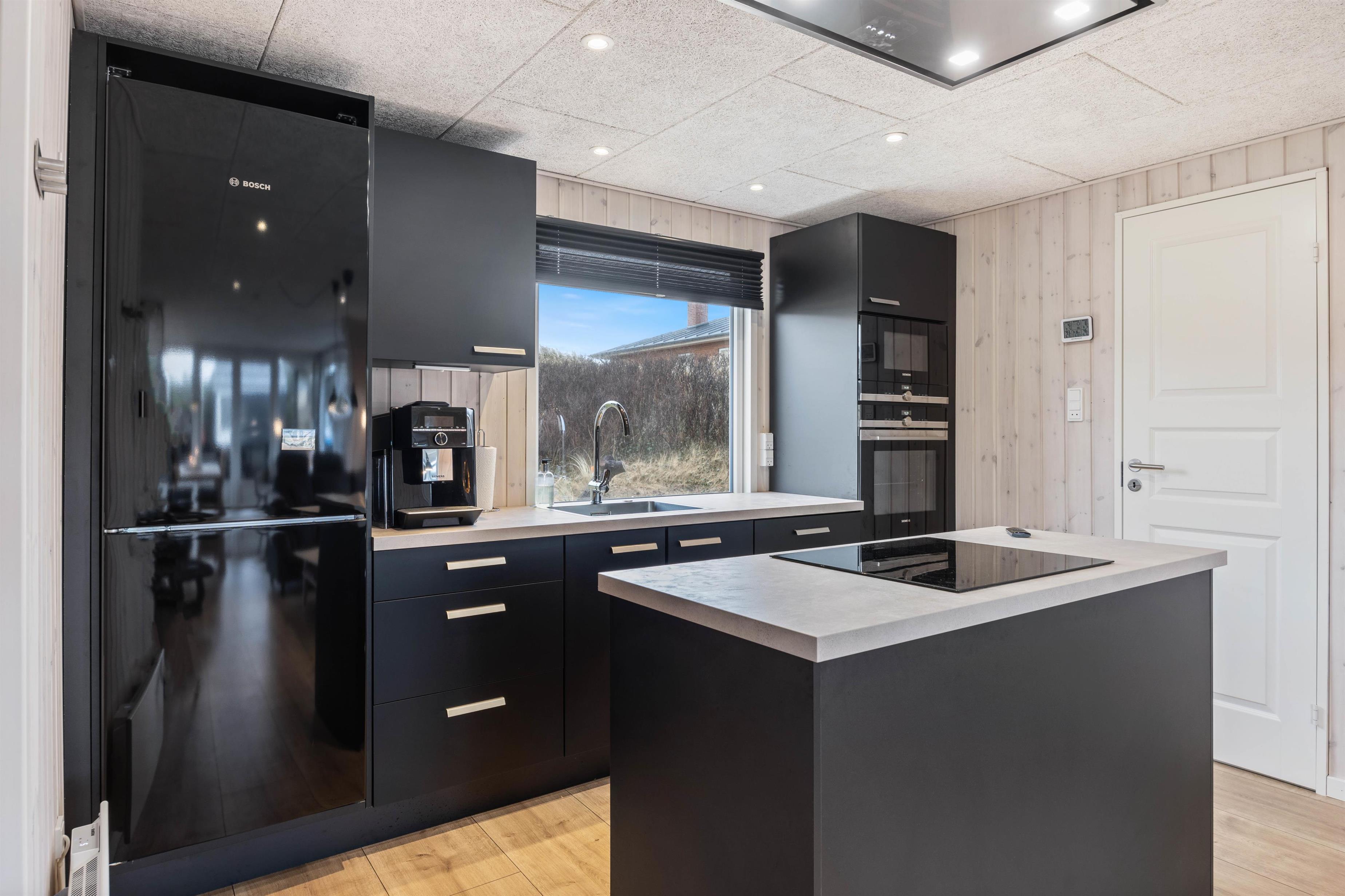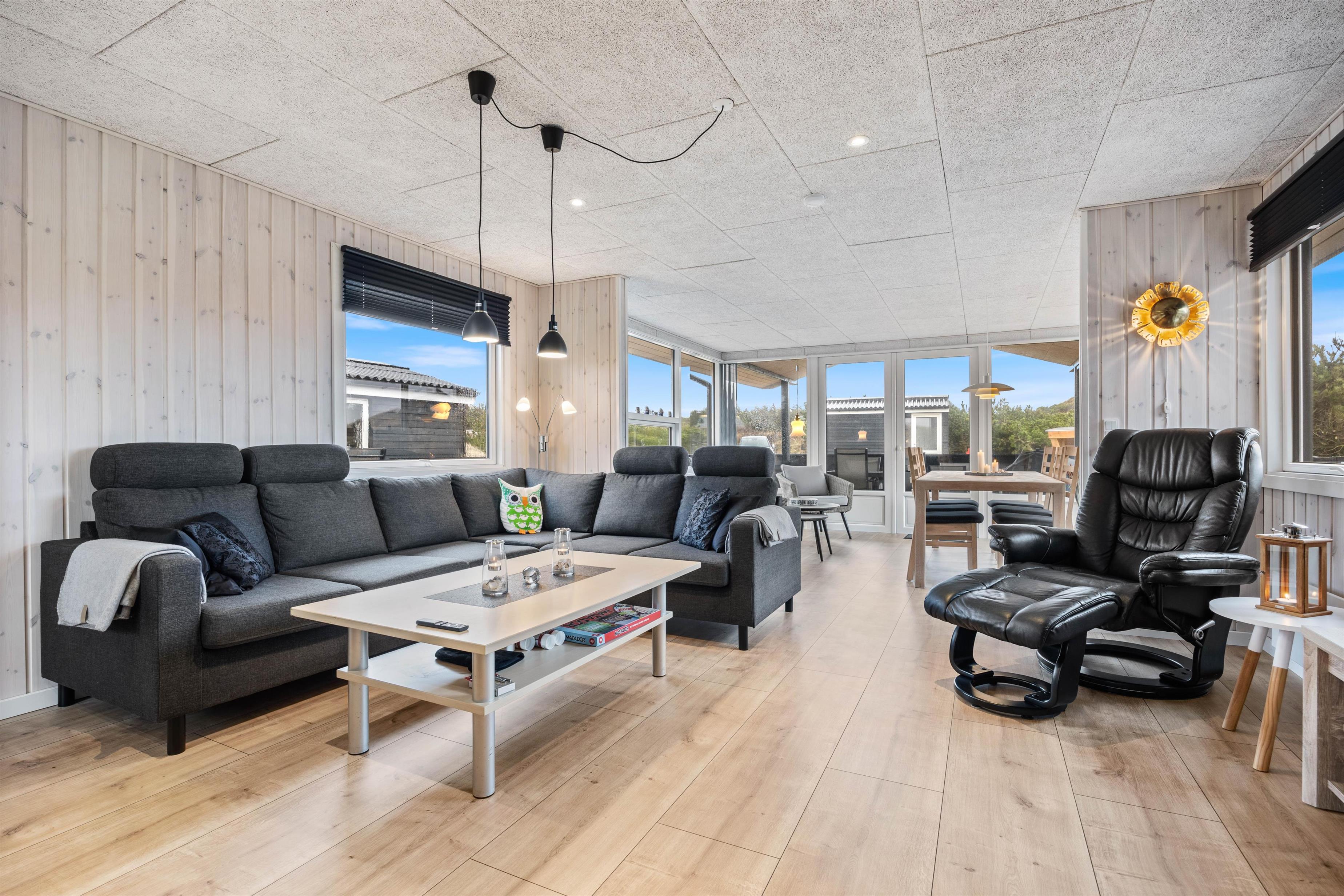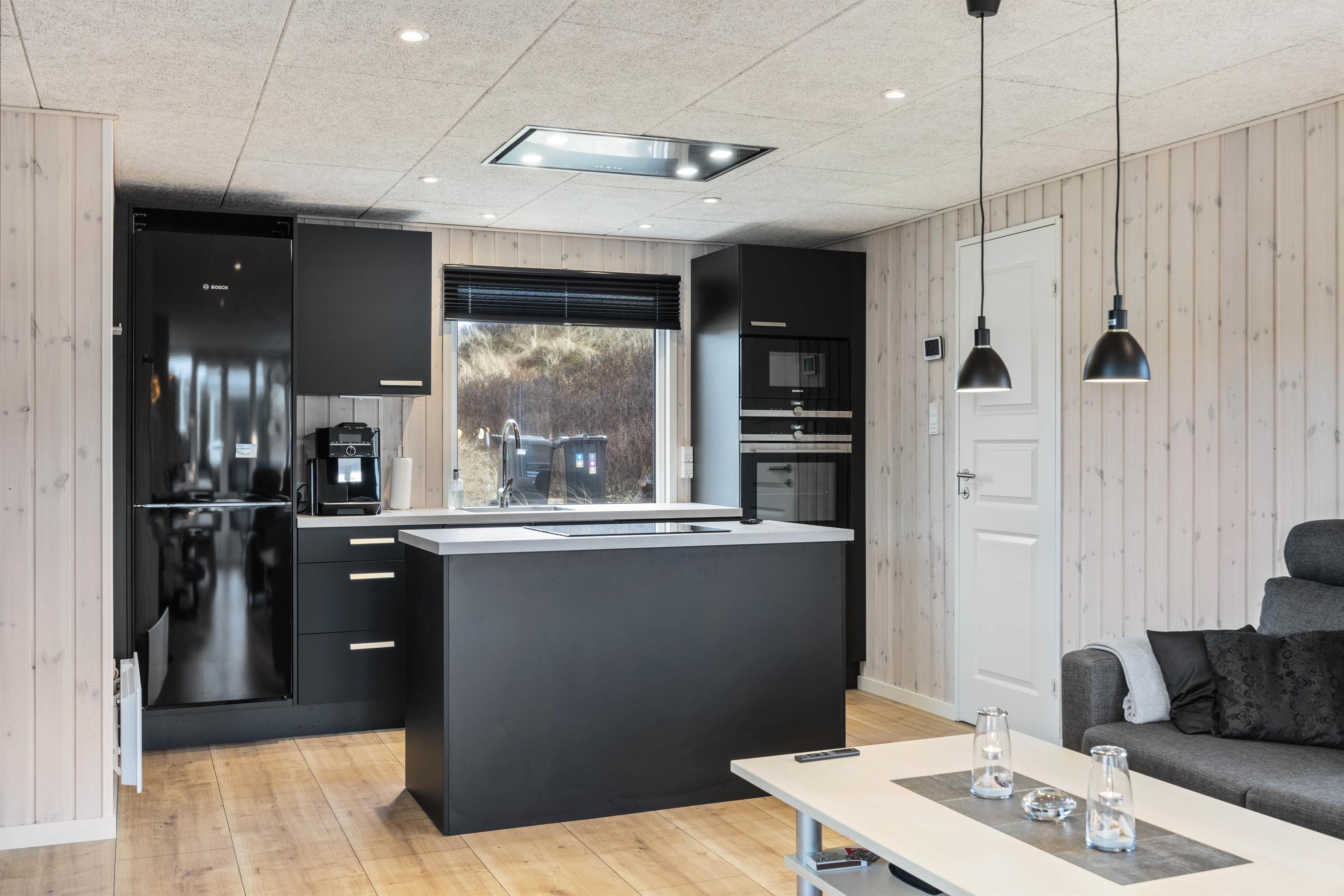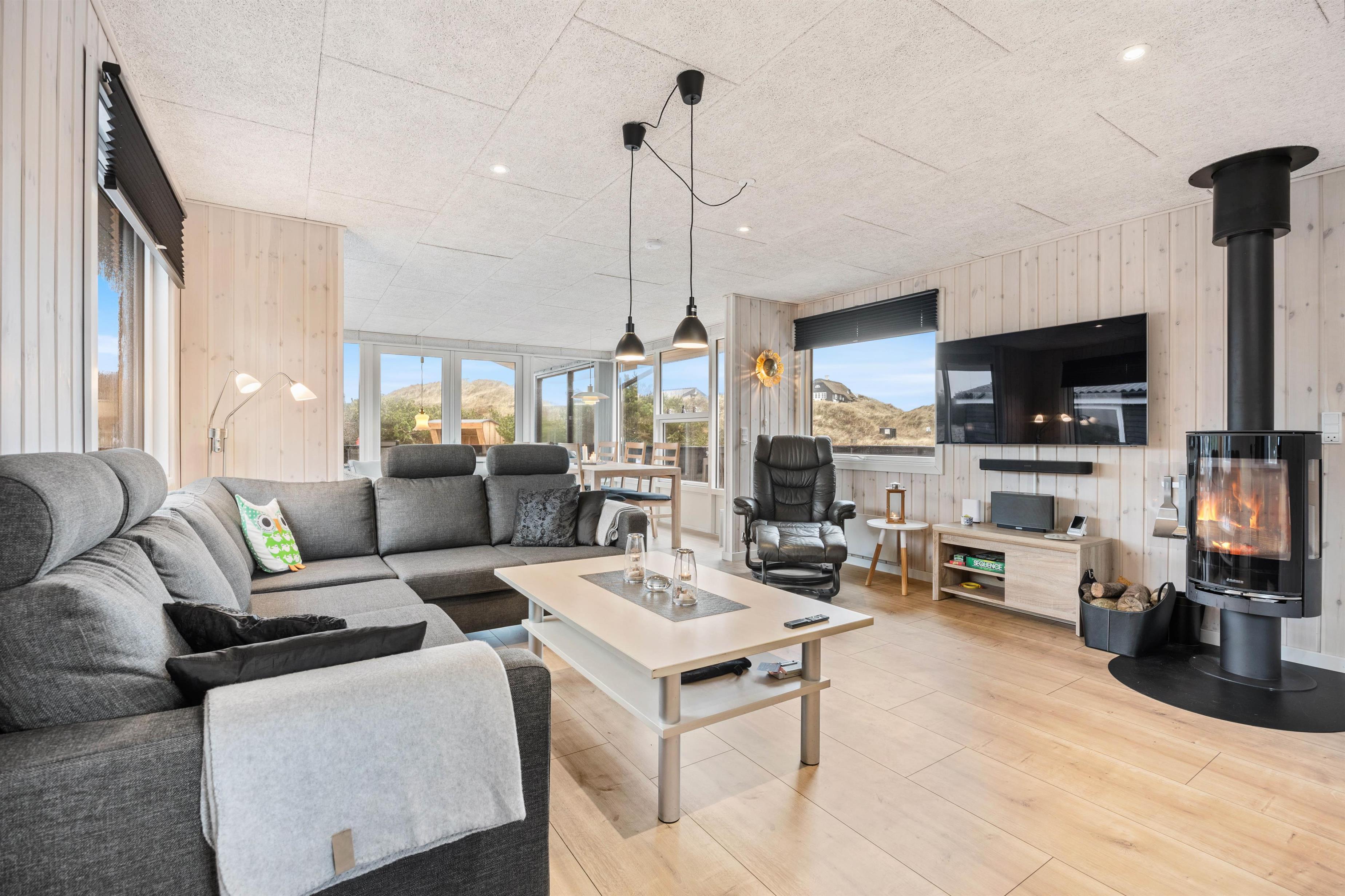 Feriehusets hjerte er det store opholdsrum, som kombinerer køkken, stue og spiseplads. Her kan I lave mad sammen, spille spil eller se jeres yndlingsfilm sammen på tv. Brændeovnen i stuen giver den typiske feriehusstemning, mens den energivenlige luft-til-luft-varmepumpe sikrer et behageligt indeklima samt bidrager til lavere energiforbrug.