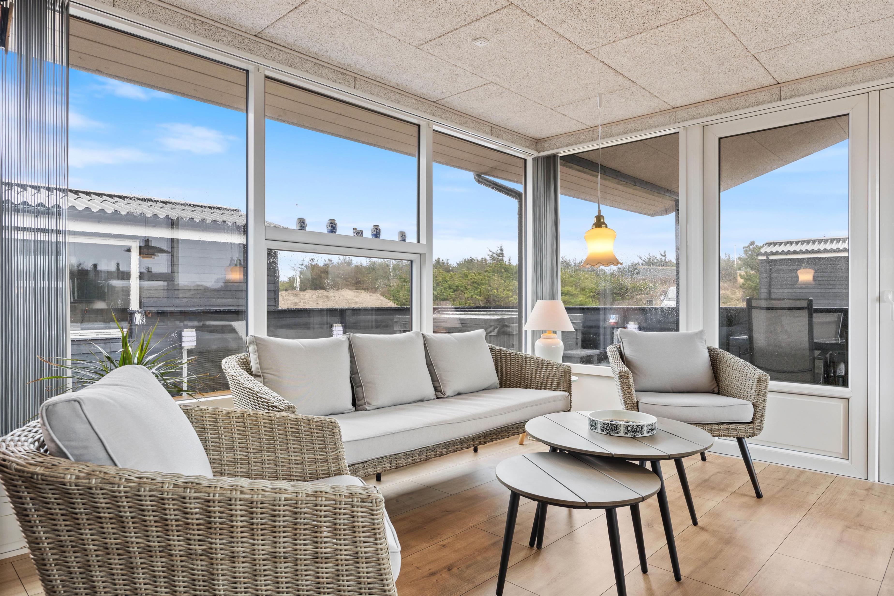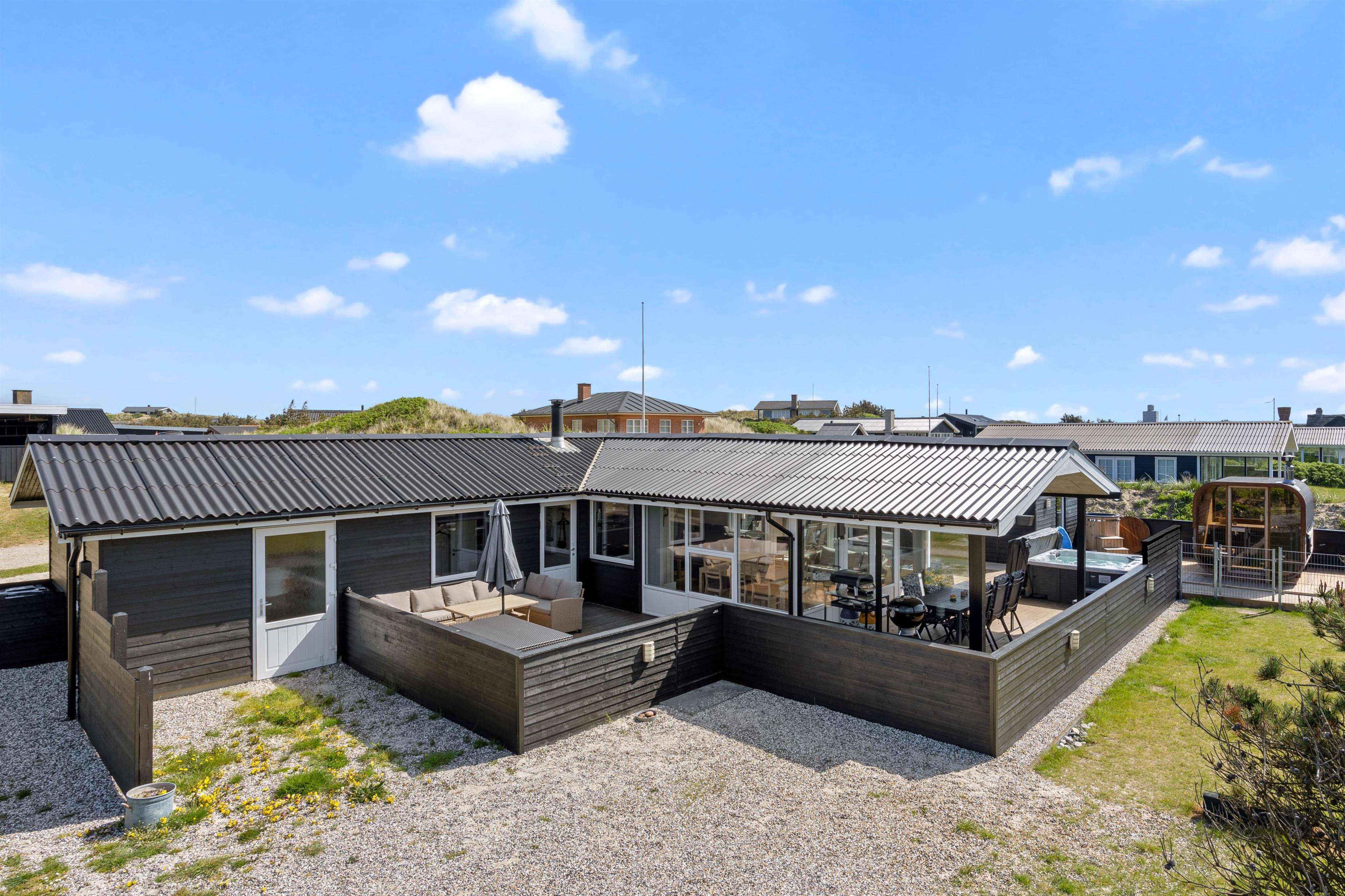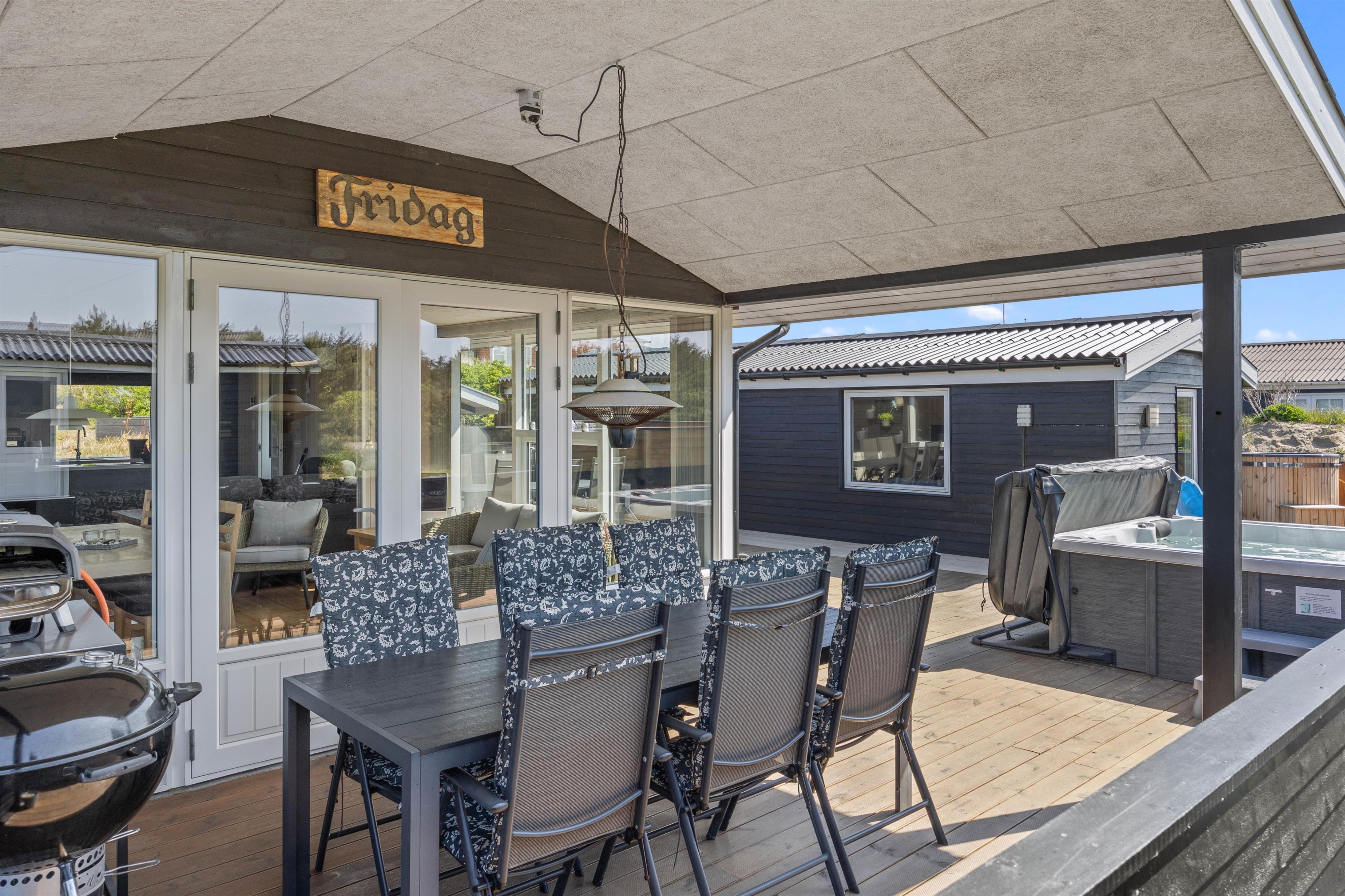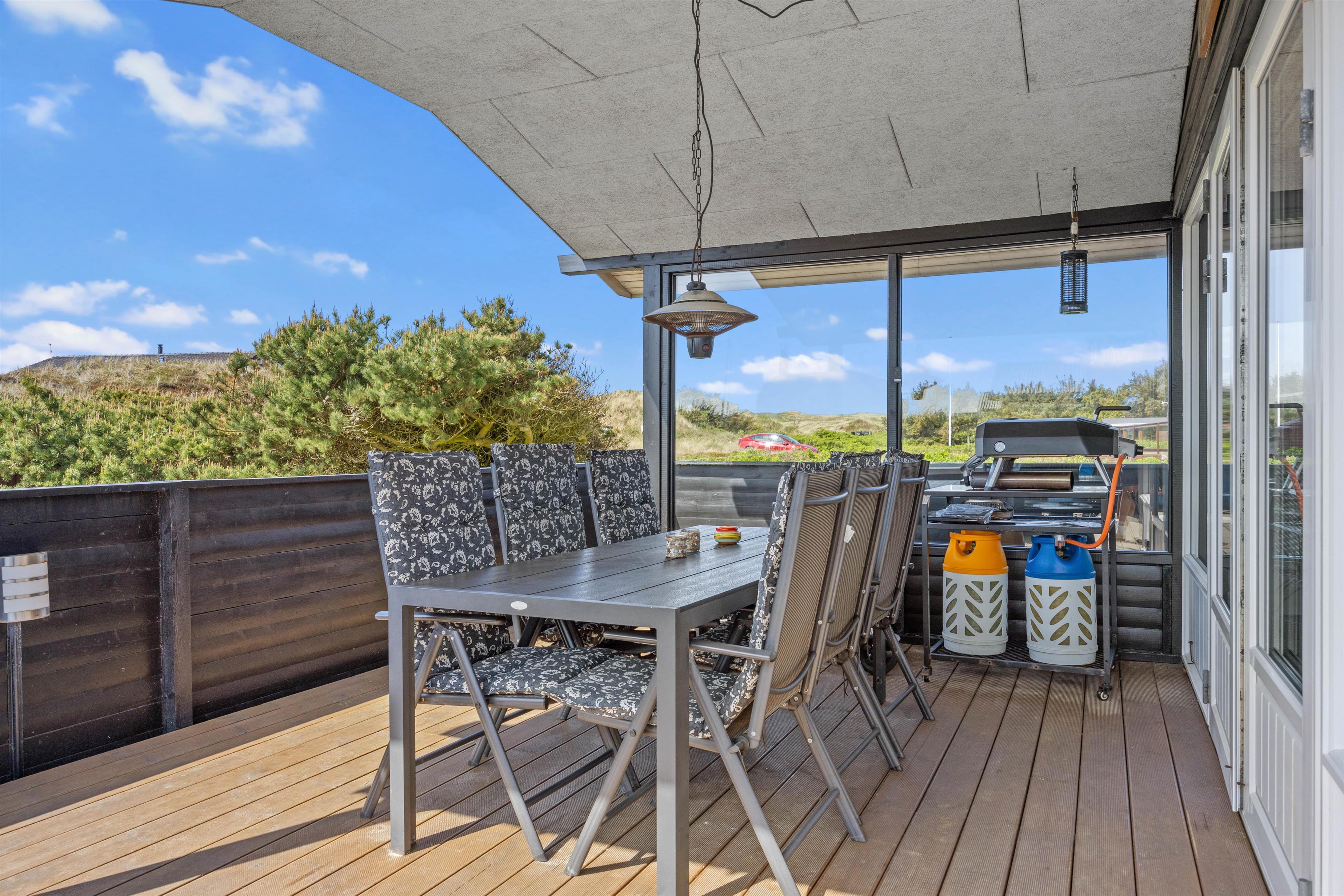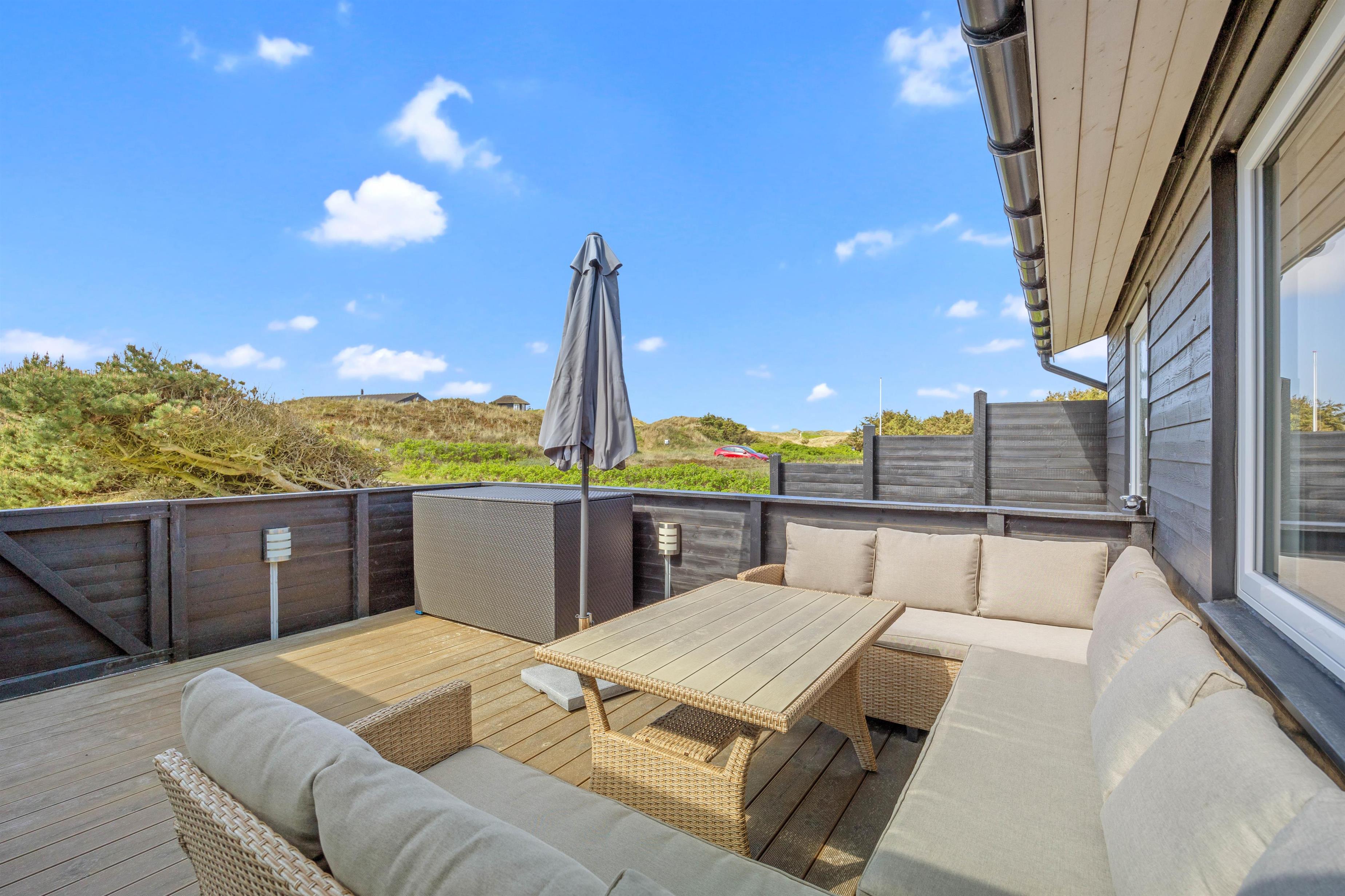 Feriehusets terasser byder også op til dejlig udendørs afslapning. Her kan I sætte jer tilbage i havemøblerne og nyde vejret på solskinsdage. Her kan I også nyde dejlig aftensmad, som I også kan tilbederede ved hjælp af feriehusets grill eller den lækre gasopvarmede pizzaovn.