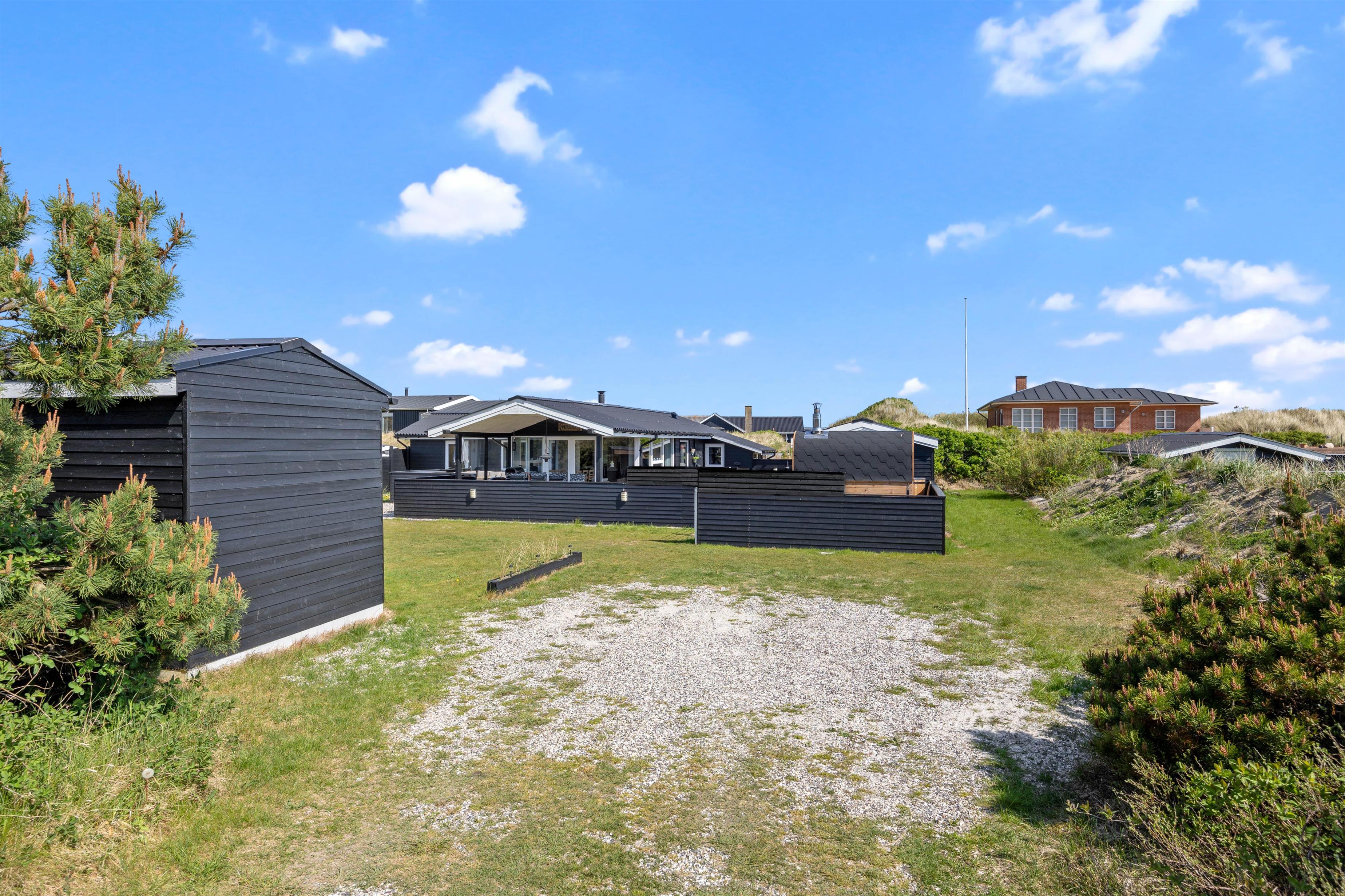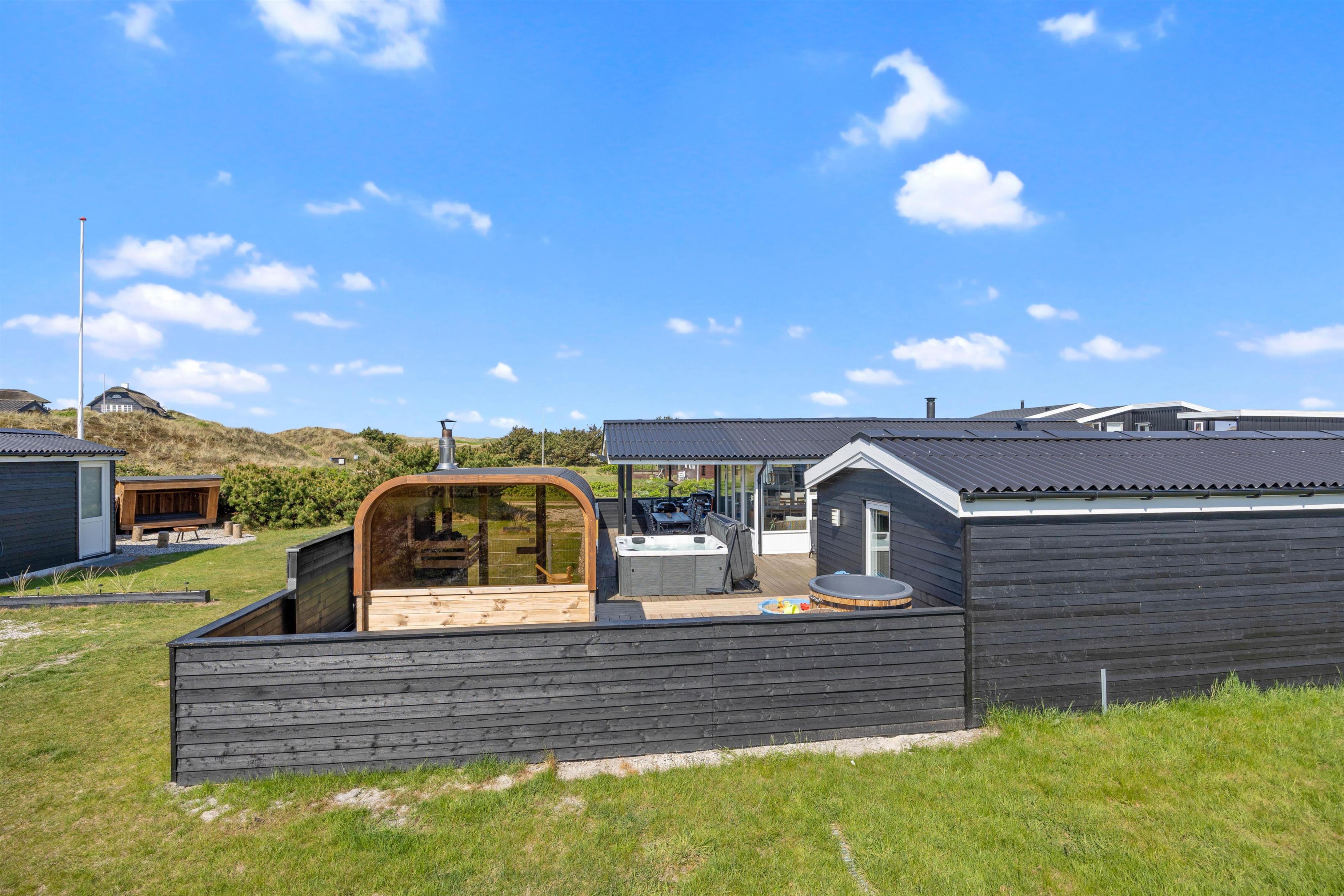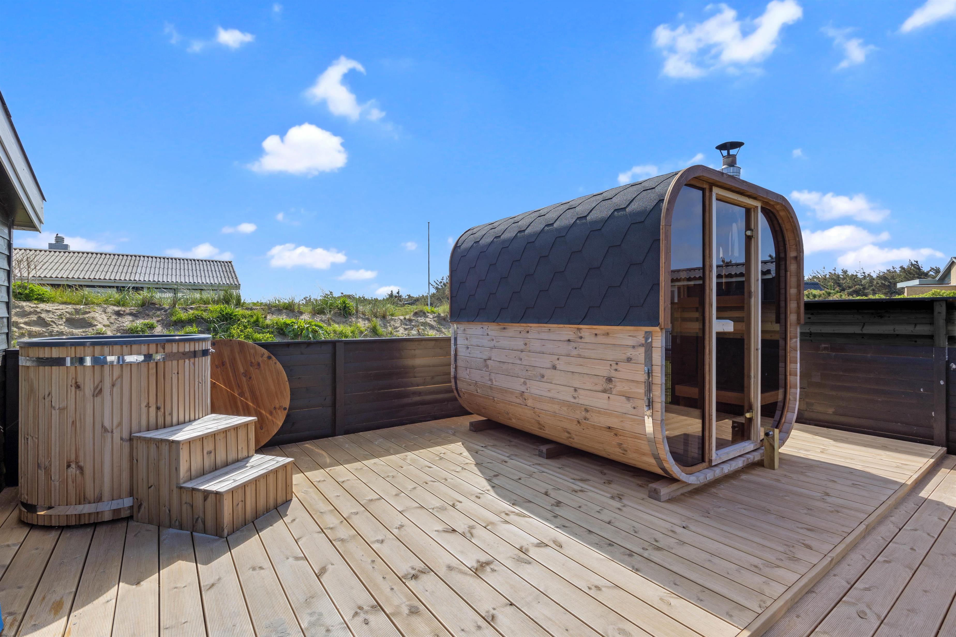 Aktivitetshuset på Lærkedalen 48 er beliggende på en naturgrund på ca. 1200 m2, hvor der er masser af plads til at børn og hunde kan lege og løbe rundt. Mens børnene leger på naturgrunden, kan du gøre det behageligt på den overdækkede, afskærmede og lukkede terrasse i de tilhørende havemøbler. Efter en lang og begivenhedsrig dag i den omkringliggende natur, kan I slappe af om aftenen med et bad i feriehusets eget udendørs boblebad eller en tur i den udendørs sauna. Til de som elsker at vinterbade, kan de også dyppe sig i husets koldvandskar.