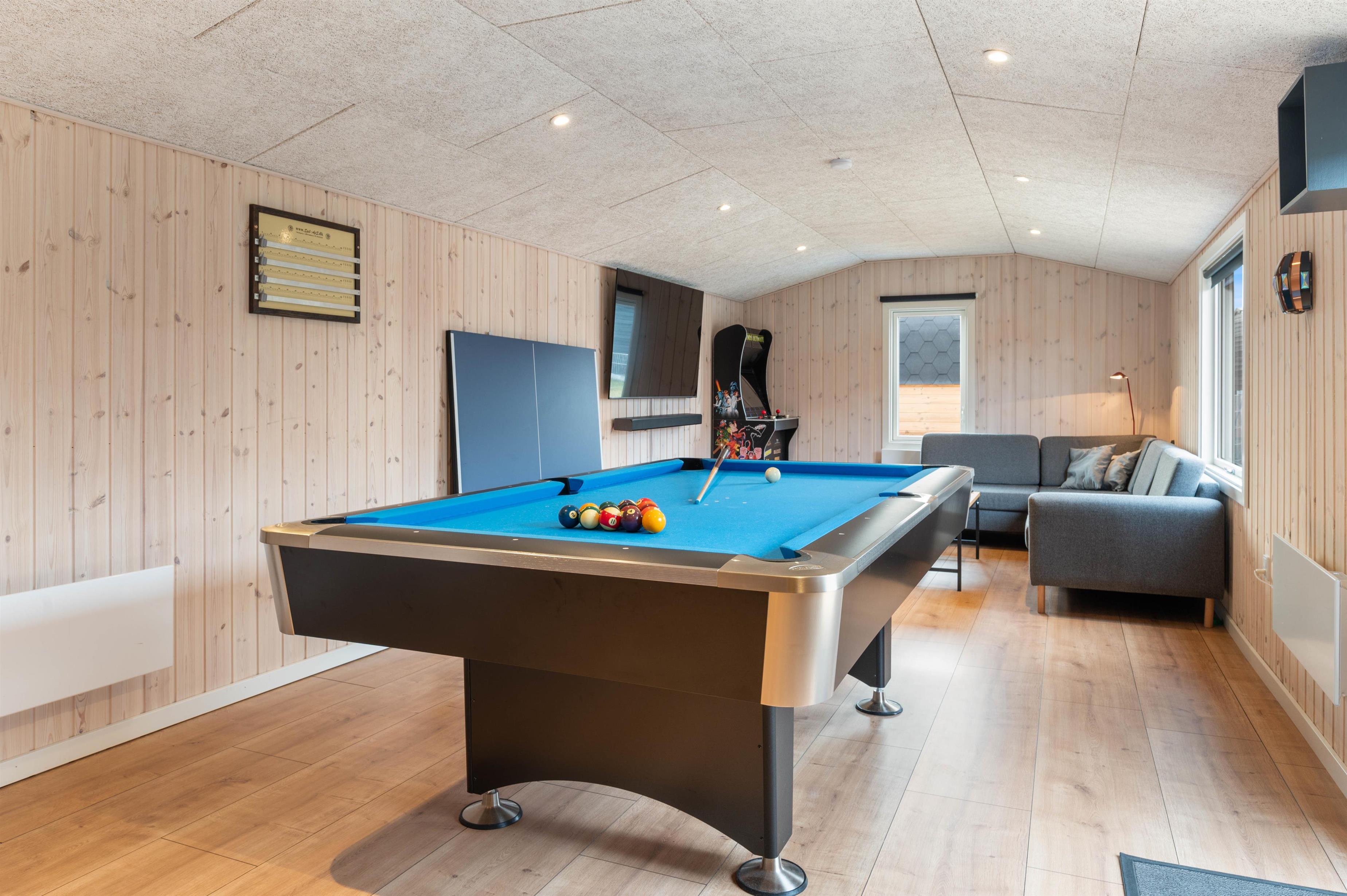 Et af feriehusets højdepunkter er aktivitetsrummet, hvor I om aftenen fx kan hygge jer ved at spille bordtennis eller billard sammen og kåre feriens mester.