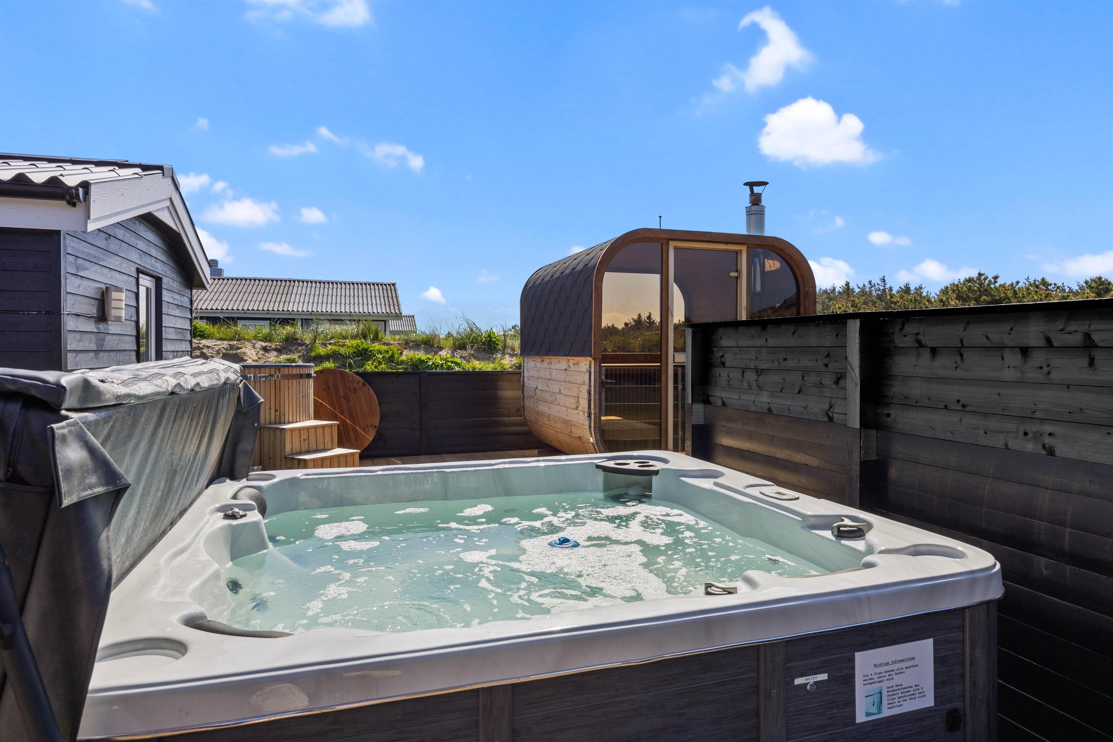 Naturgrund med udendørs boblebad, udebruser, udesauna