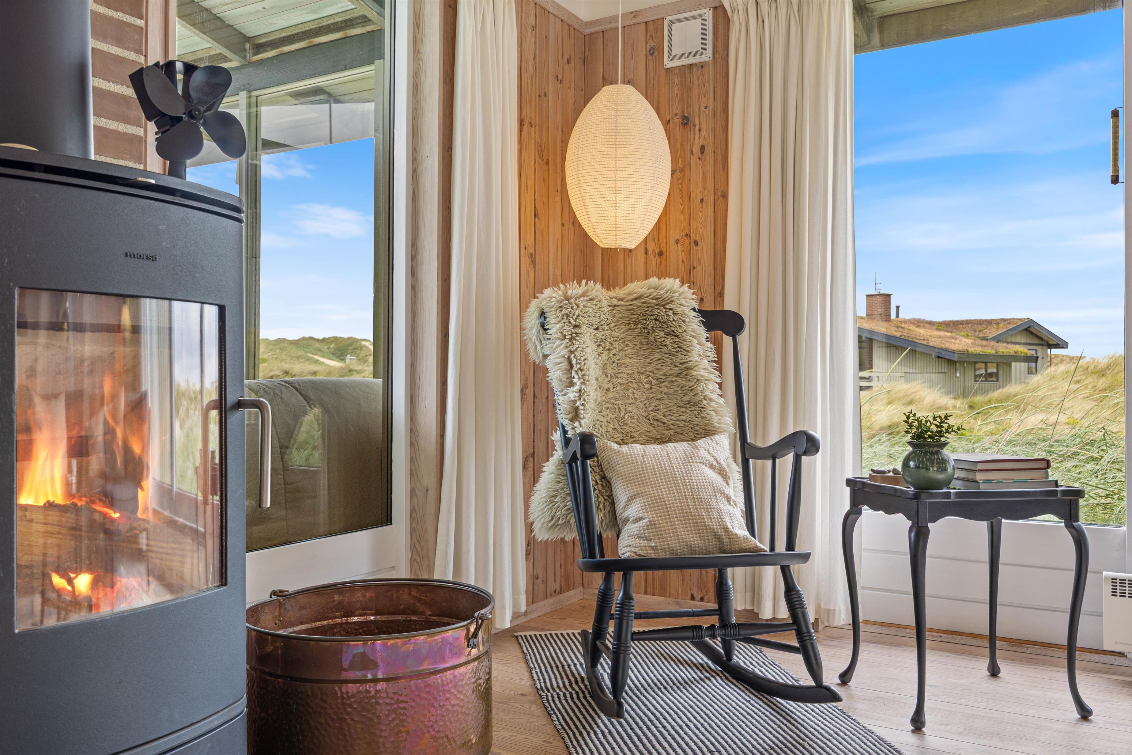 Når man træder ind i feriehuset, bliver man mødt af typisk sommerhusstemning, som understreges af de træbeklædte vægge. Opholdsstuen, der kombinerer køkken, spiseplads og stue, udgør feriehusets centrum. Her kan I lave god mad sammen, holde spilleaften, planlægge de næste aktiviteter i jeres ferie eller sætte jer godt til rette i sofaen til en filmaften. På regnfulde og kolde dage giver brændeovnen i opholdsstuen en hyggelig varme og en ekstra dosis komfort. Ud over brændeovnen er der også installeret en energibesparende luft-til-luft-varmepumpe i feriehuset for at sikre en behagelig temperatur i sommerhuset.