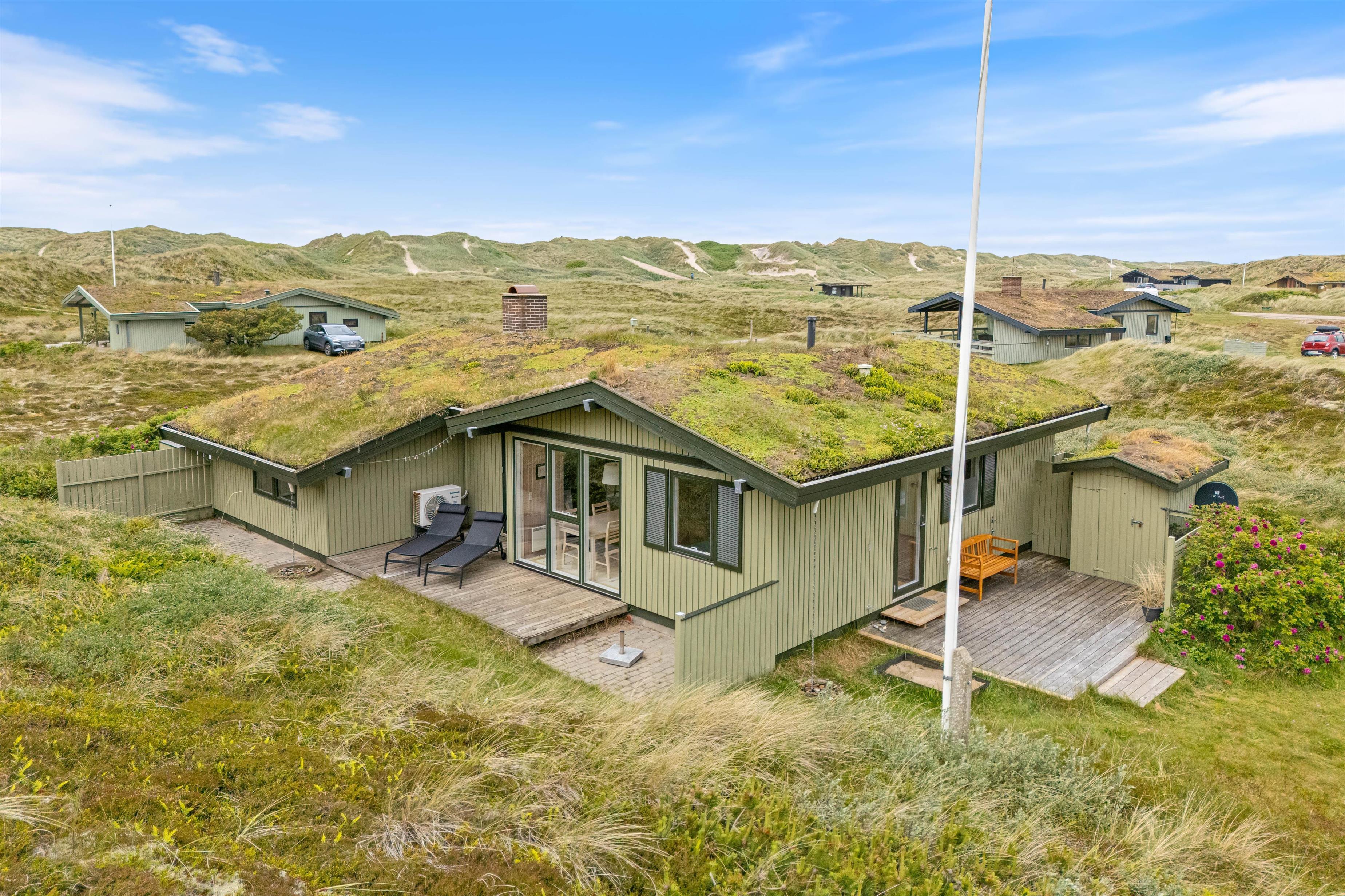 Feriehuset på Sortebærdalen 61 ligger på en stor klit- og naturgrund i klitterne. Børn har masser af plads til at udforske området, så mens de udforsker område kan I hygge jer på terrassen med en kold drink. For at give jer endnu mere plads på terrassen, kan I åbne en del af udestuen op og sidde i læ for vinden.
