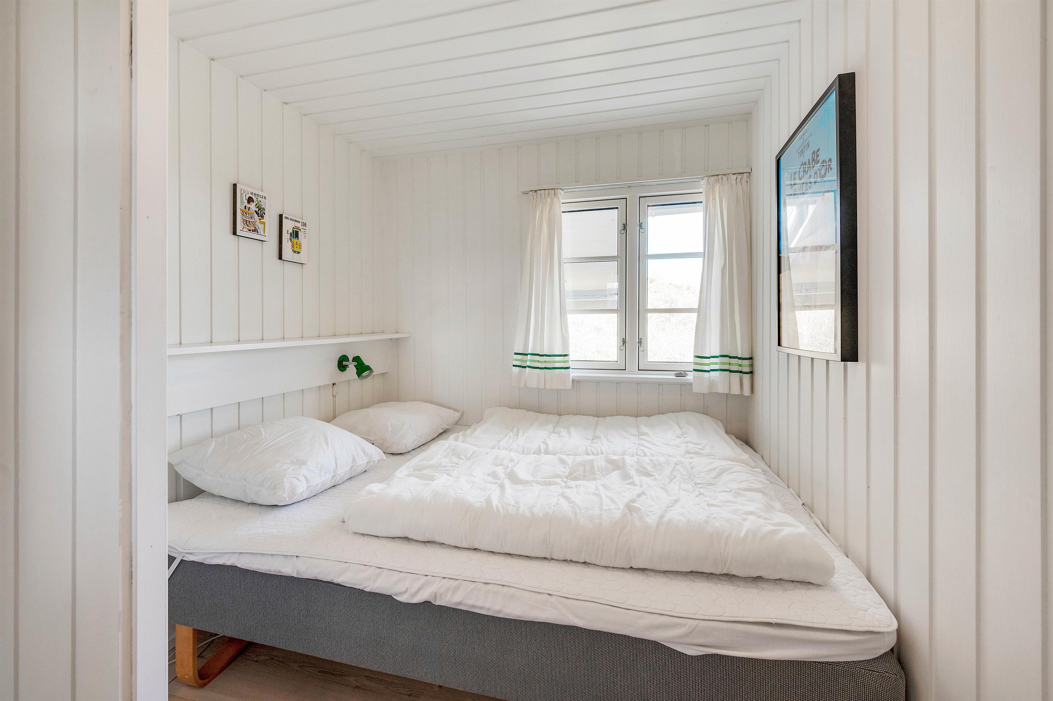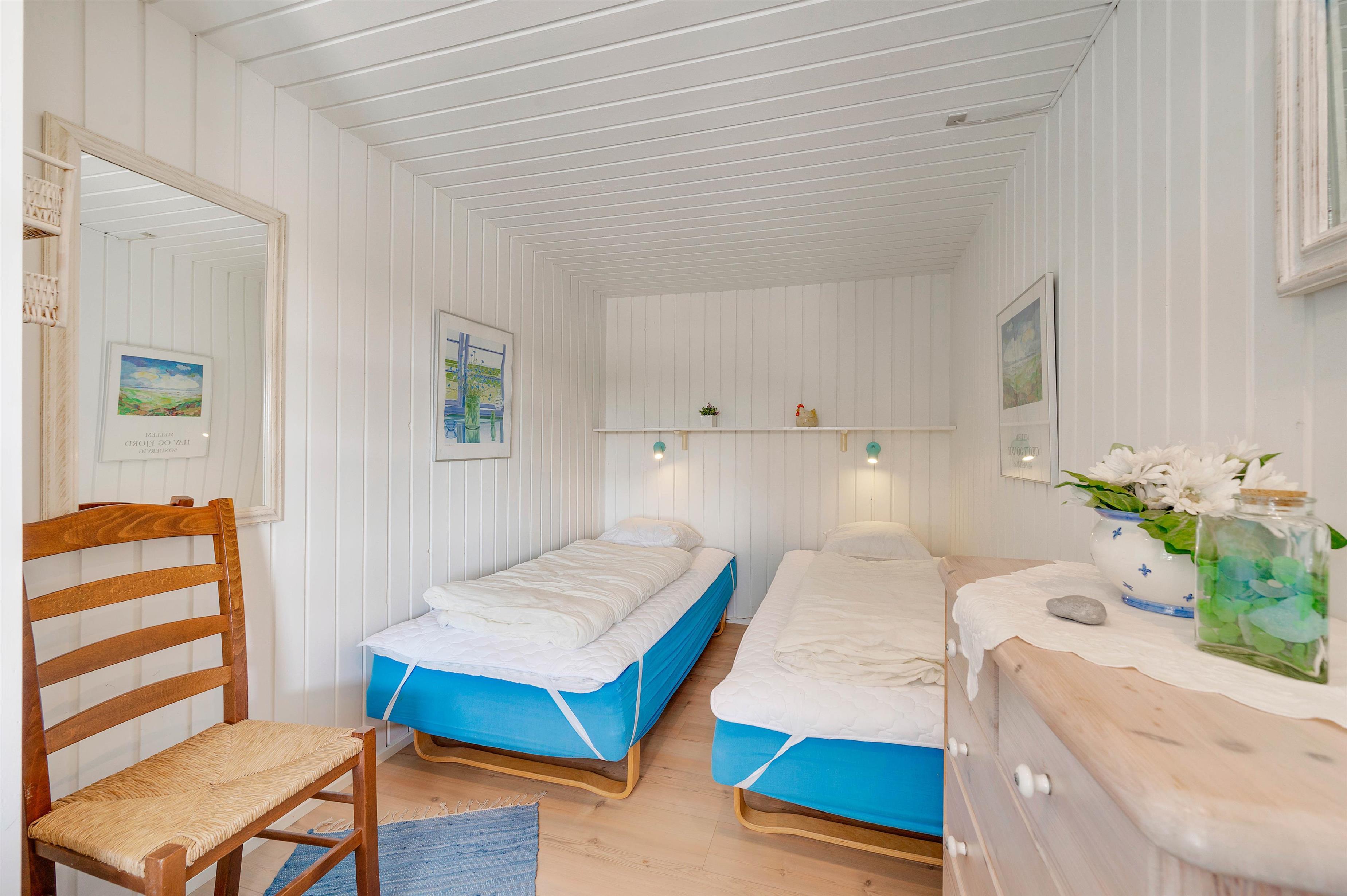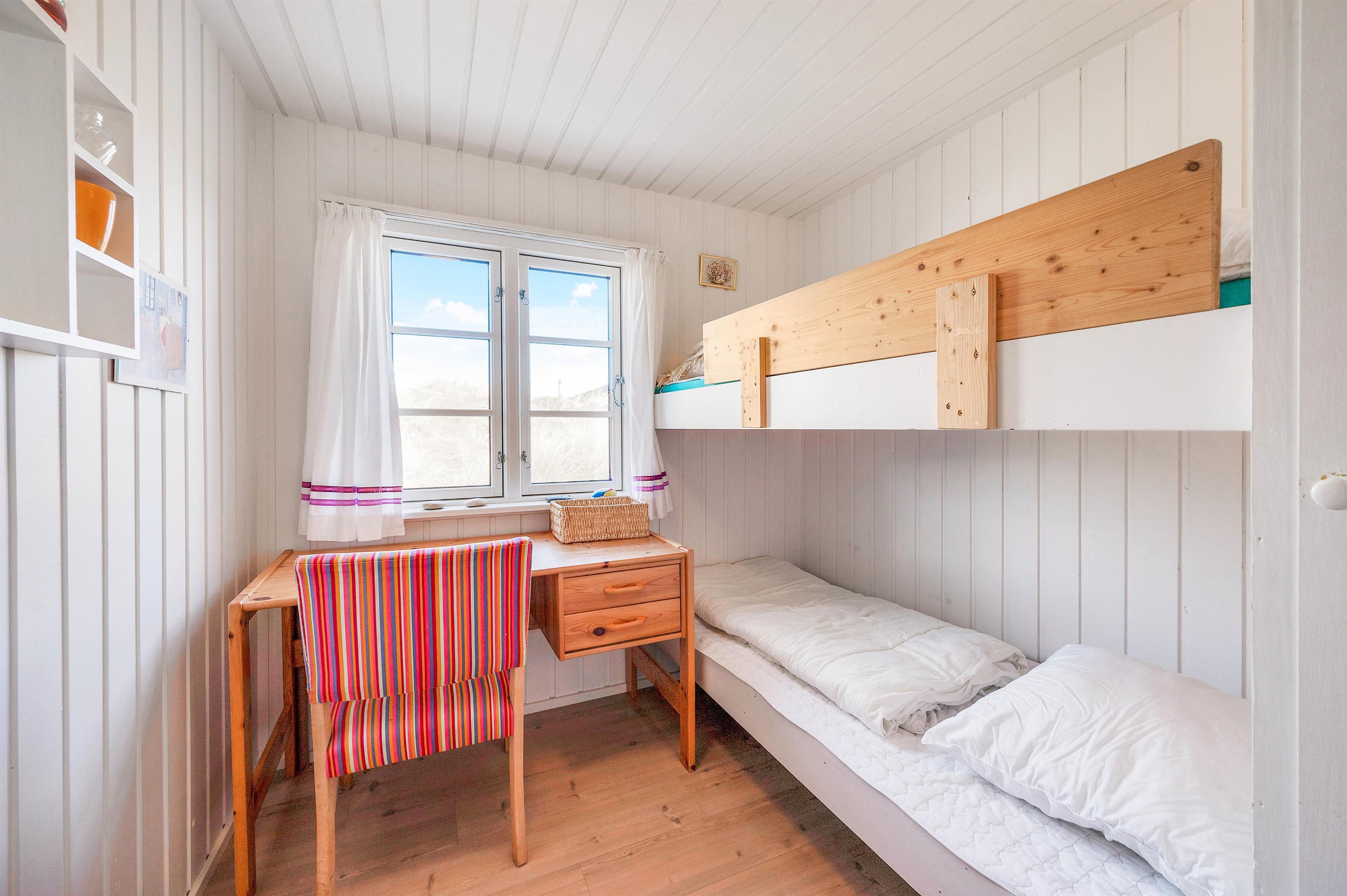 Sommerhuset er indrettet med 3 gode værelser, hvoraf 1 værelse er udstyret med en komfortabel dobbeltseng. De resterende 2 værelser har henholdsvis 2 enkeltsenge og køjeseng med 2 pladser. Herudover er der et praktisk badeværelse med bruseniche og flisegulv. Feriehusets varmtvandsbeholder er på 30 Liter.