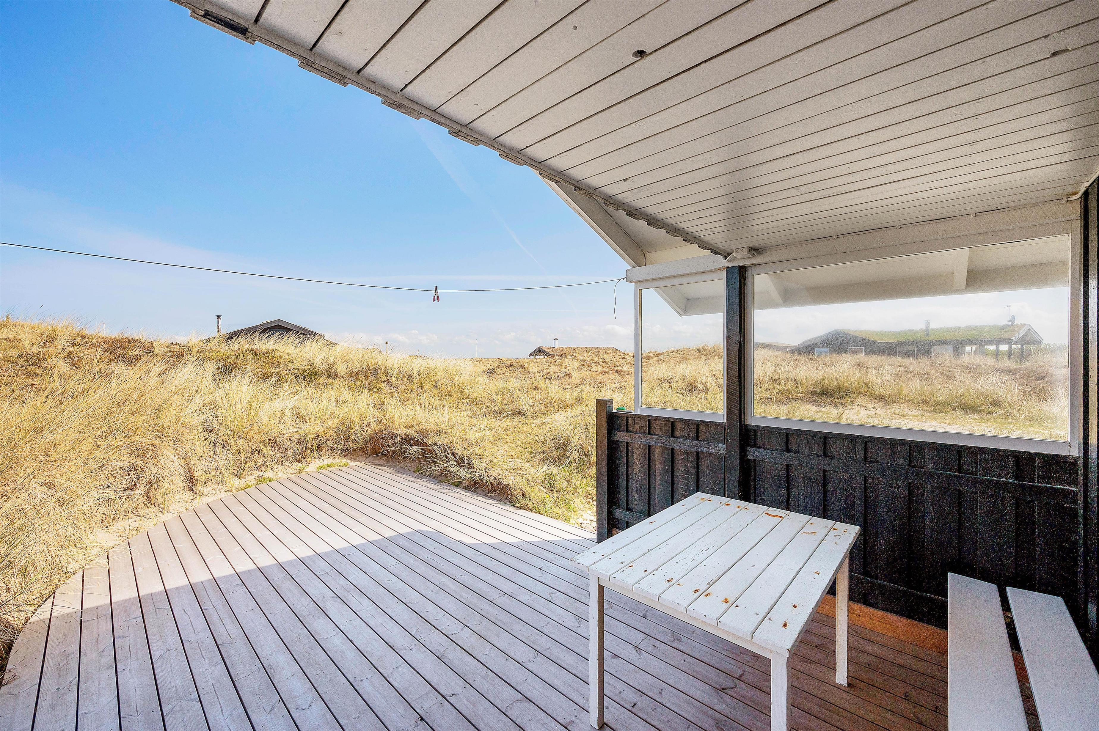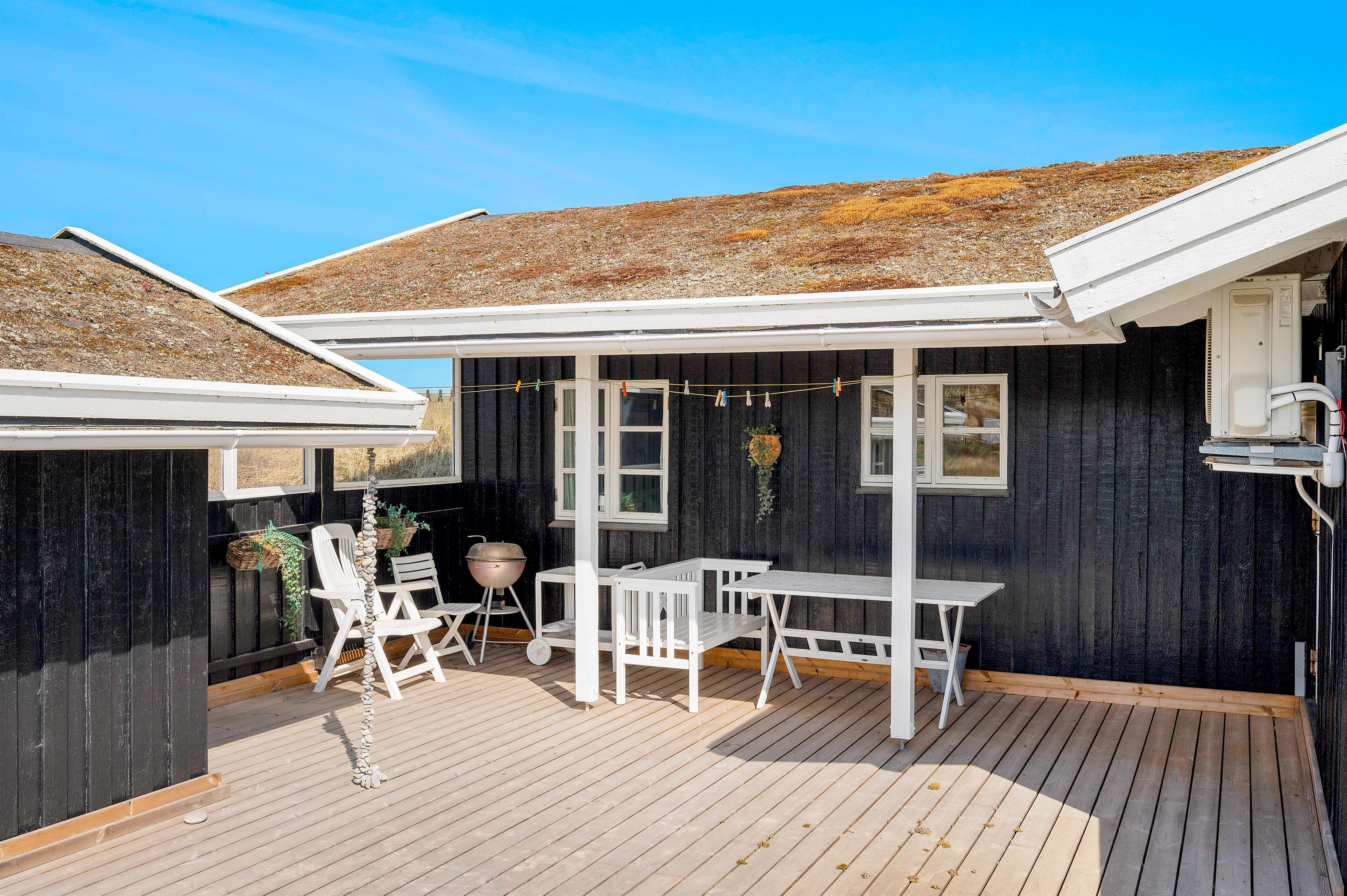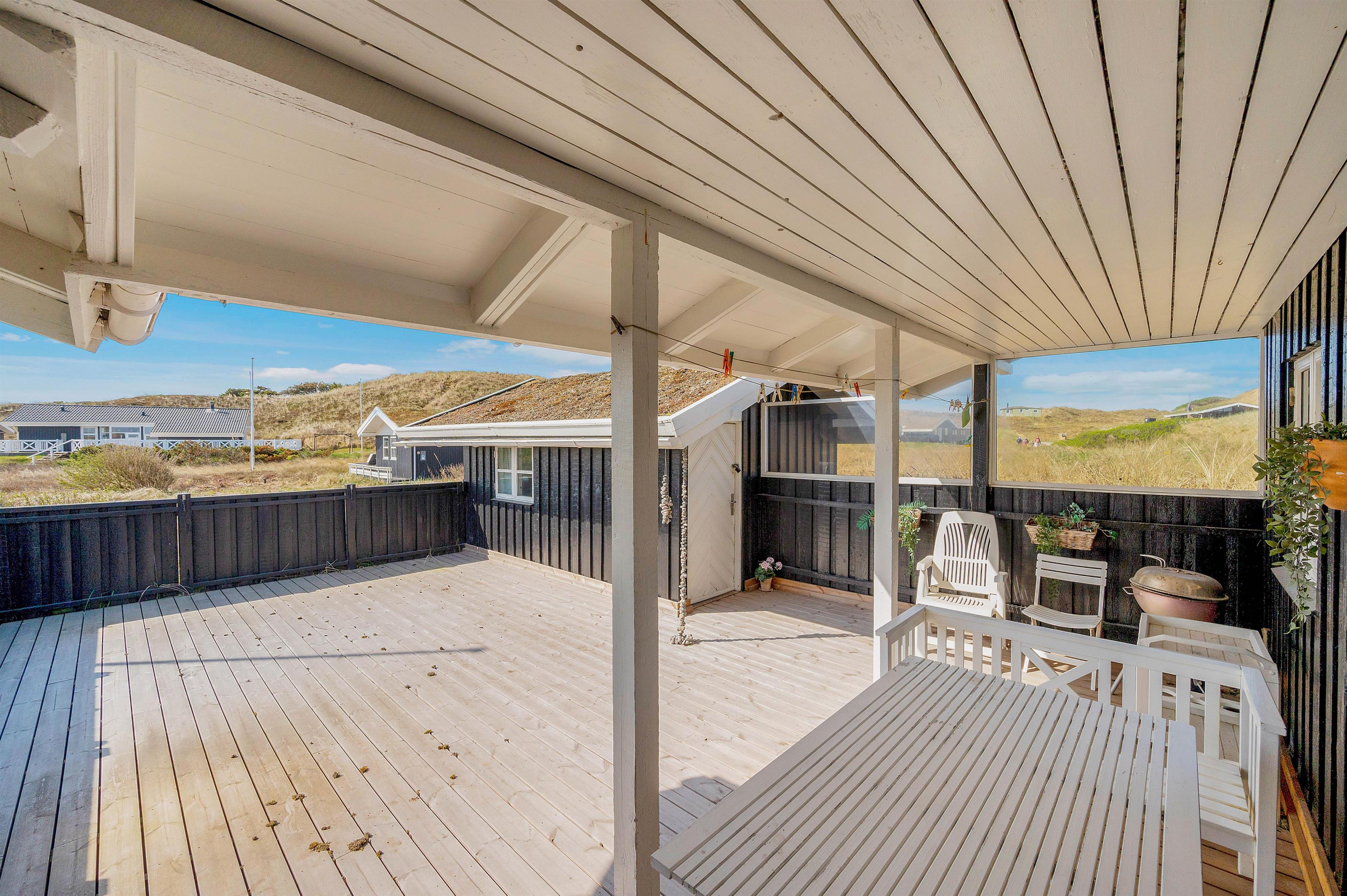 På den store lukkede og delvist overdækkende sydvendte terrasse kan I nyde den friske salte luft fra Vesterhavet i fuldkommen uforstyrrethed. Bag feriehuset finder I også en dejlig hyggekrog, der ligger i læ på den nordvendte terrasse. I har derfor gode muligheder for at følge solens livgivende stråler i løbet af dagen, mens I om aftenen kan tilberede jeres aftensmad på sommerhusets grill og nyde en kold forfriskning i aftensolen.