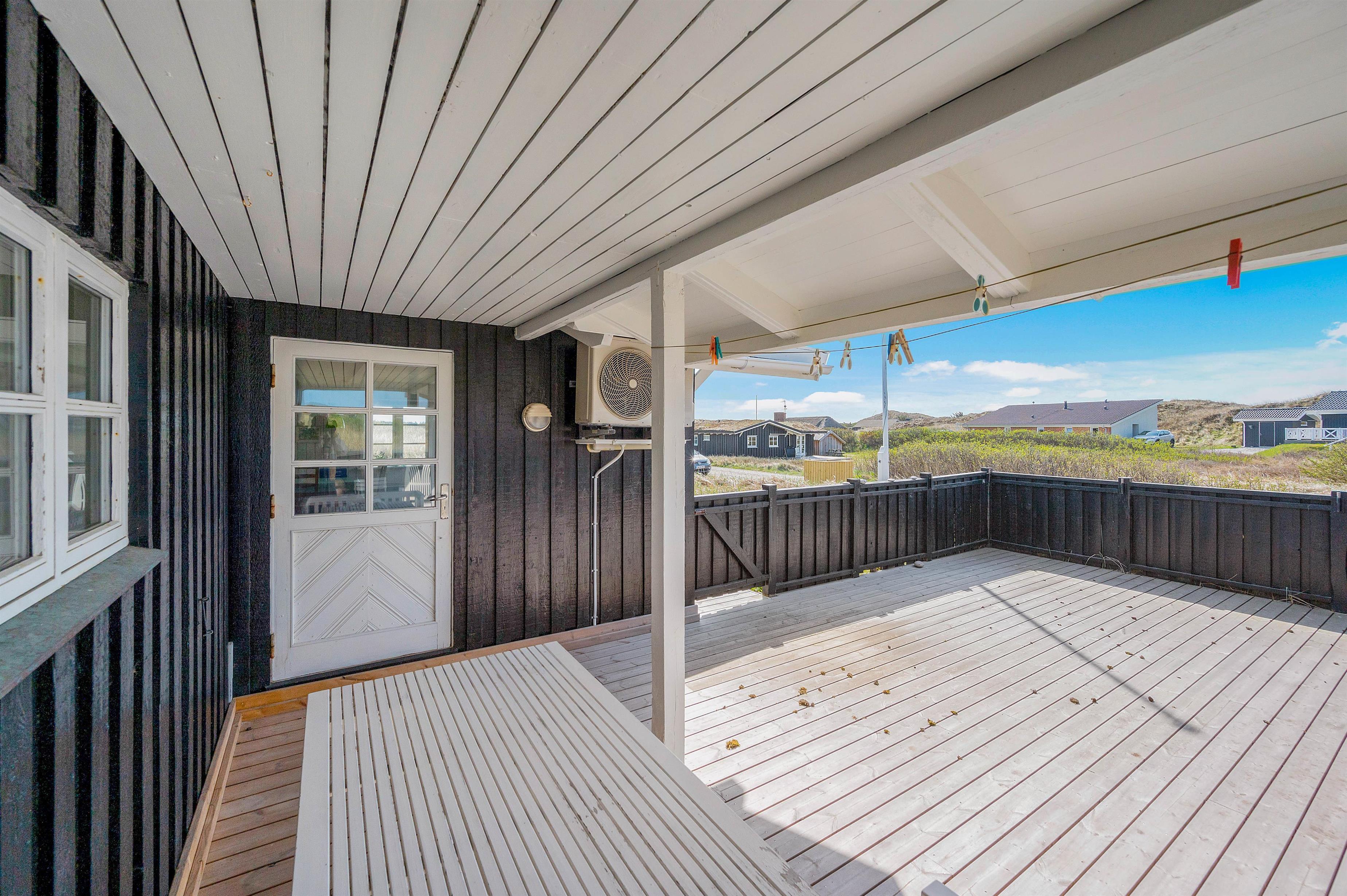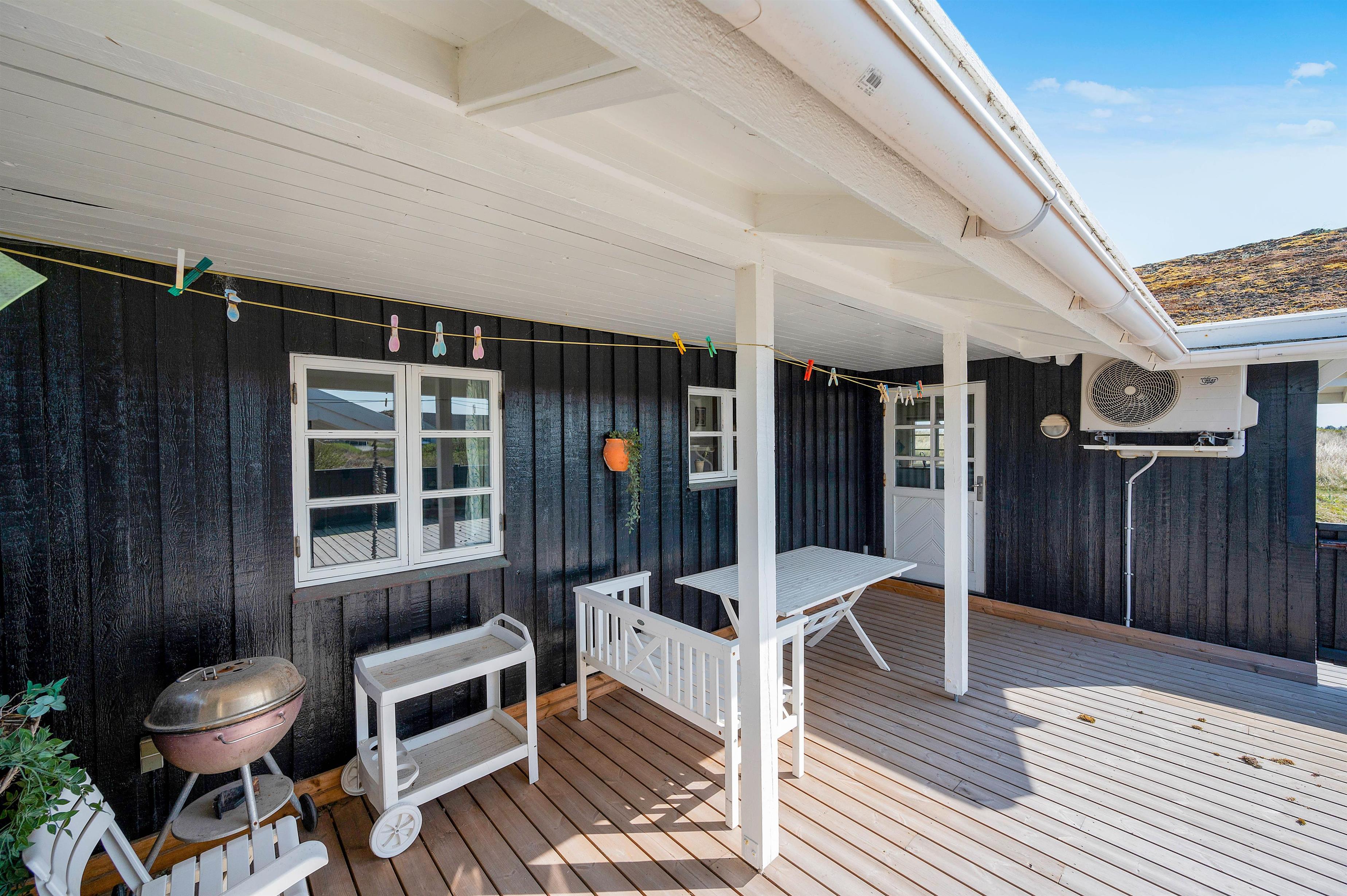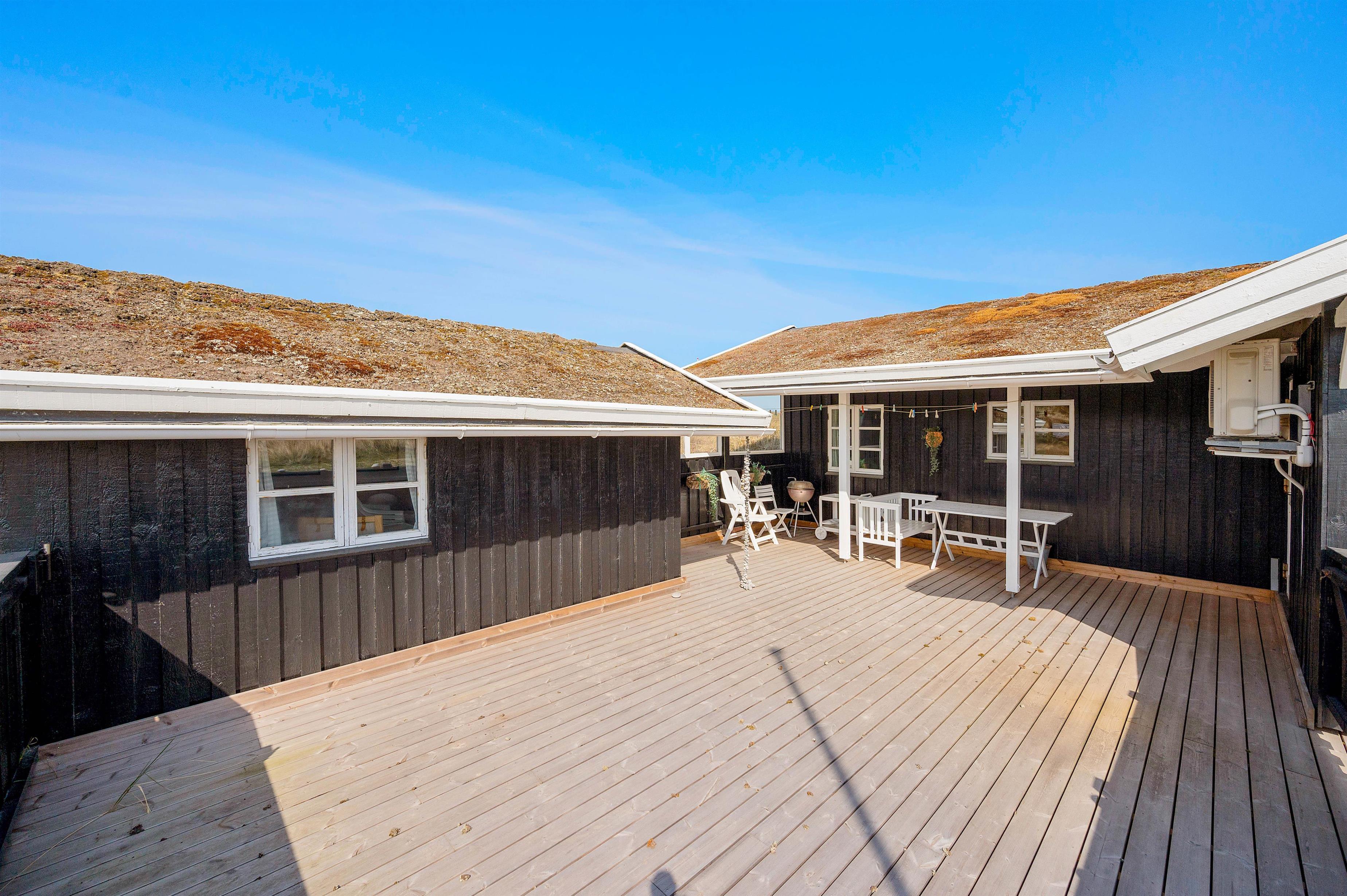 På den store lukkede og delvist overdækkende sydvendte terrasse kan I nyde den friske salte luft fra Vesterhavet i fuldkommen uforstyrrethed. Bag feriehuset finder I også en dejlig hyggekrog, der ligger i læ på den nordvendte terrasse. I har derfor gode muligheder for at følge solens livgivende stråler i løbet af dagen, mens I om aftenen kan tilberede jeres aftensmad på sommerhusets grill og nyde en kold forfriskning i aftensolen.