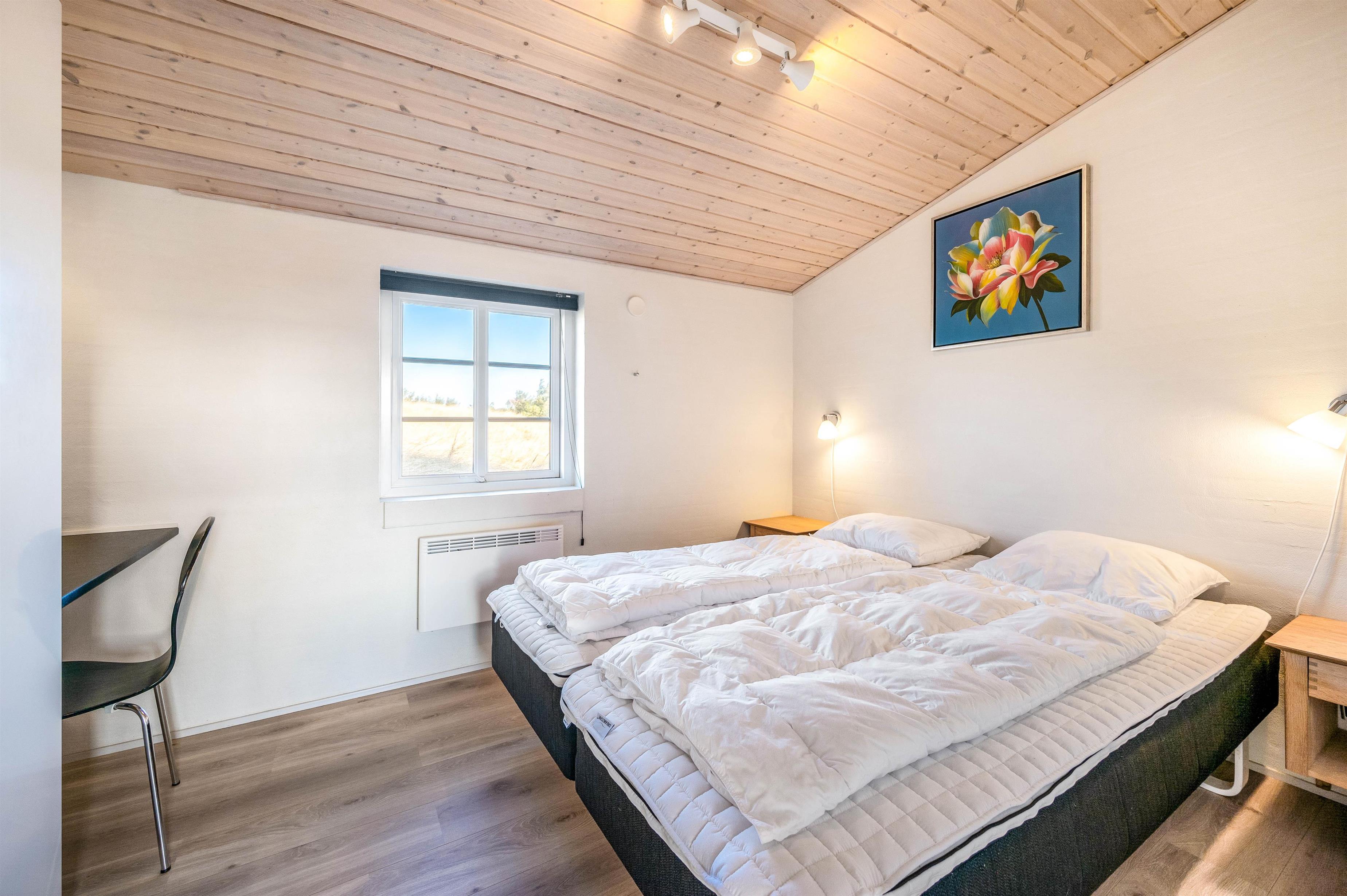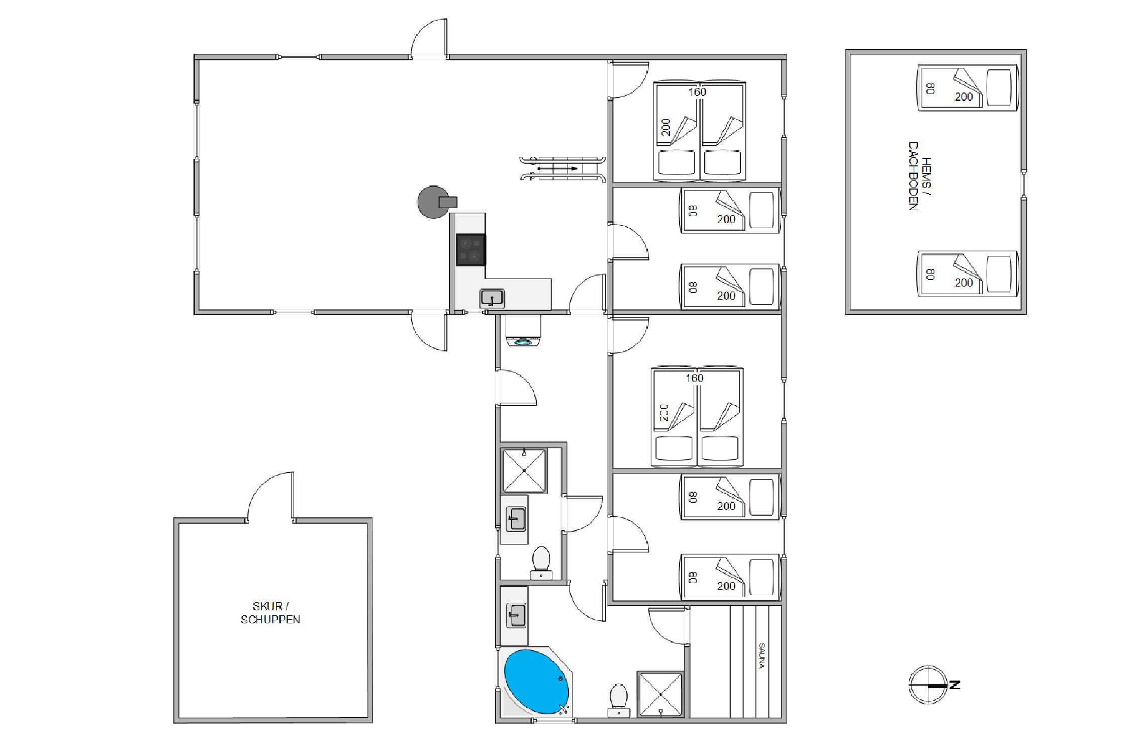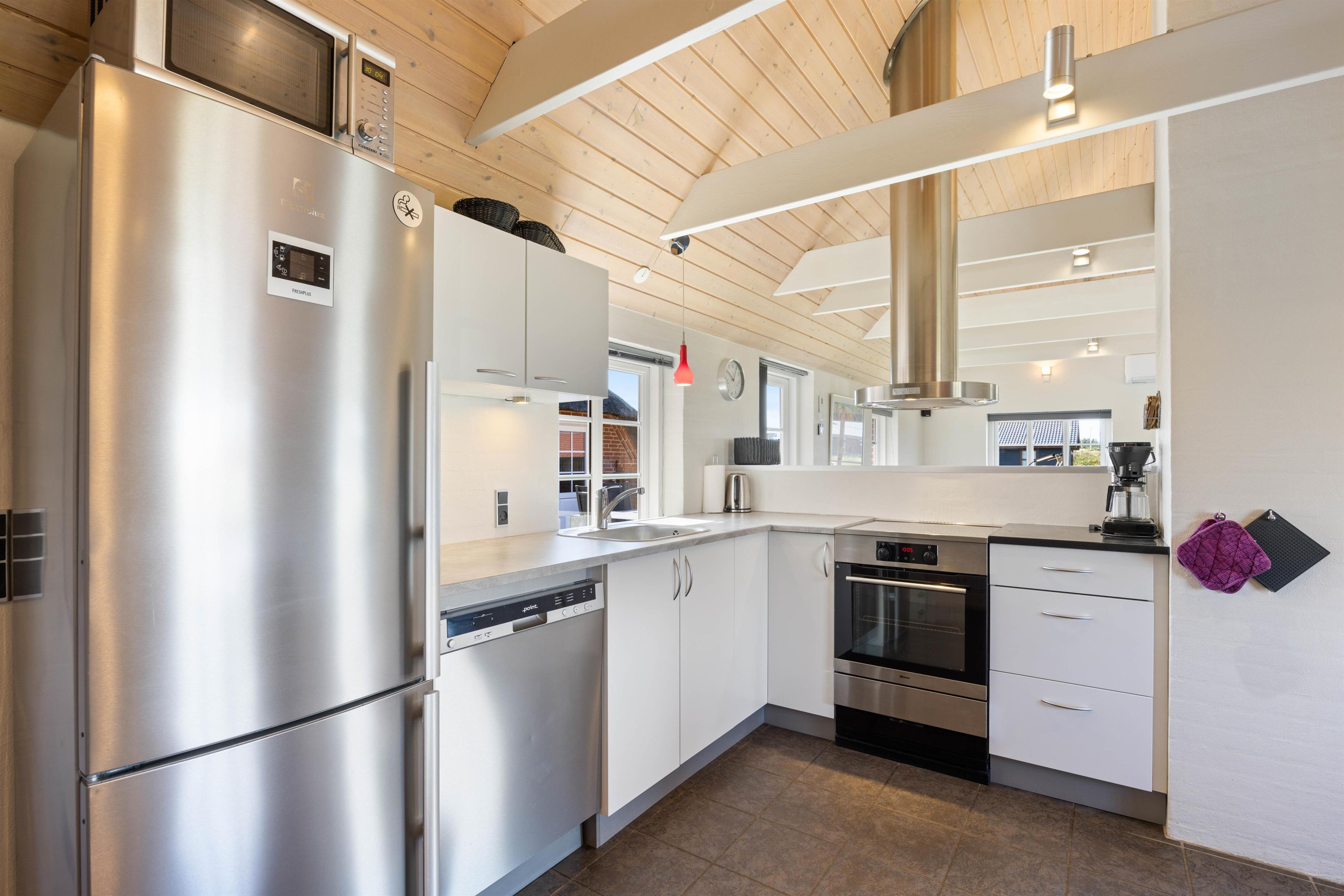 Loftet til kip bidrager til den store rummelighed i huset, der bliver udnyttet til fulde med en praktisk hems. På hemsen finder I 2 gode sengepladser, som der utvivlsomt vil være rift om blandt børnene. Hemsen får I adgang til fra en stige i stuen. Herudover er der yderligere 6 sovepladser fordelt på 3 værelser. Køkkenafdelingen er veludstyret med blandt andet mikroovn, opvaskemaskine og køleskab med en fryser på 90 liter.